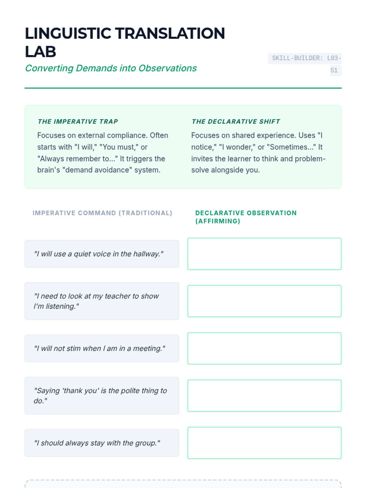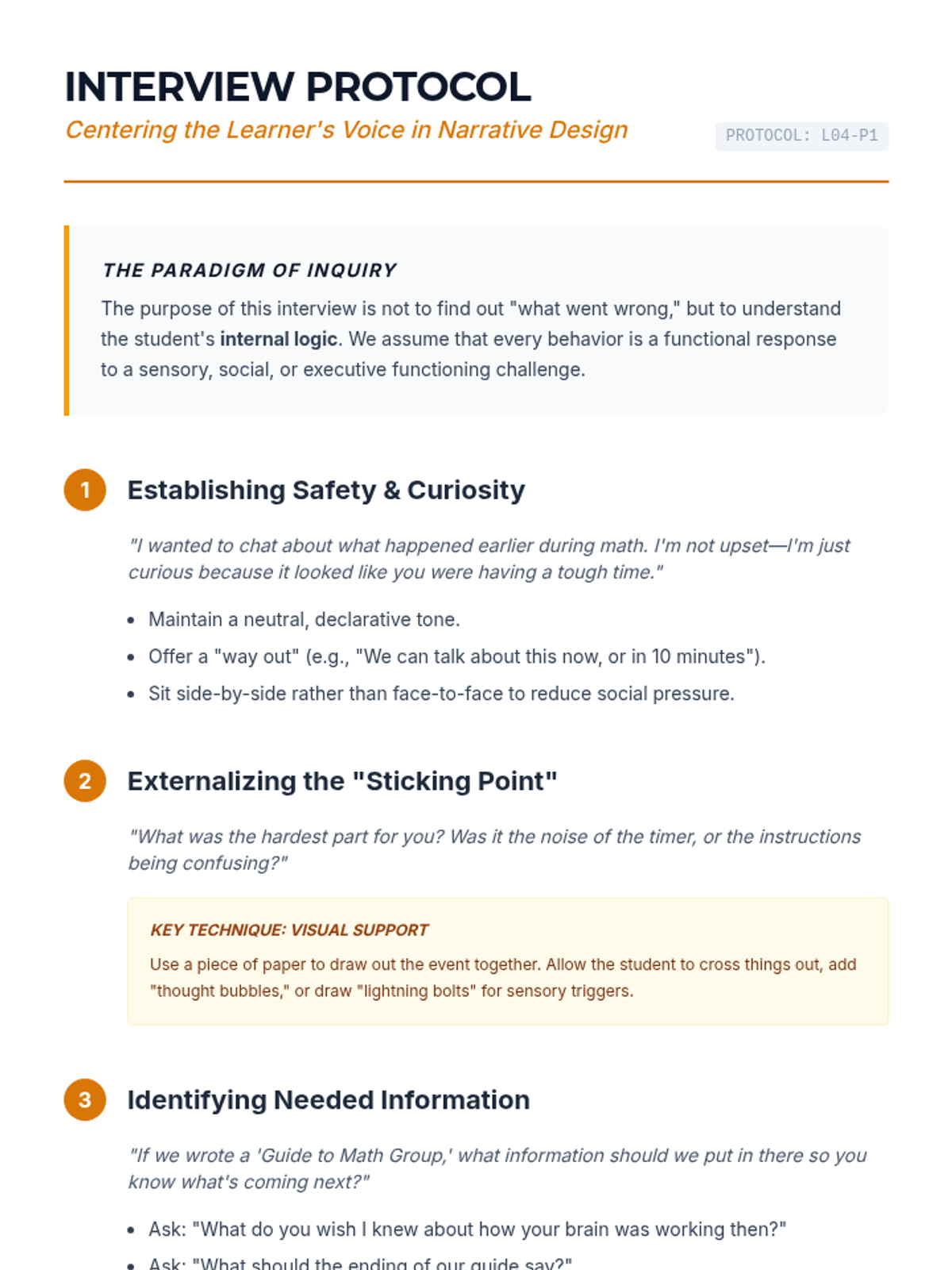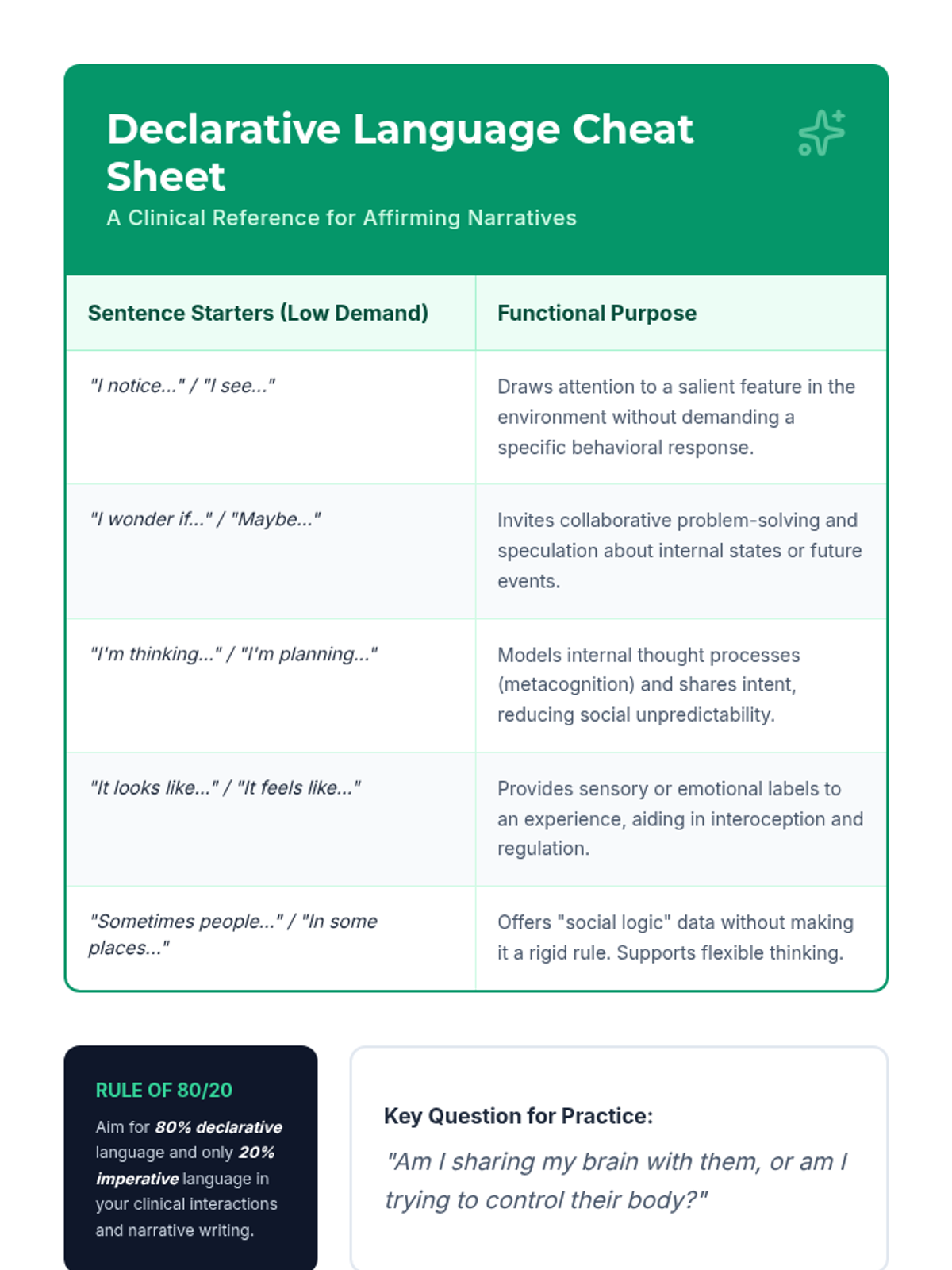 This graduate-level sequence critiques traditional Social Story interventions through the lens of the neurodiversity movement, focusing on ethical adaptation, declarative language, and the Double Empathy Problem. Students move from critical theory to clinical application, learning to co-create narratives that affirm autistic identity rather than enforcing compliance.