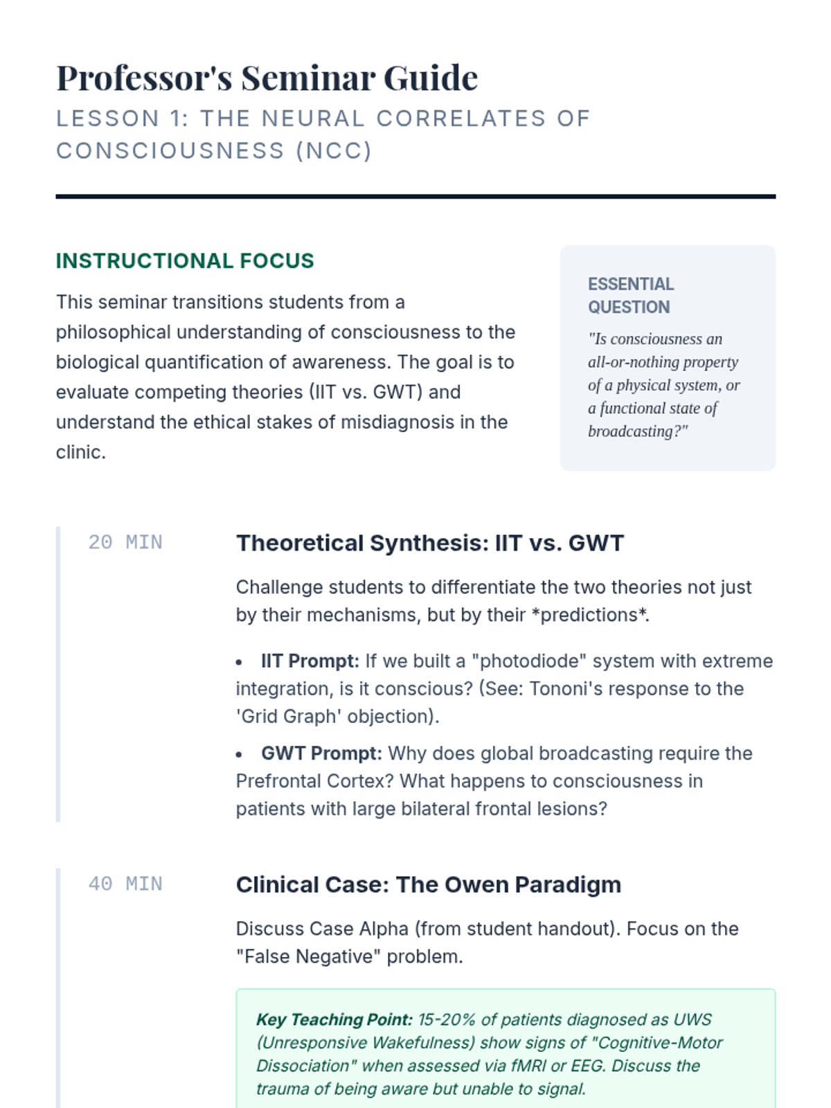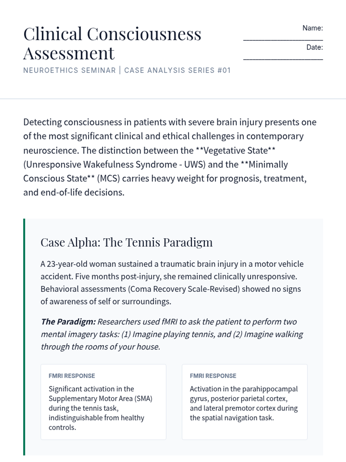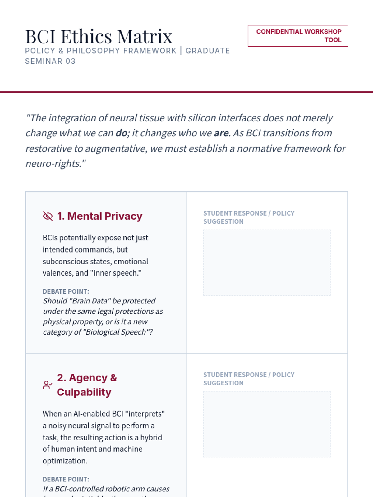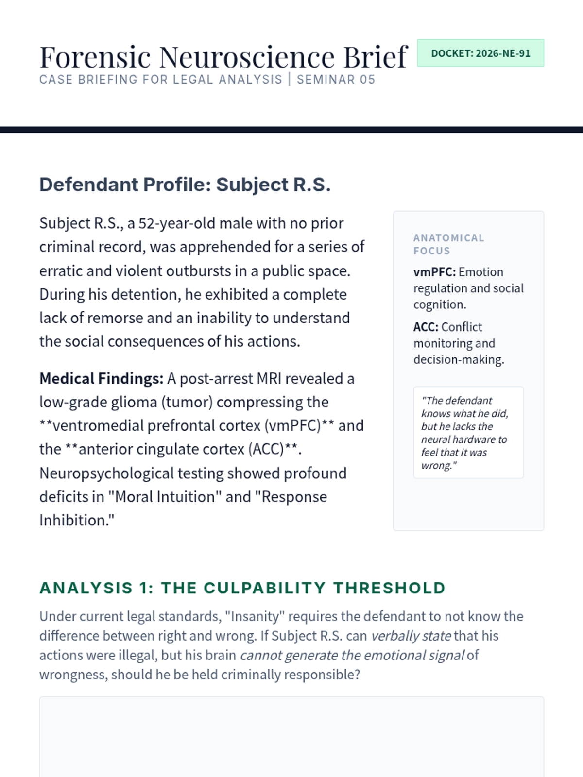 A graduate-level exploration of the intersection between neuroscience, philosophy, and technology. This sequence covers the biological basis of consciousness, the ethical implications of brain-computer interfaces, and the role of neurobiology in legal culpability.