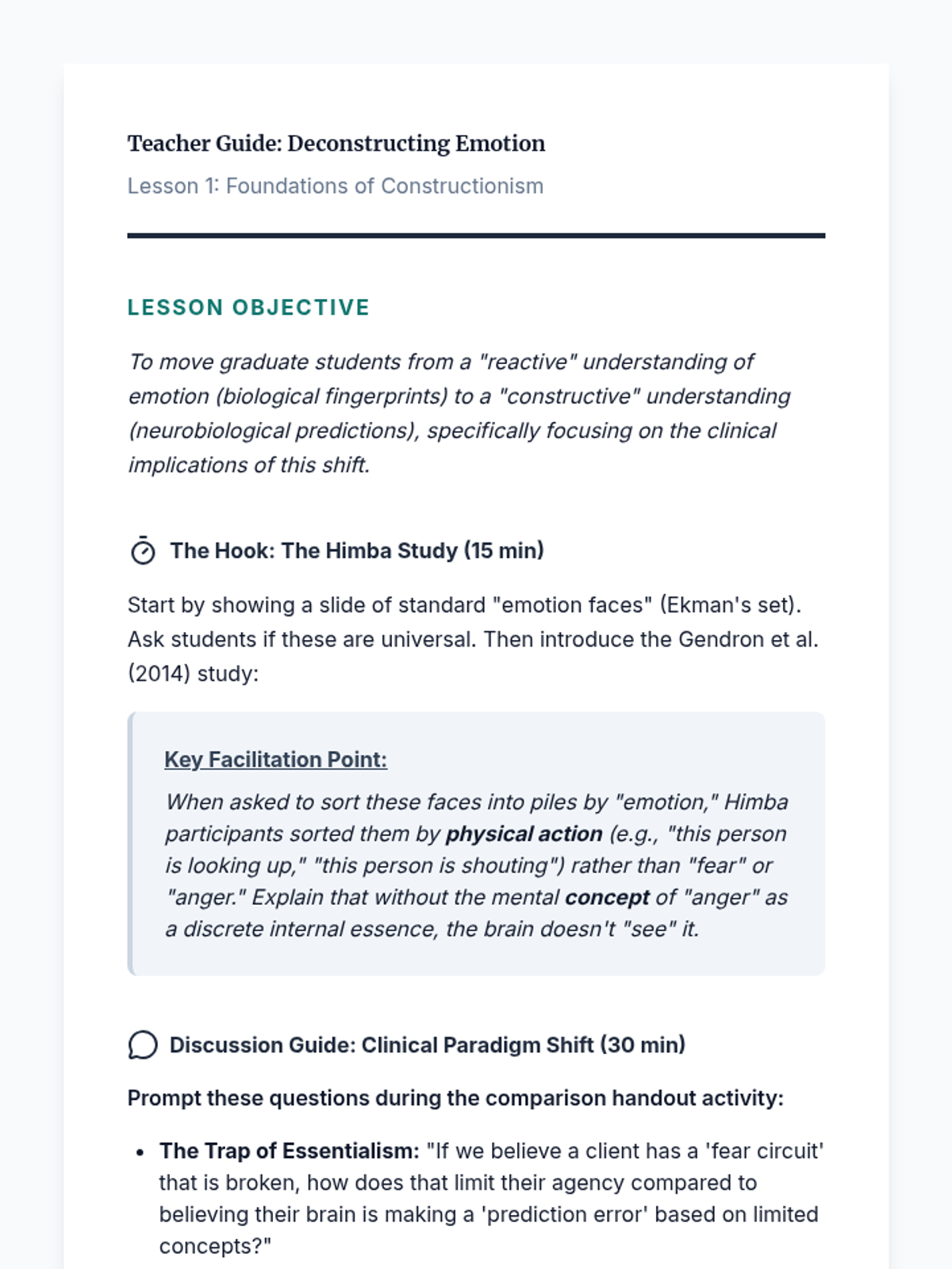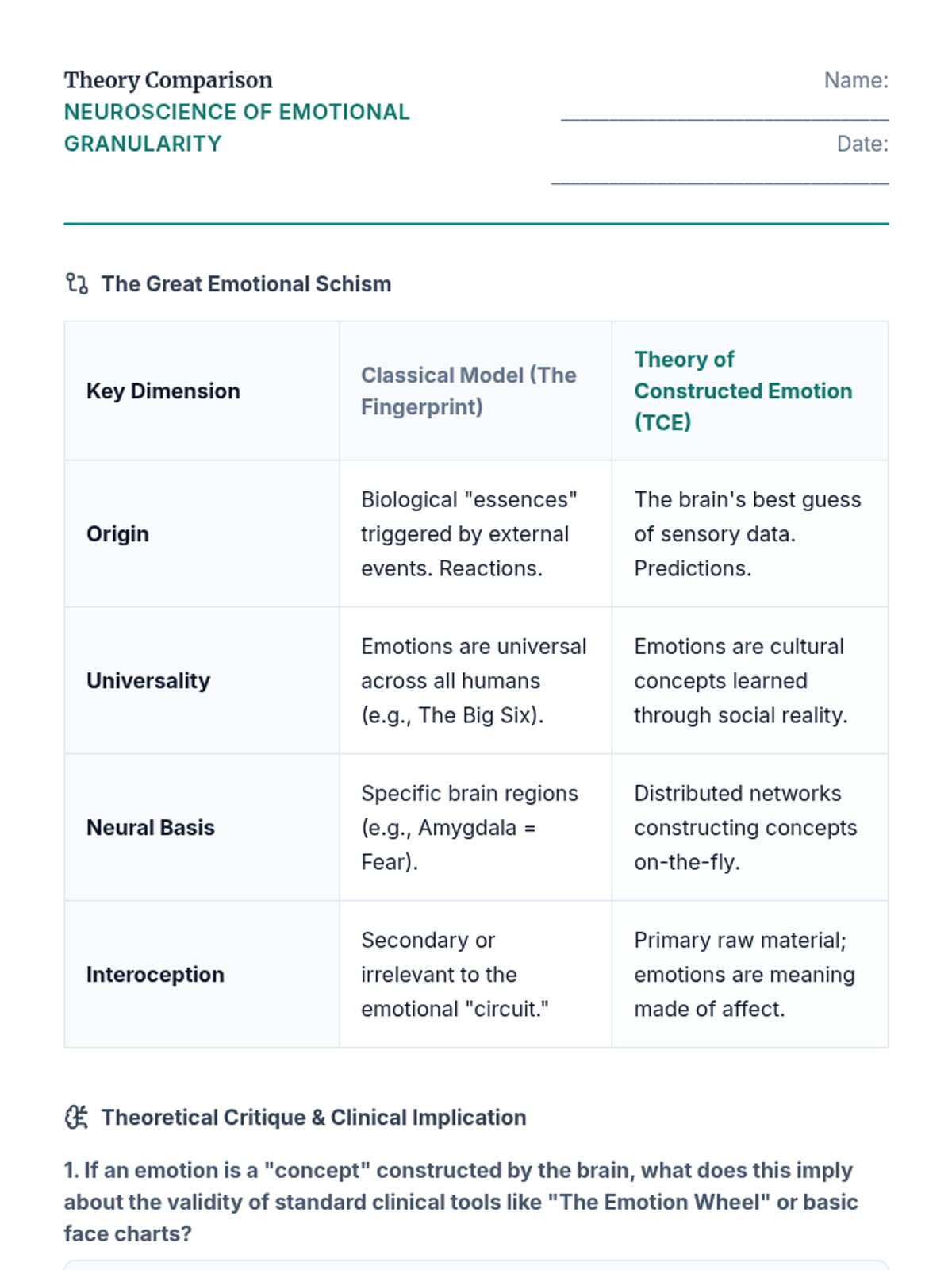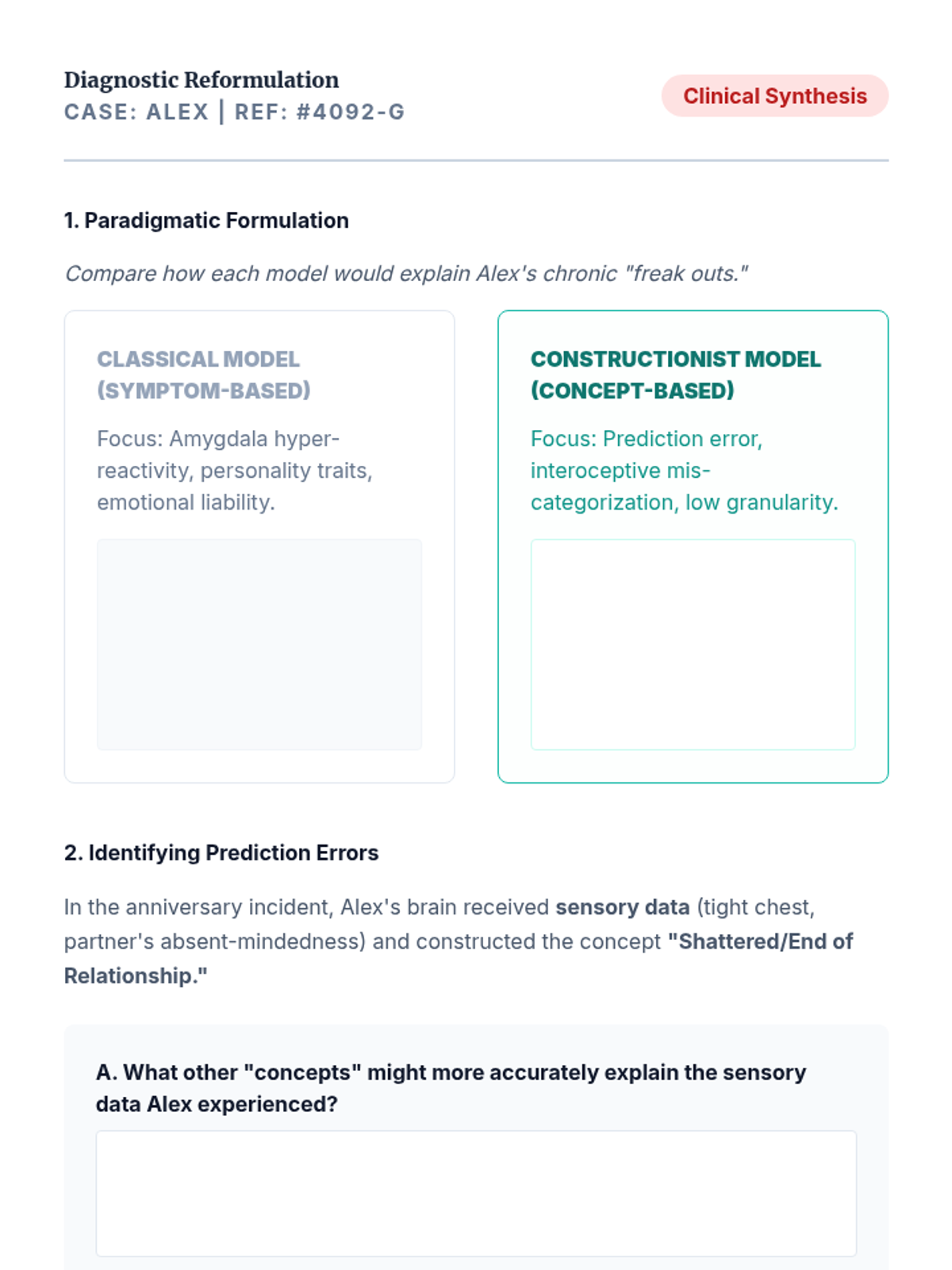 A graduate-level exploration of the Theory of Constructed Emotion, focusing on how emotional granularity acts as a neurological tool for self-regulation and therapeutic intervention. Students move from neuroscientific theory to clinical application, learning to help clients dismantle 'prediction errors' through complex emotion labeling.