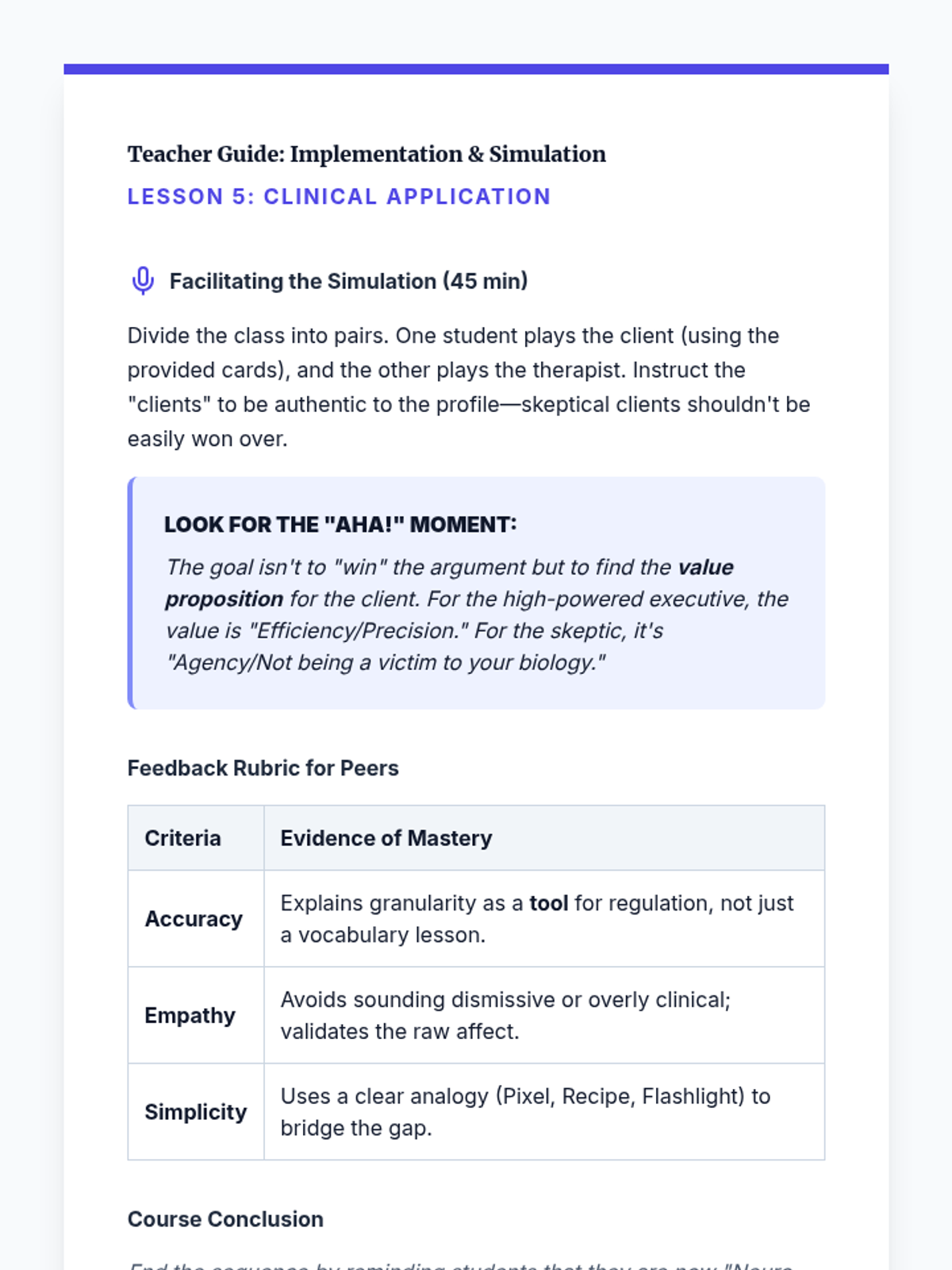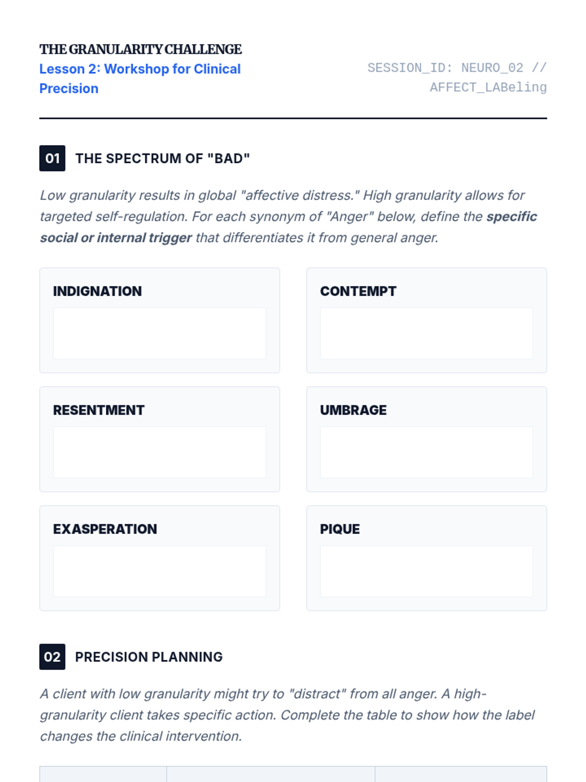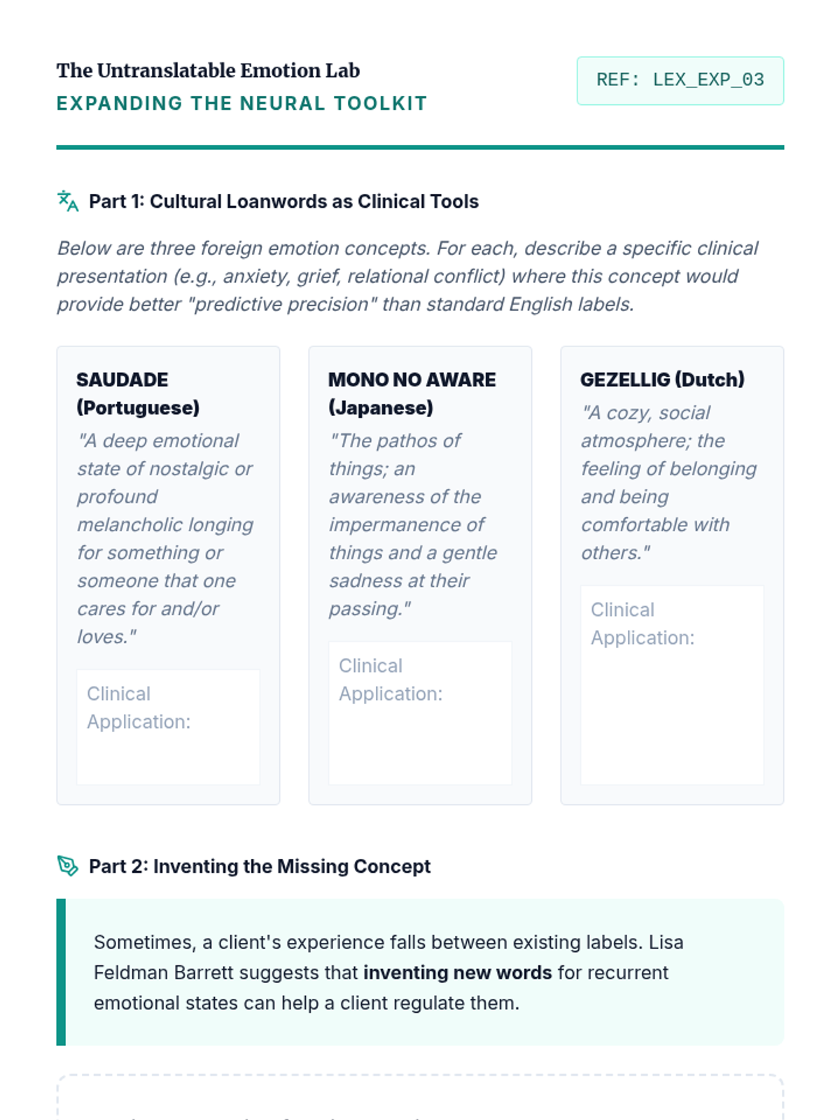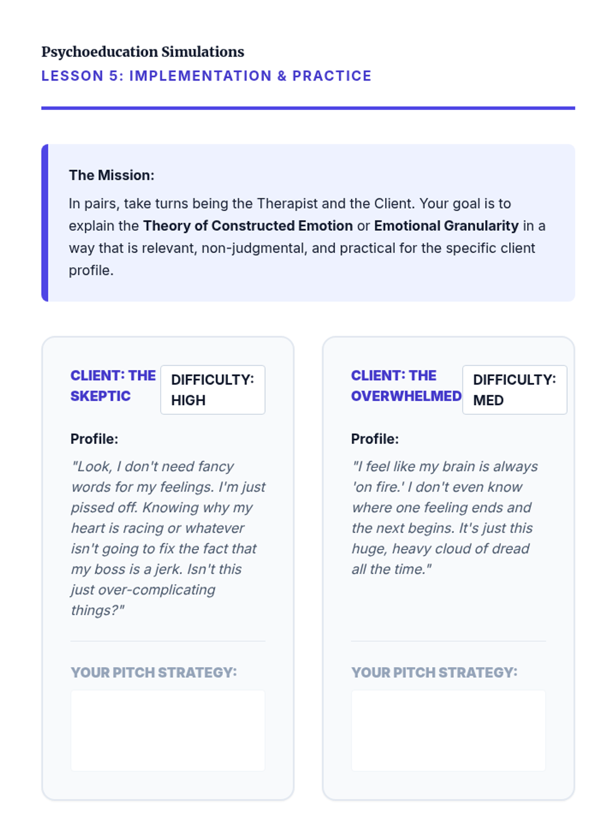 A graduate-level exploration of the Theory of Constructed Emotion, focusing on how emotional granularity acts as a neurological tool for self-regulation and therapeutic intervention. Students move from neuroscientific theory to clinical application, learning to help clients dismantle 'prediction errors' through complex emotion labeling.