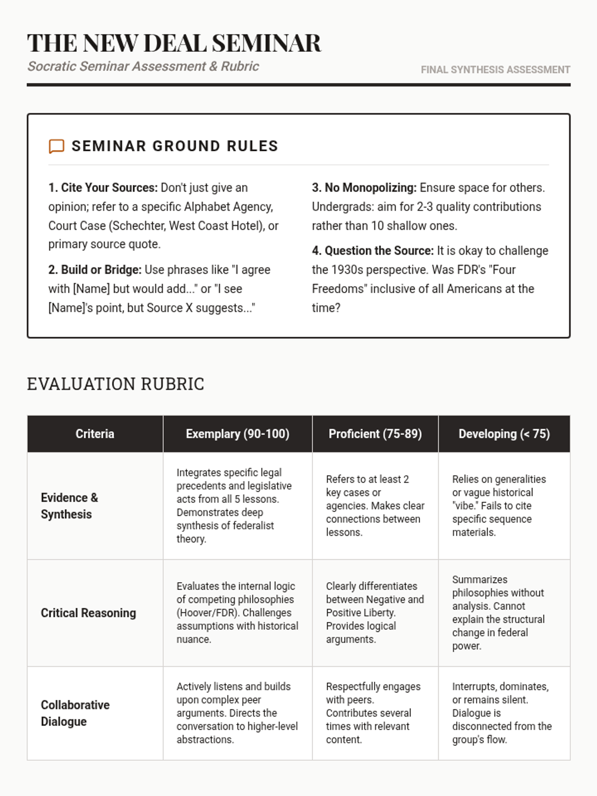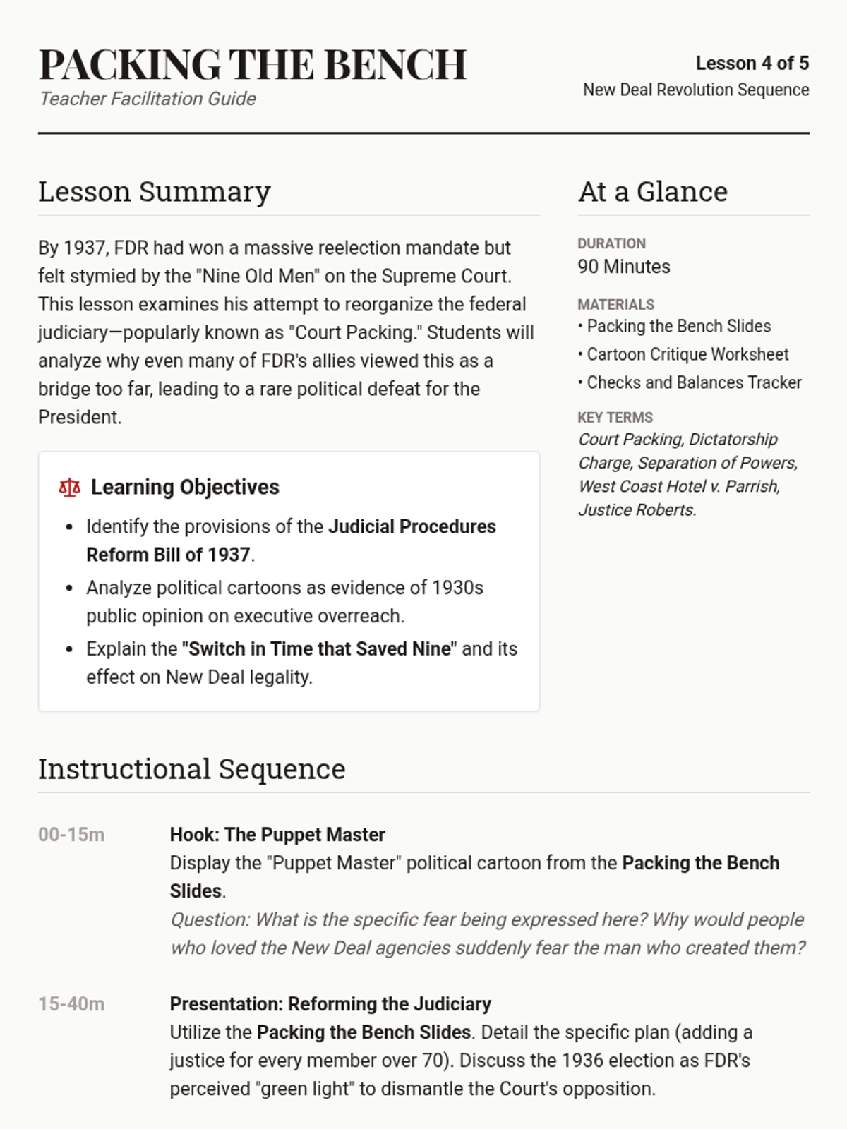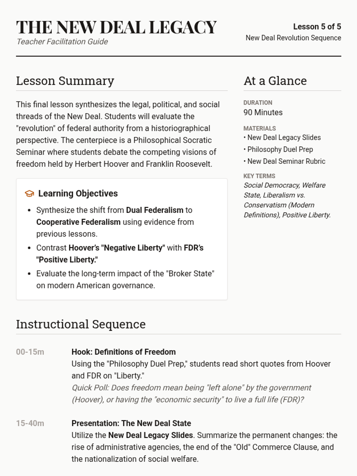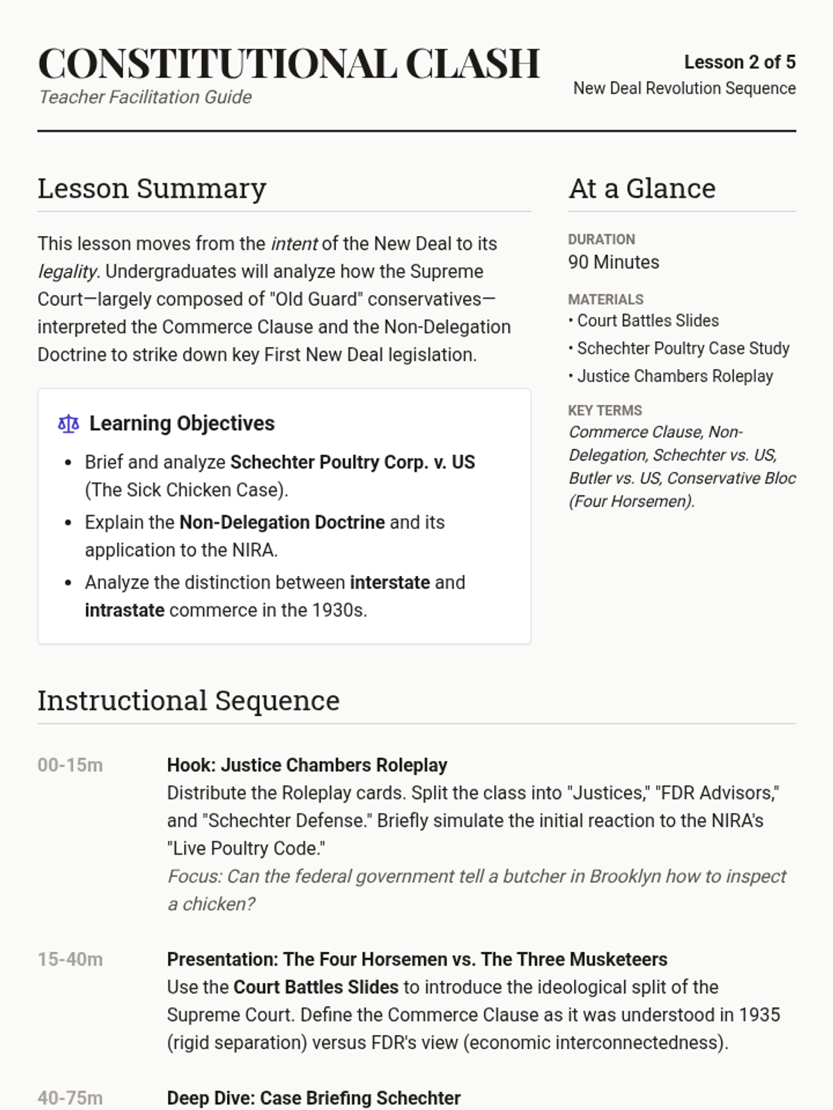 A comprehensive 5-lesson sequence for undergraduate students examining the political, legal, and social transformation of the United States during the New Deal era. Students analyze the shift from dual federalism to cooperative federalism and evaluate the changing relationship between the citizen and the federal government.