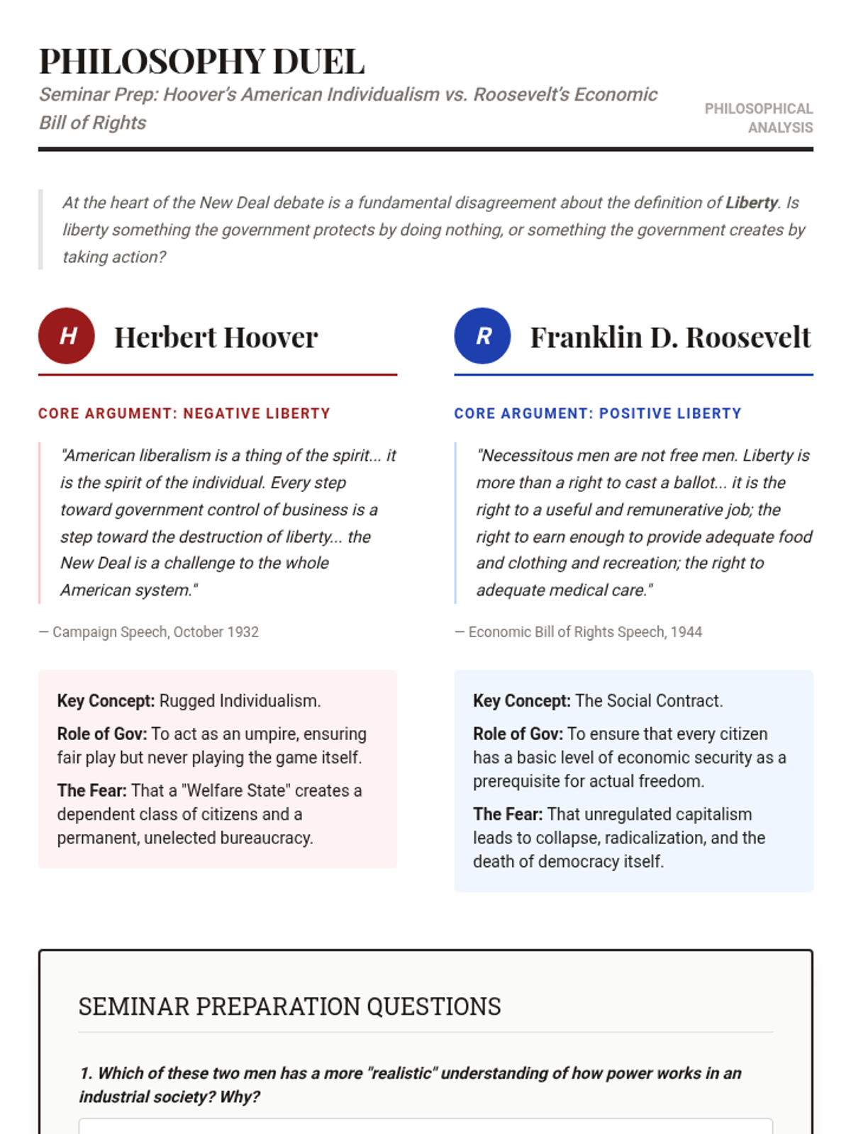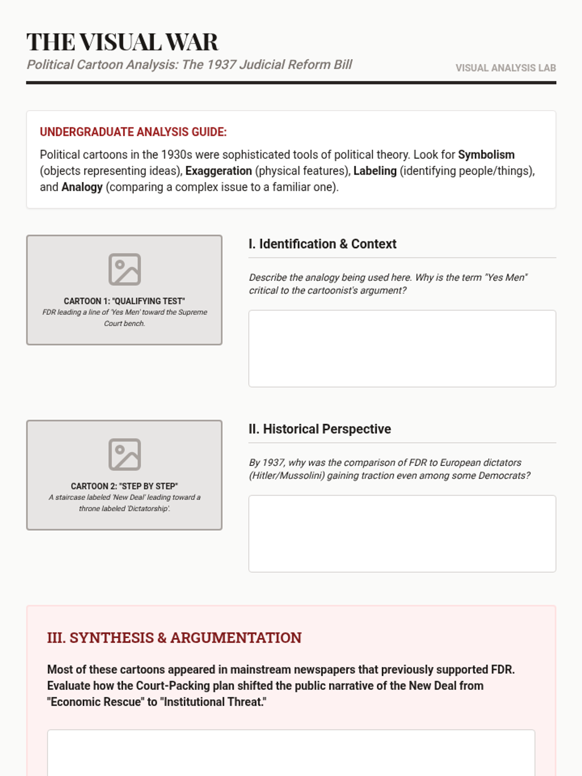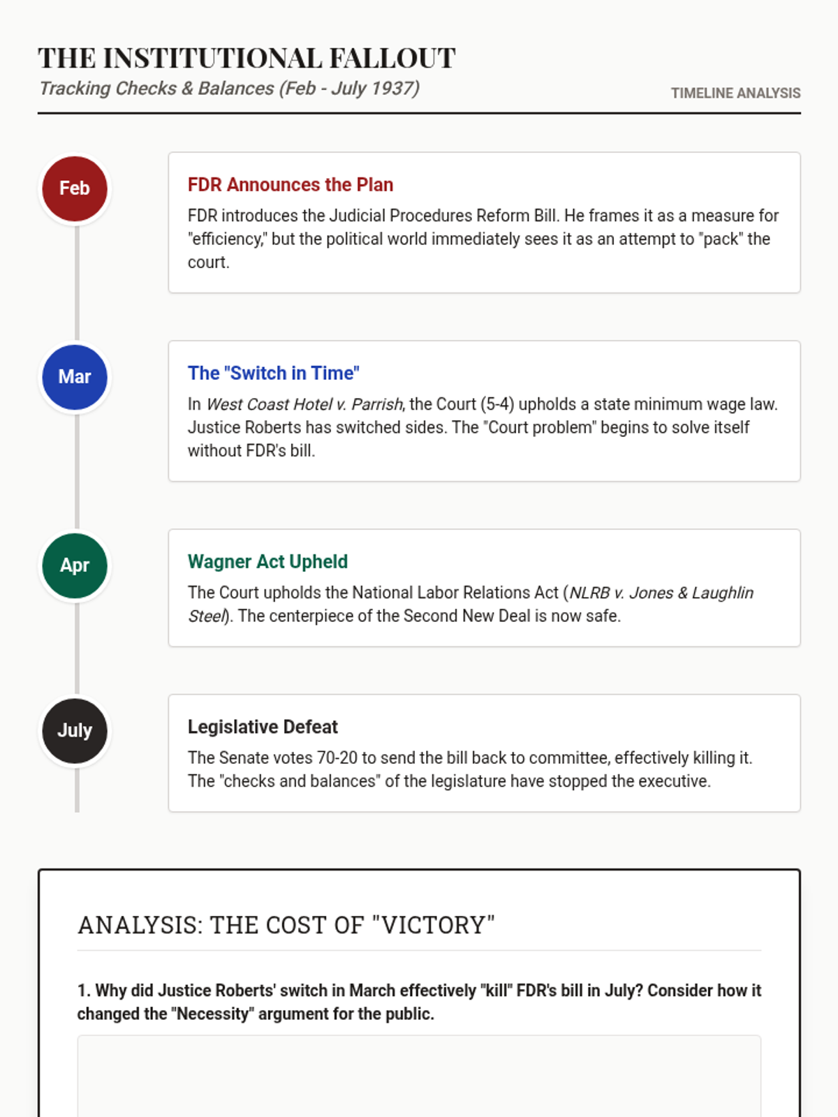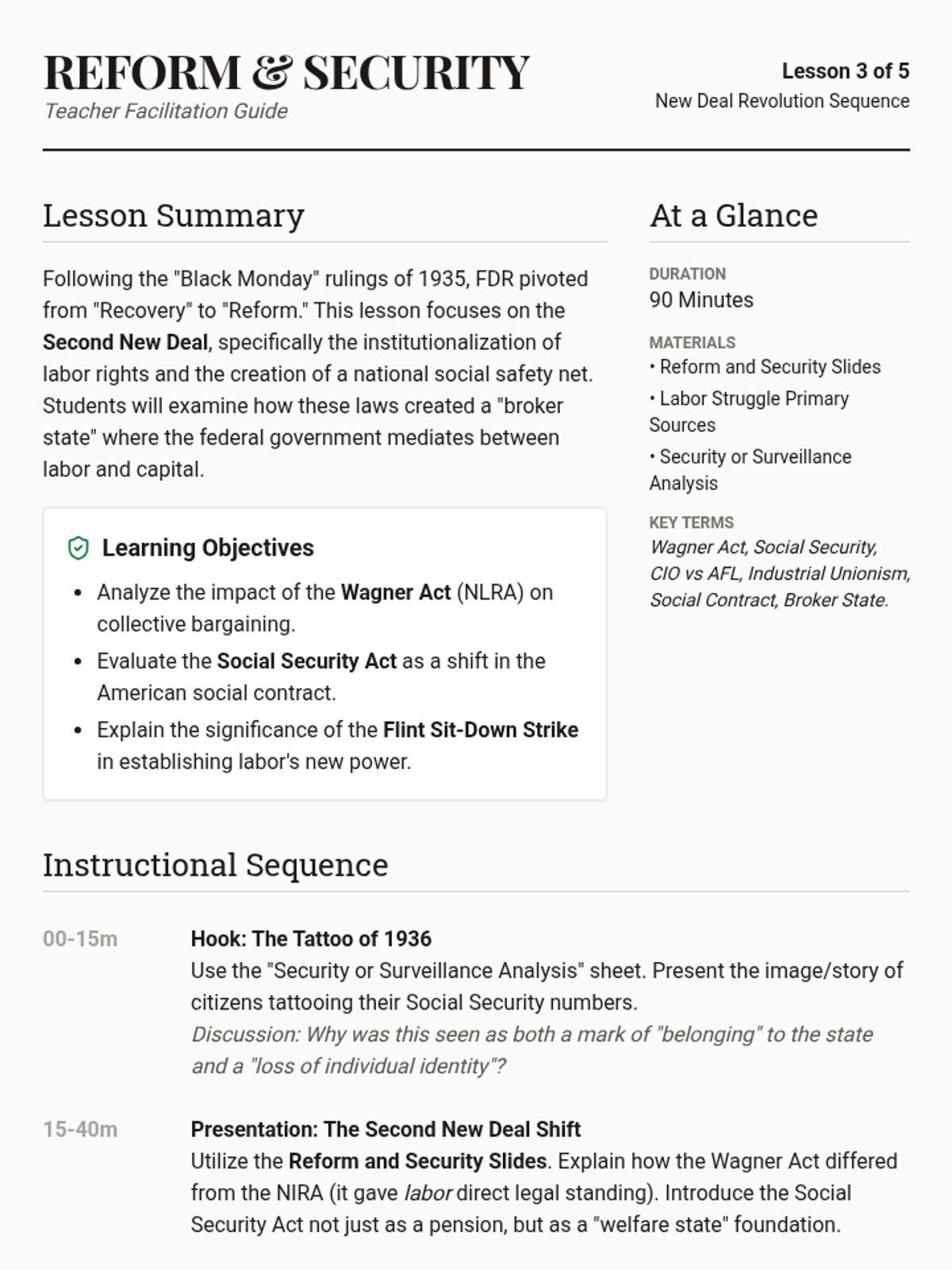 A comprehensive 5-lesson sequence for undergraduate students examining the political, legal, and social transformation of the United States during the New Deal era. Students analyze the shift from dual federalism to cooperative federalism and evaluate the changing relationship between the citizen and the federal government.