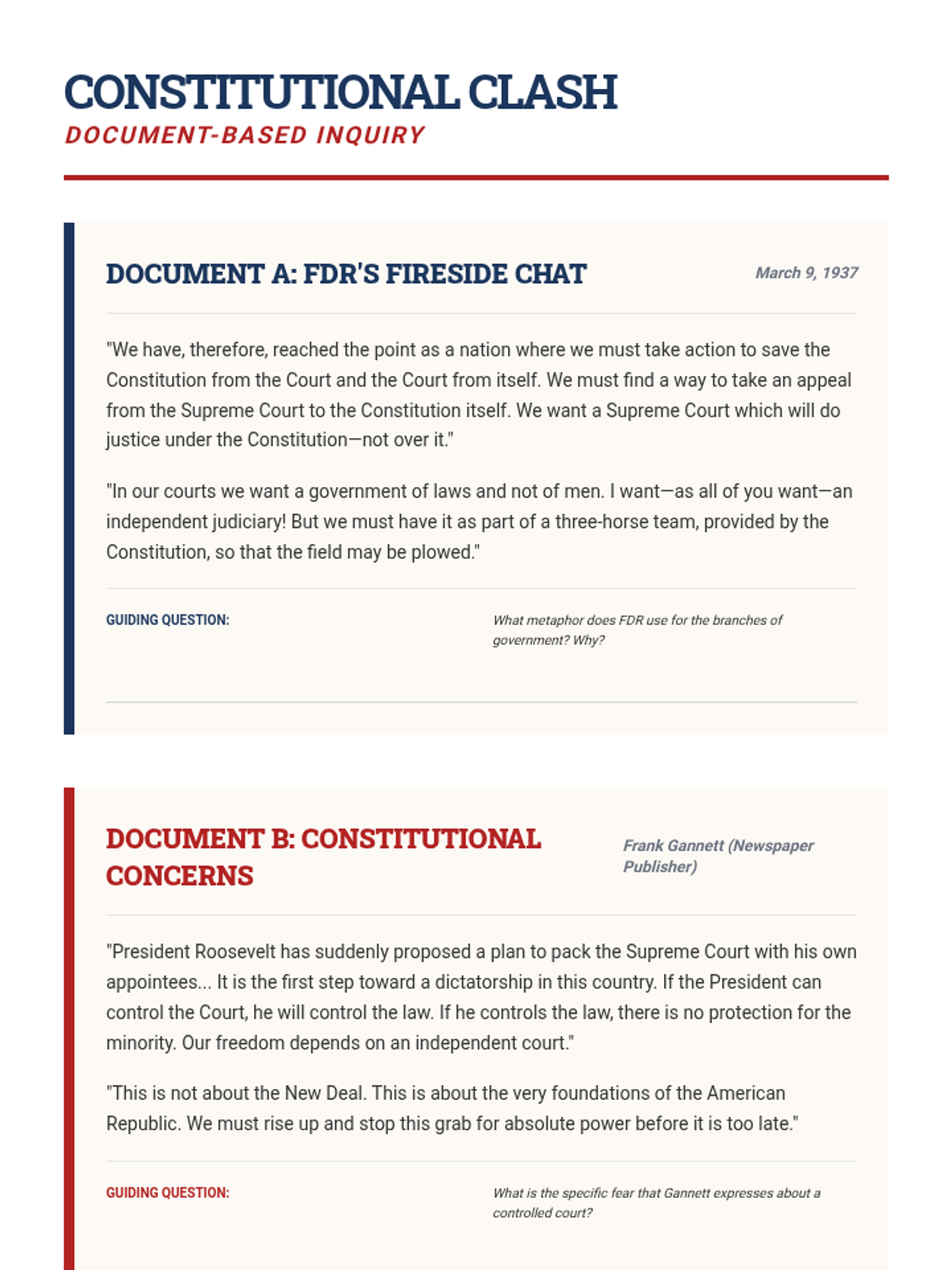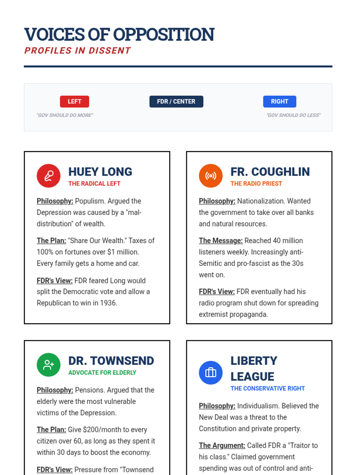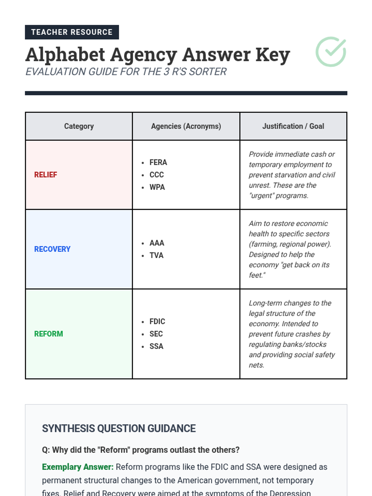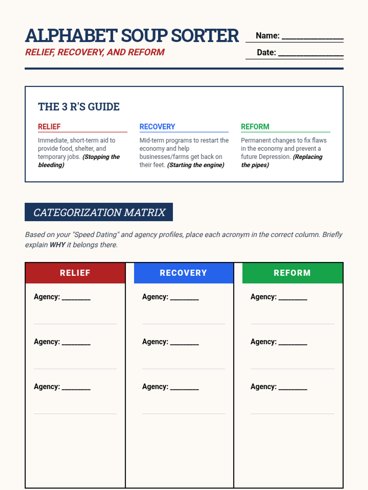 This sequence critically evaluates the political response to the Great Depression, focusing on the shift from Hoover's 'rugged individualism' to FDR's New Deal. Students categorize alphabet agencies into Relief, Recovery, and Reform, and analyze the resulting expansion of federal power and constitutional crises.