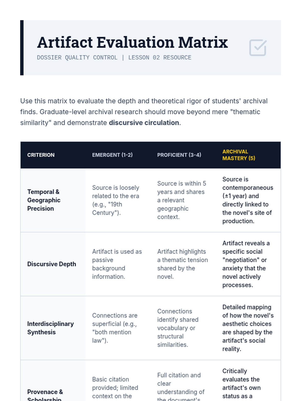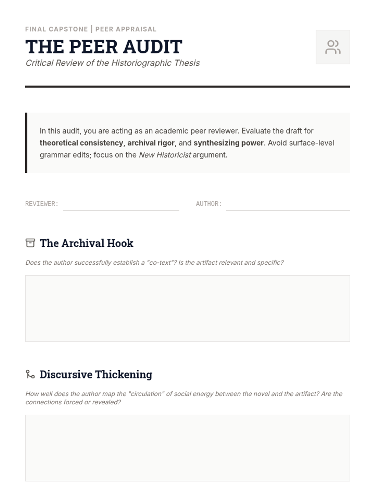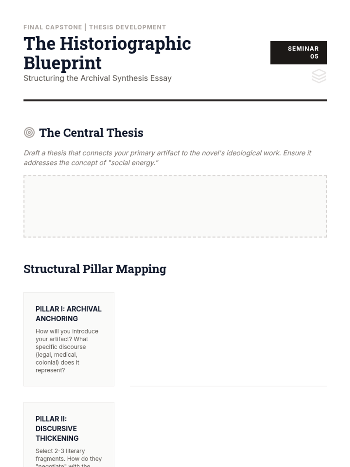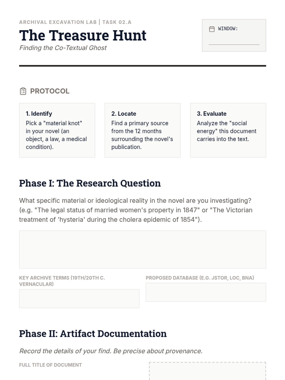 A graduate-level exploration of New Historicism and Archival Contextualization in novel studies, focusing on the text as a social artifact within a web of historical discourses.
