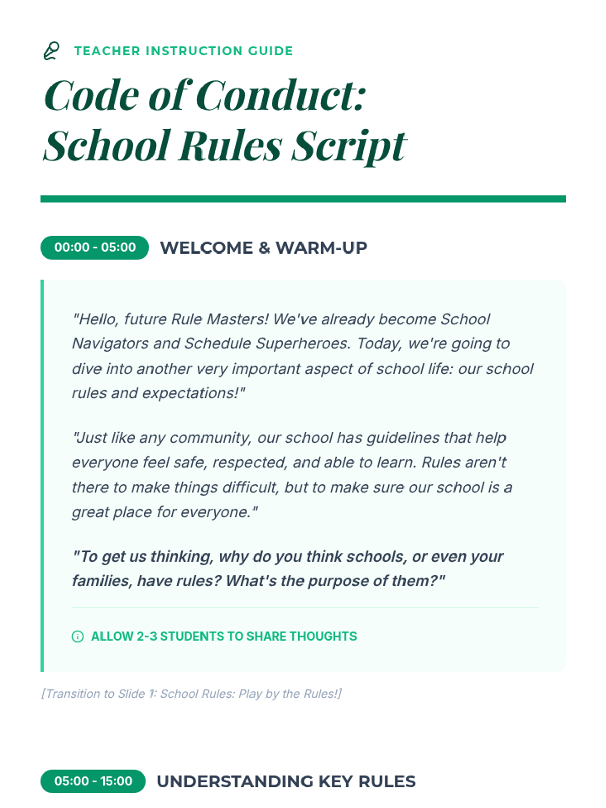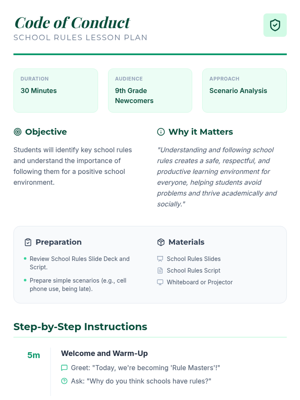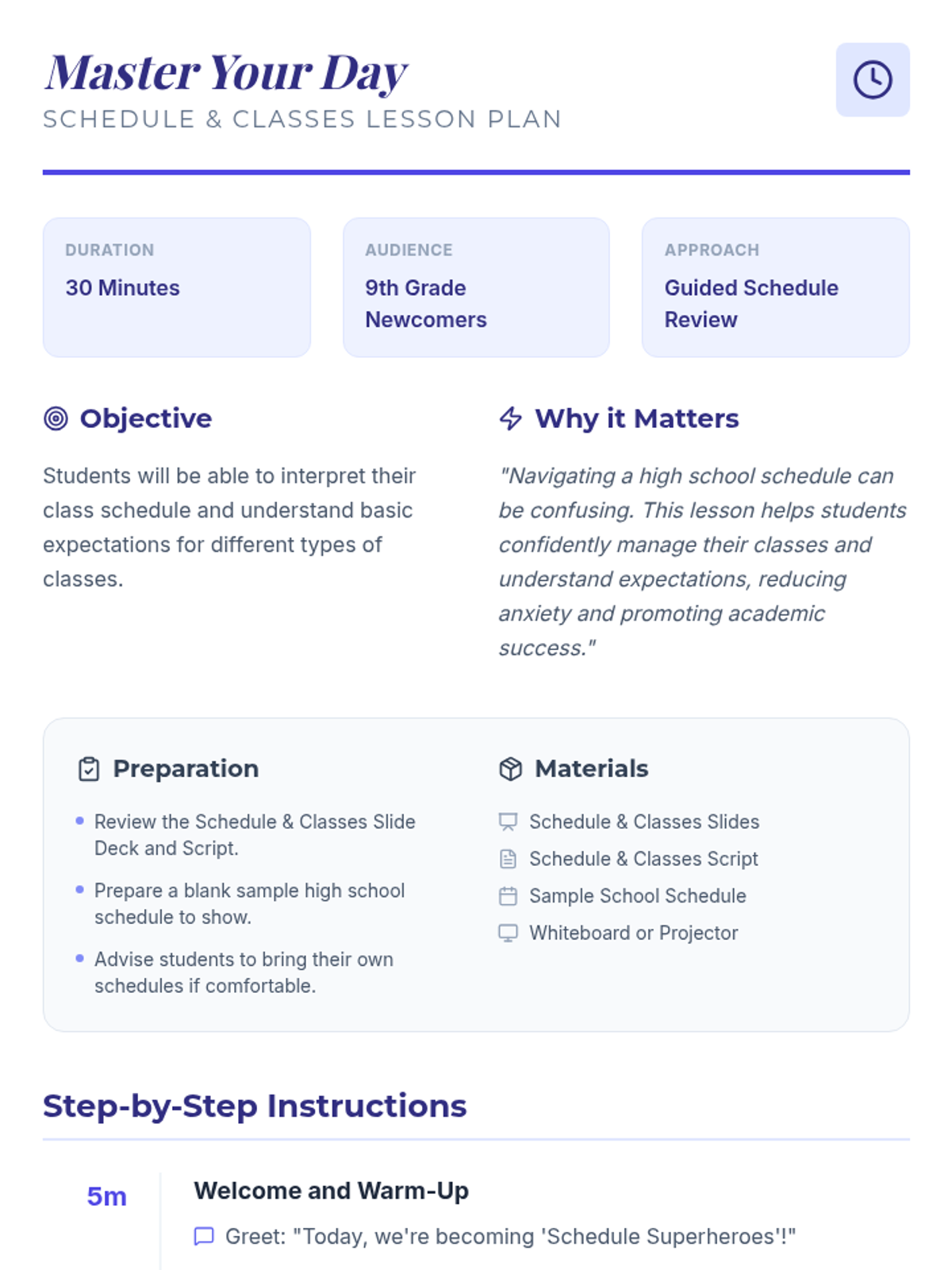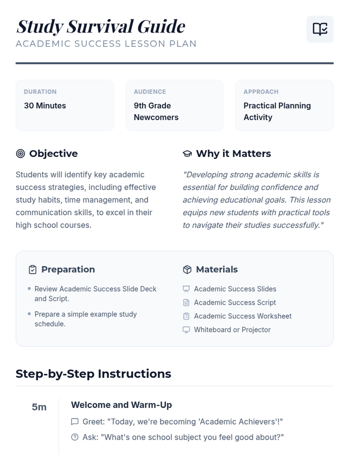 A 6-week executive functioning curriculum for 9th-grade boys designed for 25-minute small group sessions. Focuses on grade monitoring, task prioritization, and teacher communication to build independence.