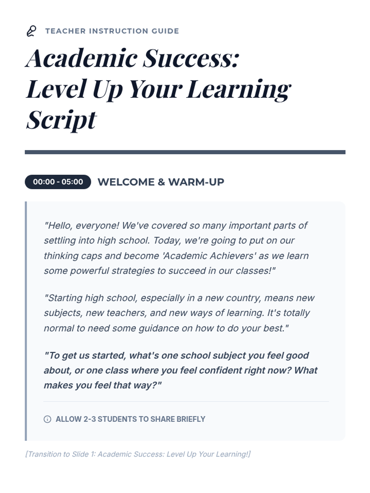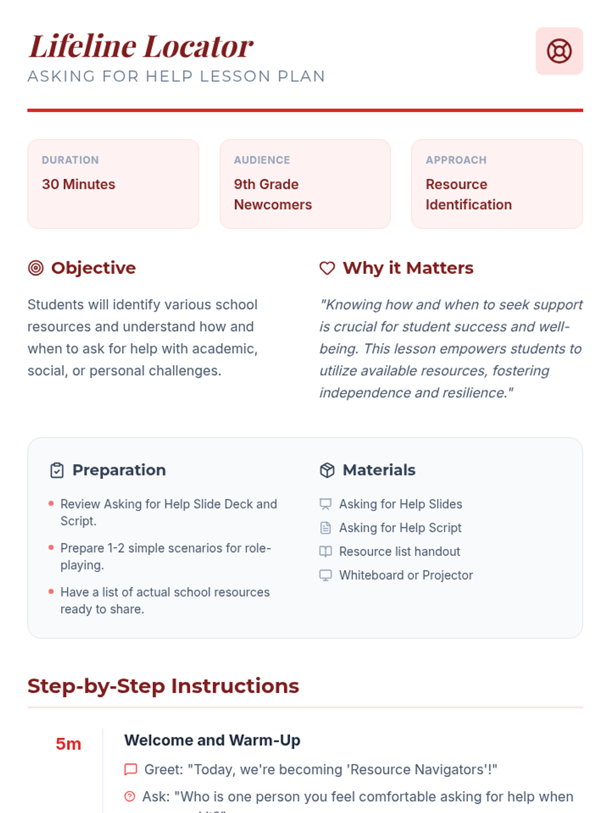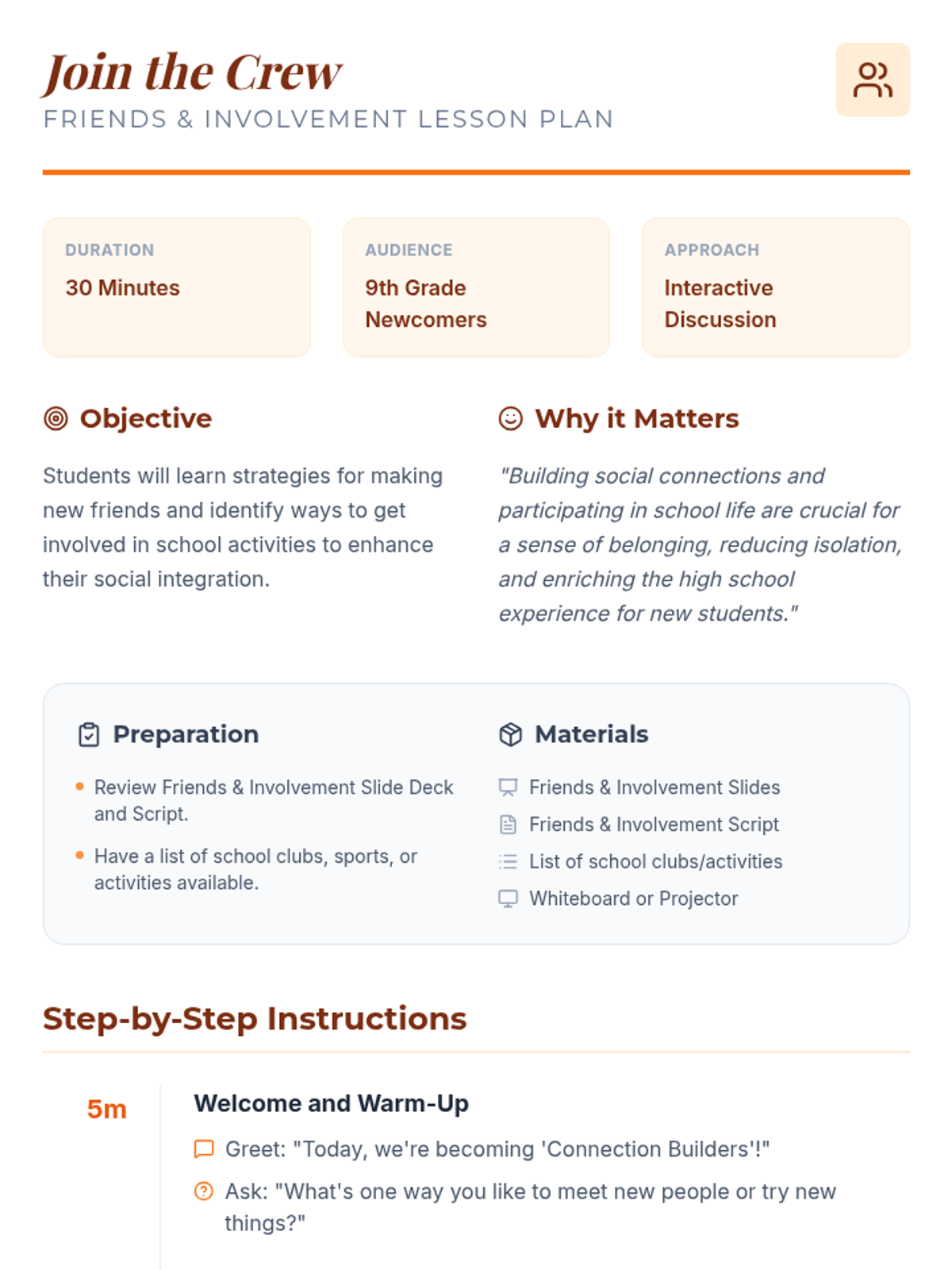 A comprehensive seven-session small group curriculum designed to help high school students new to the country navigate their new school environment, understand academic expectations, and build social connections.