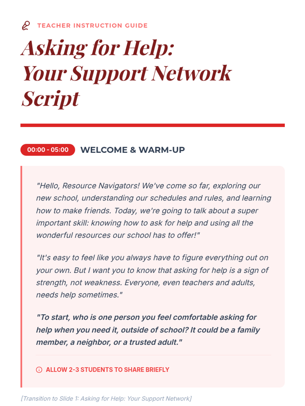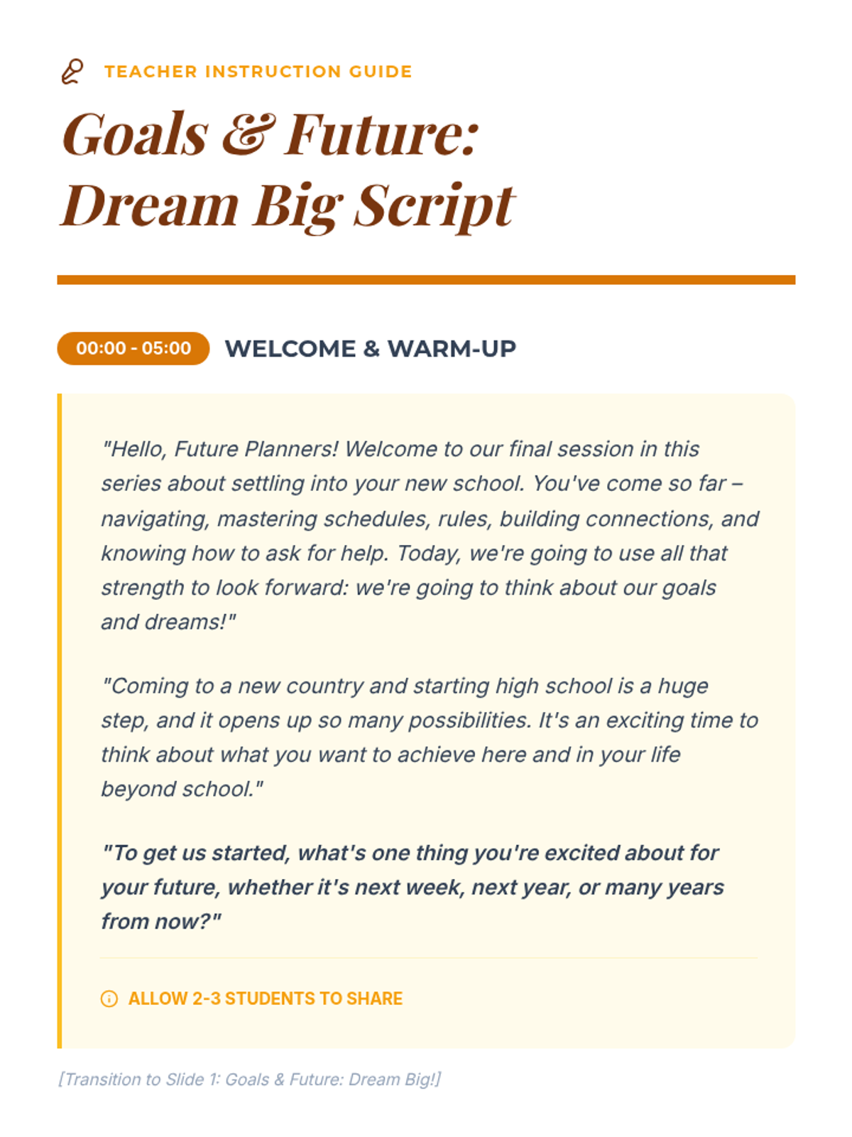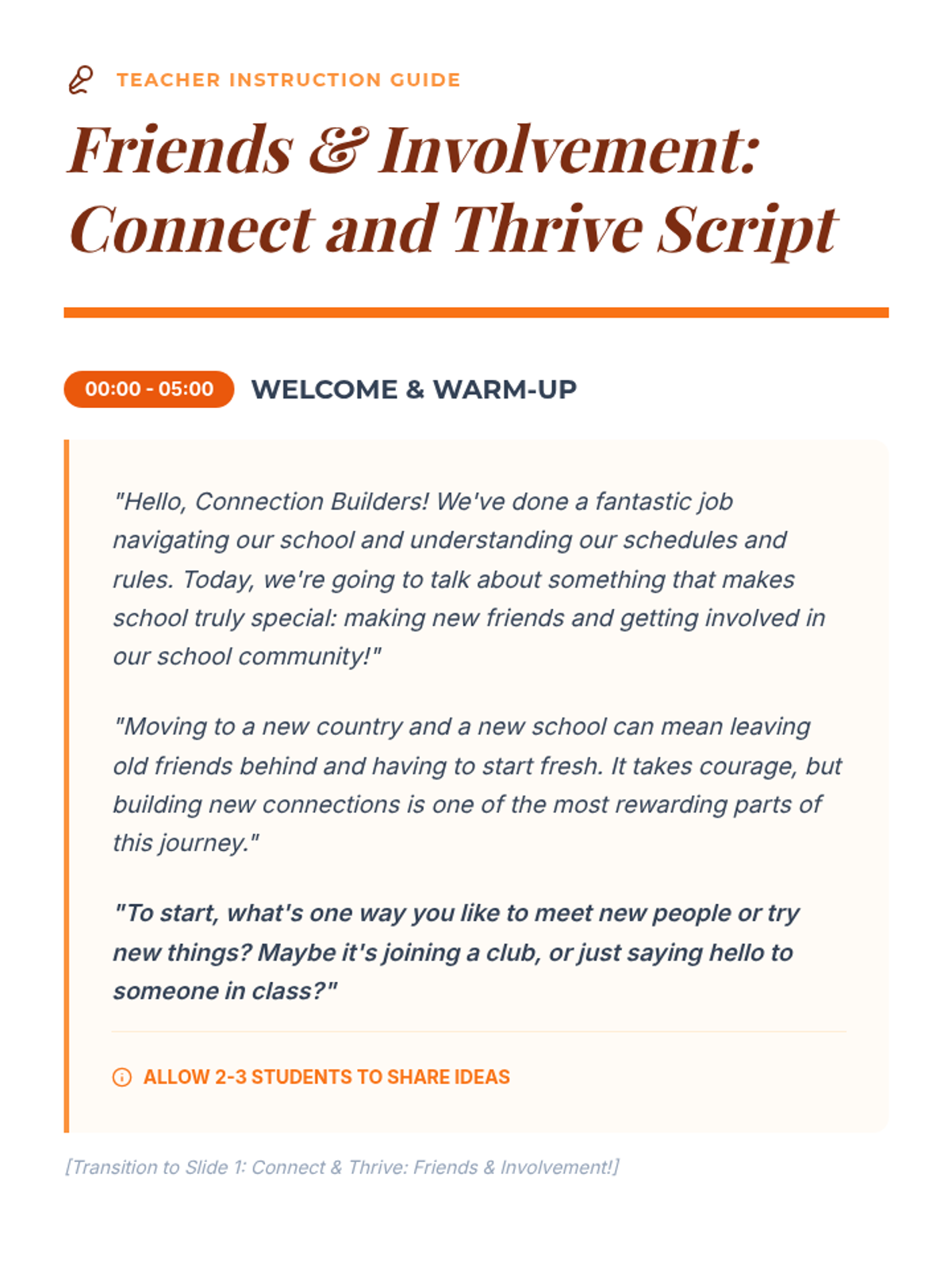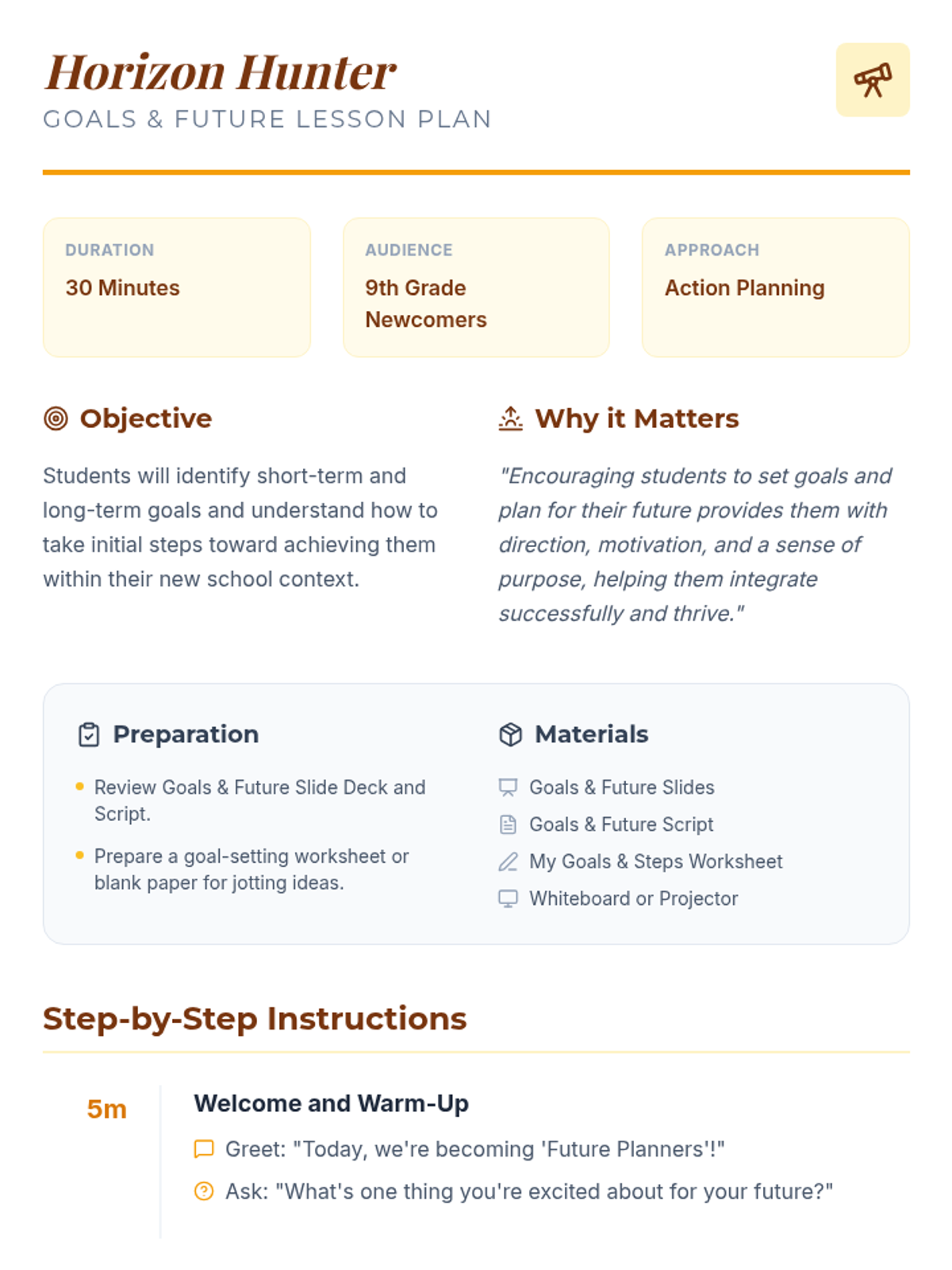 A comprehensive seven-session small group curriculum designed to help high school students new to the country navigate their new school environment, understand academic expectations, and build social connections.