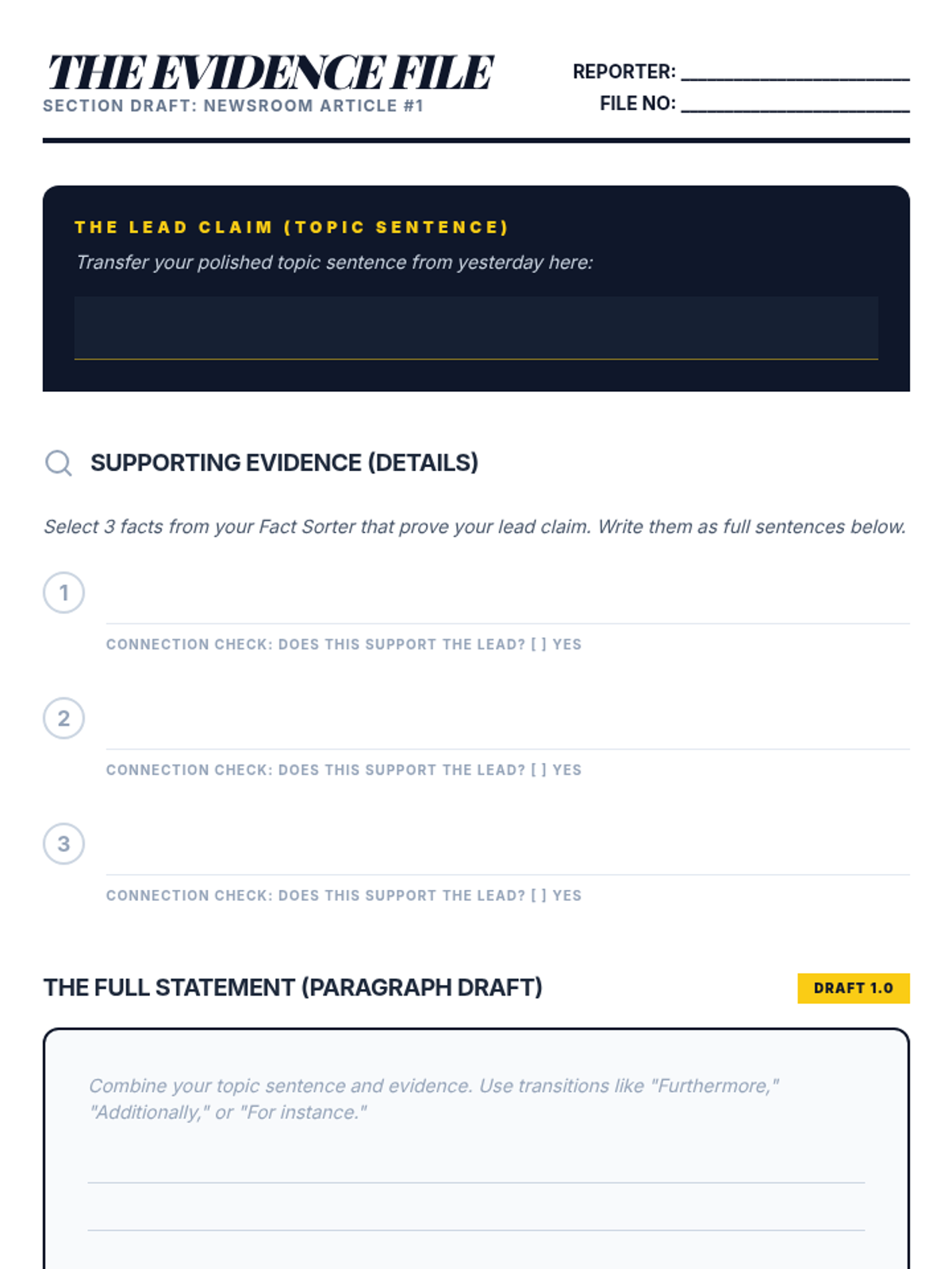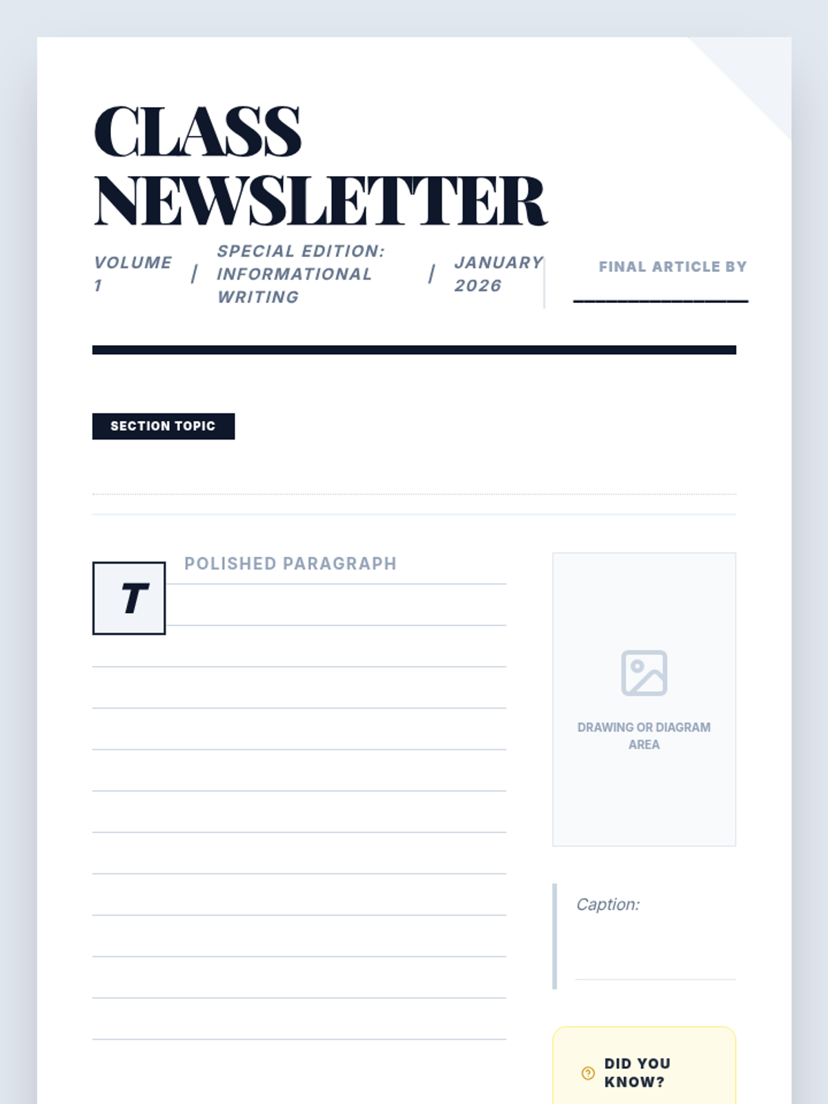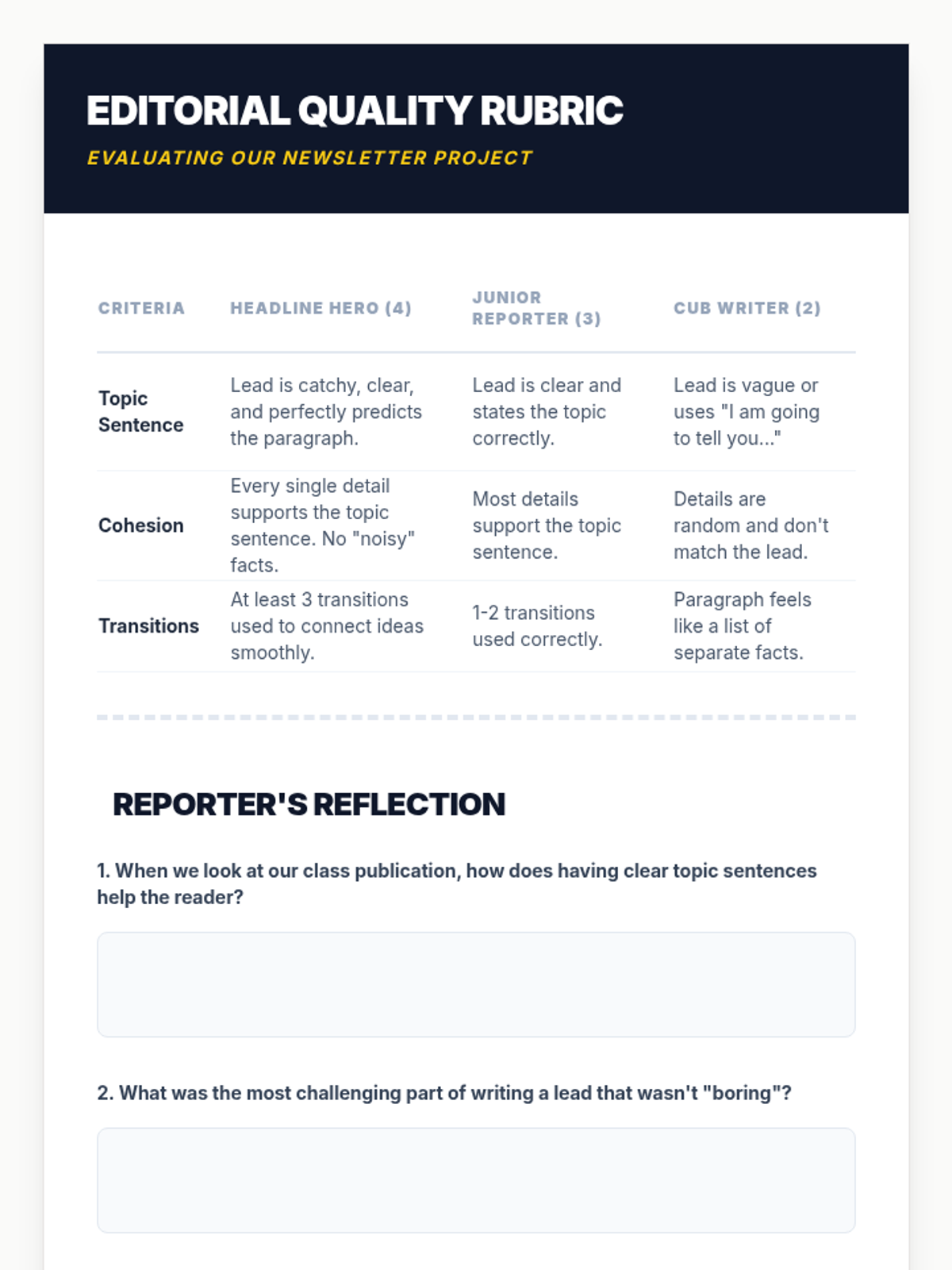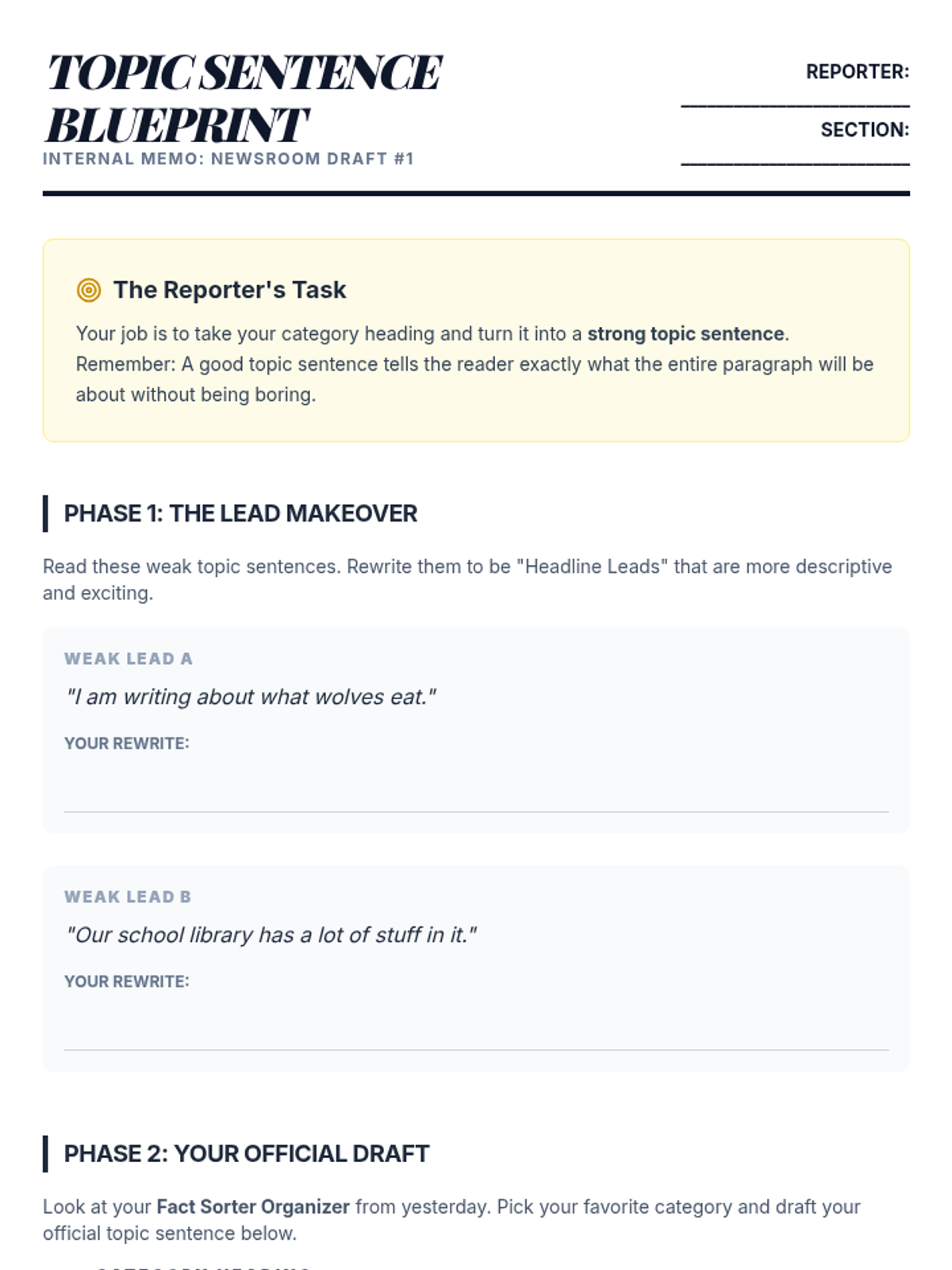 A project-based sequence where 4th-grade students act as journalists to create a class newsletter, focusing on using topic sentences to organize informational writing for their readers.