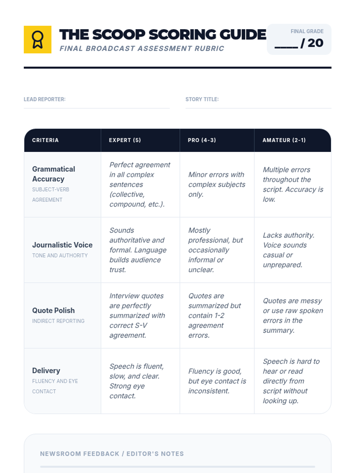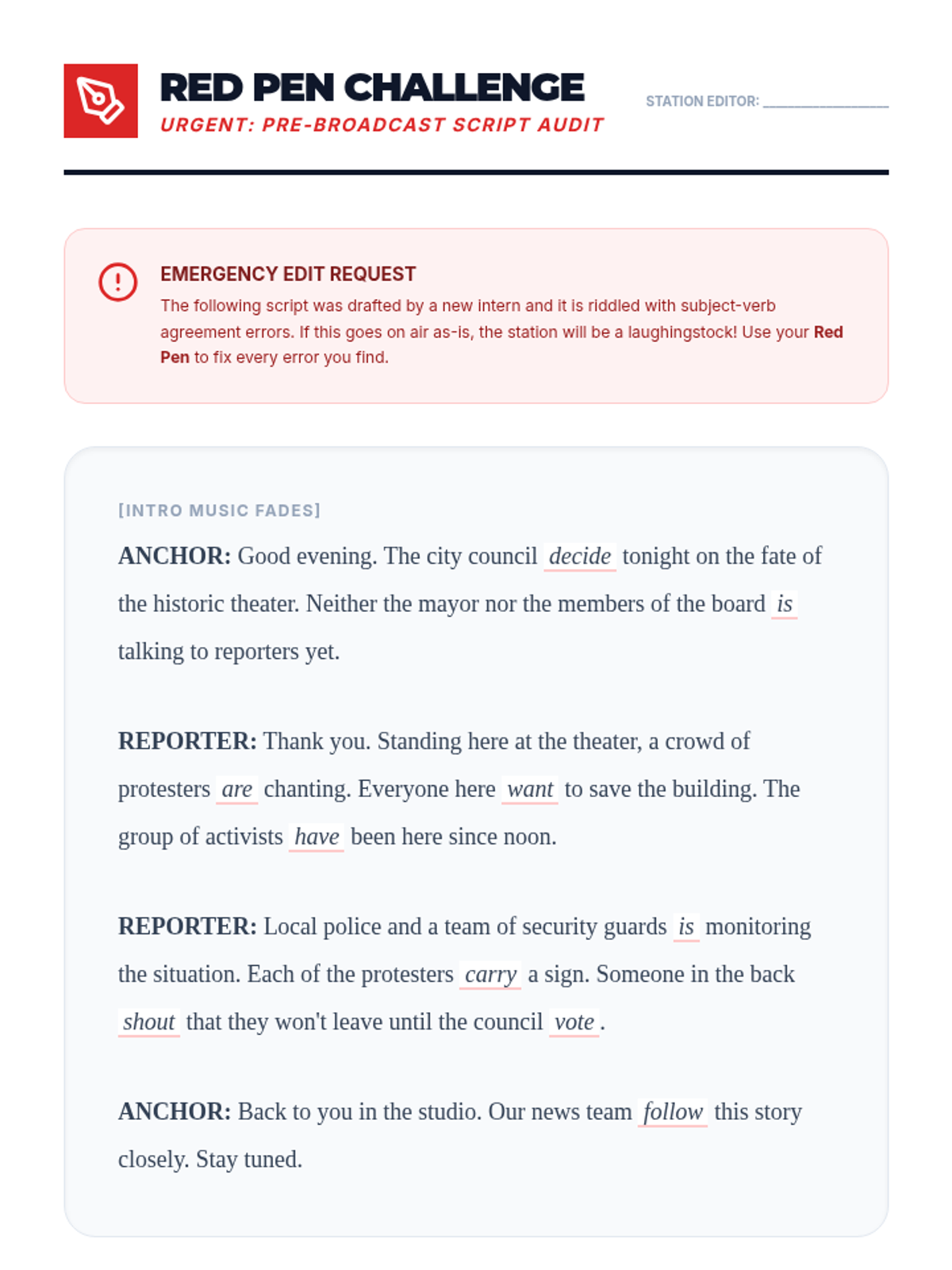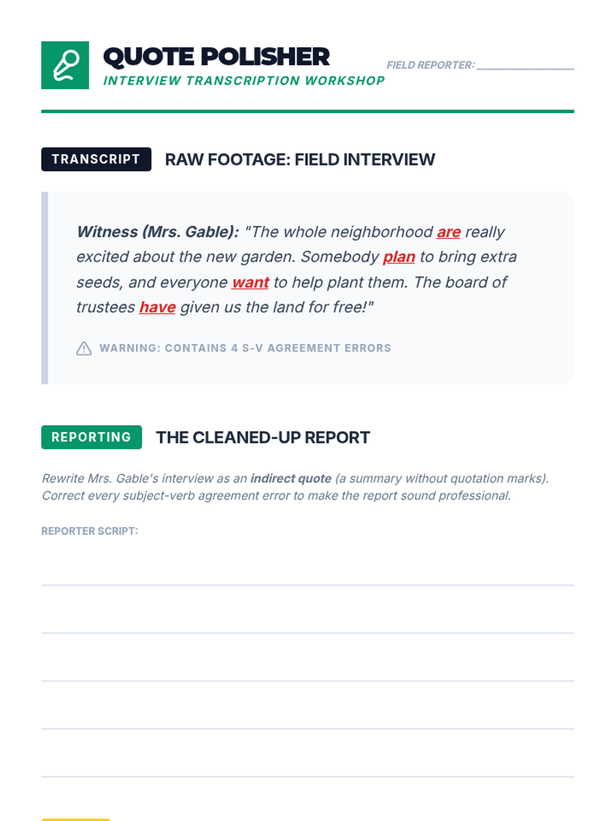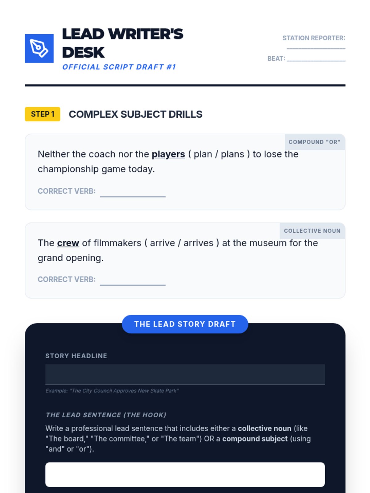 A project-based grammar sequence where 5th-grade students act as journalists to master subject-verb agreement. By drafting news scripts and conducting interviews, students learn that grammatical precision is the key to professional credibility.
