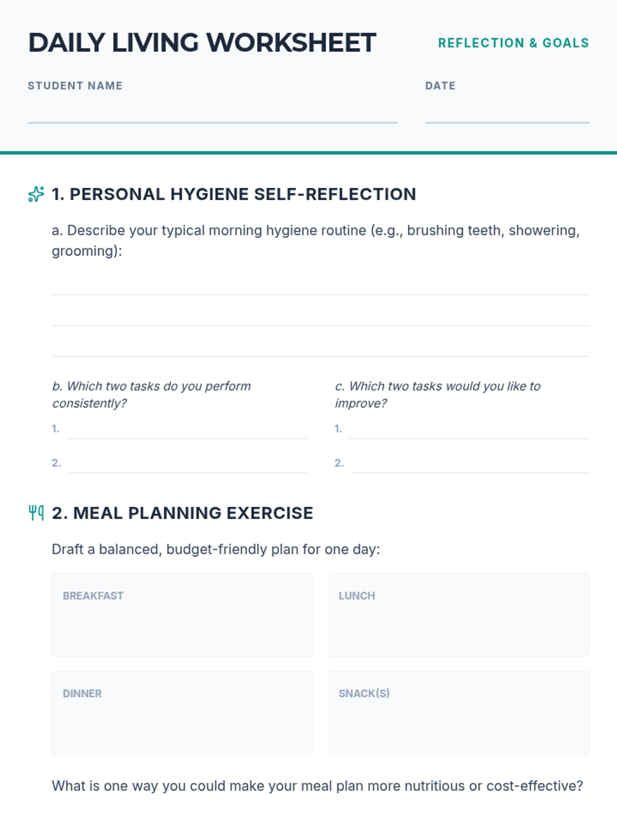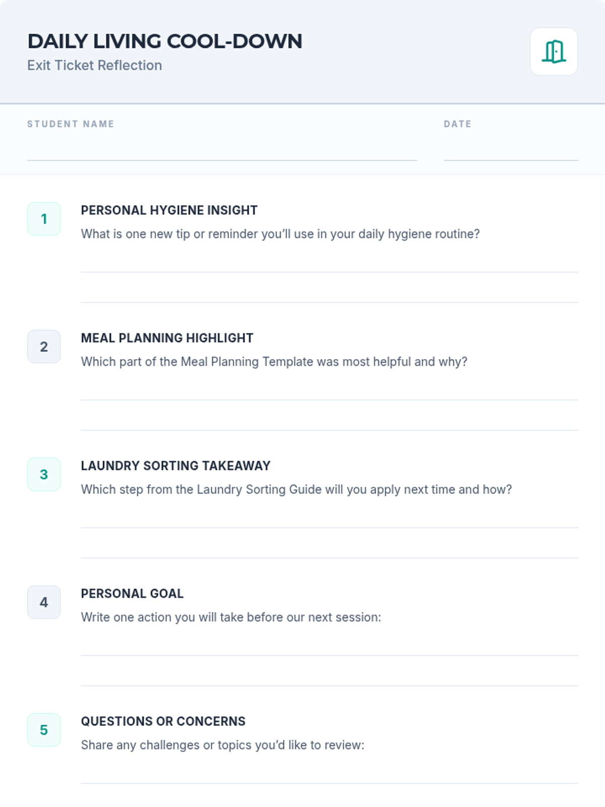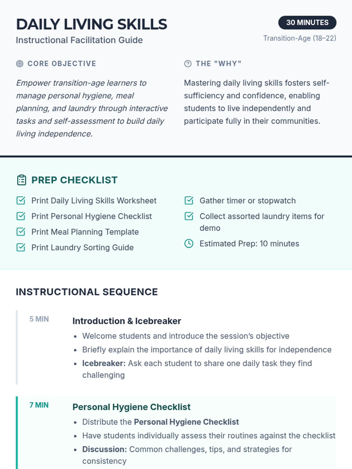 A comprehensive curriculum for transition-age learners (18–22) to develop essential independence skills across six domains: daily living, finance, work, communication, health, and community.