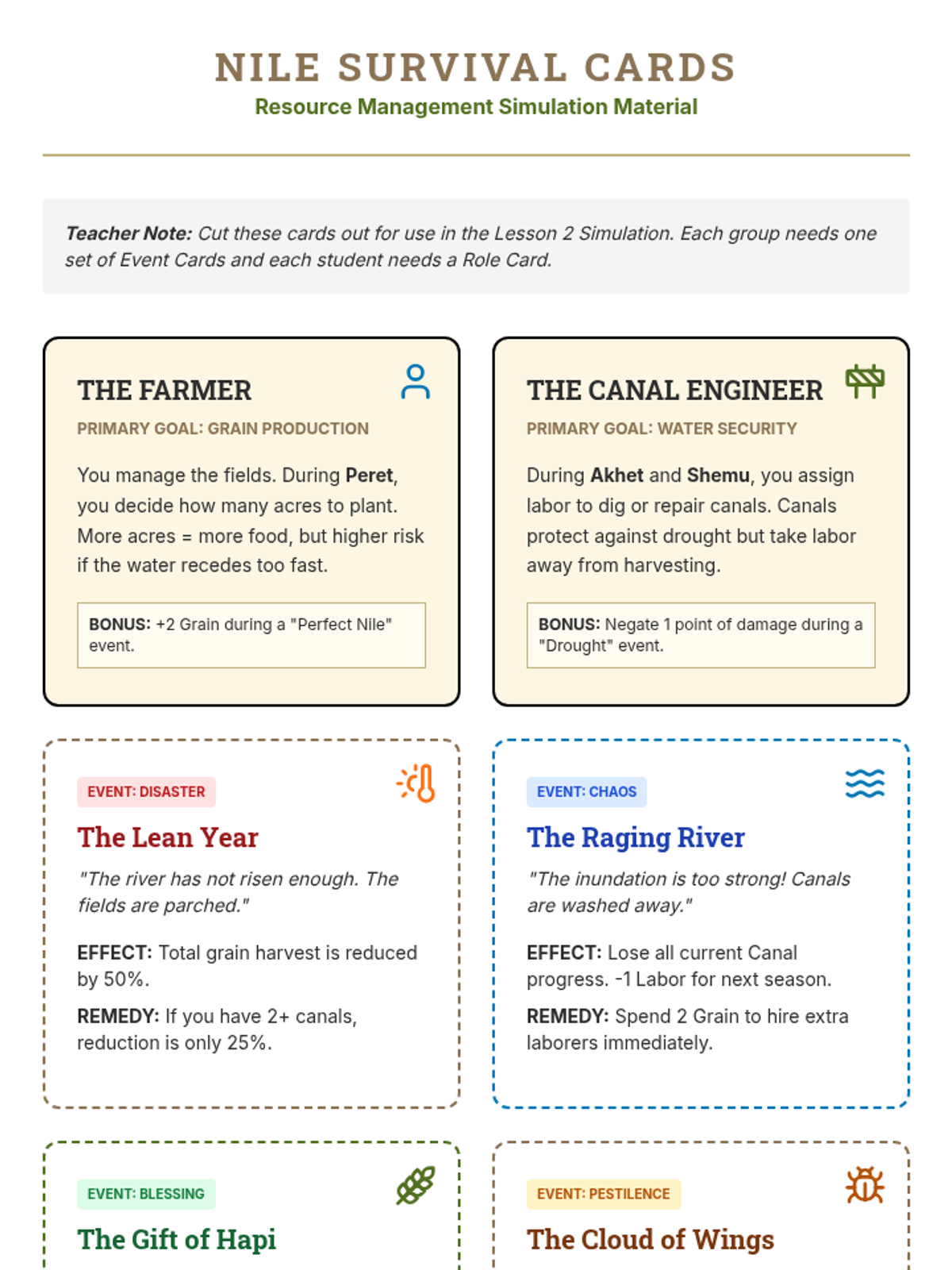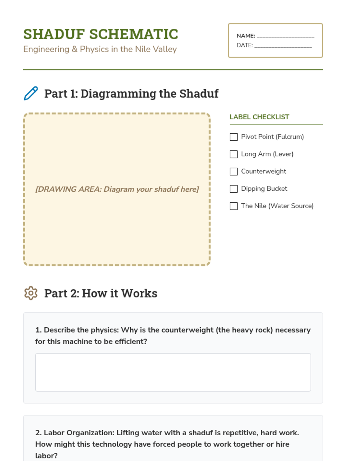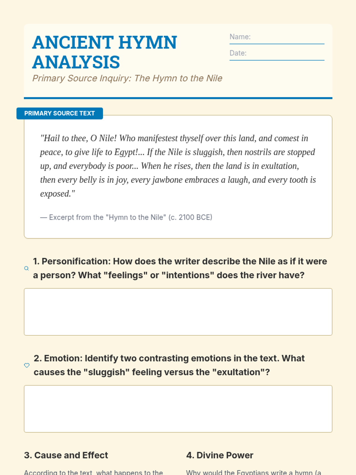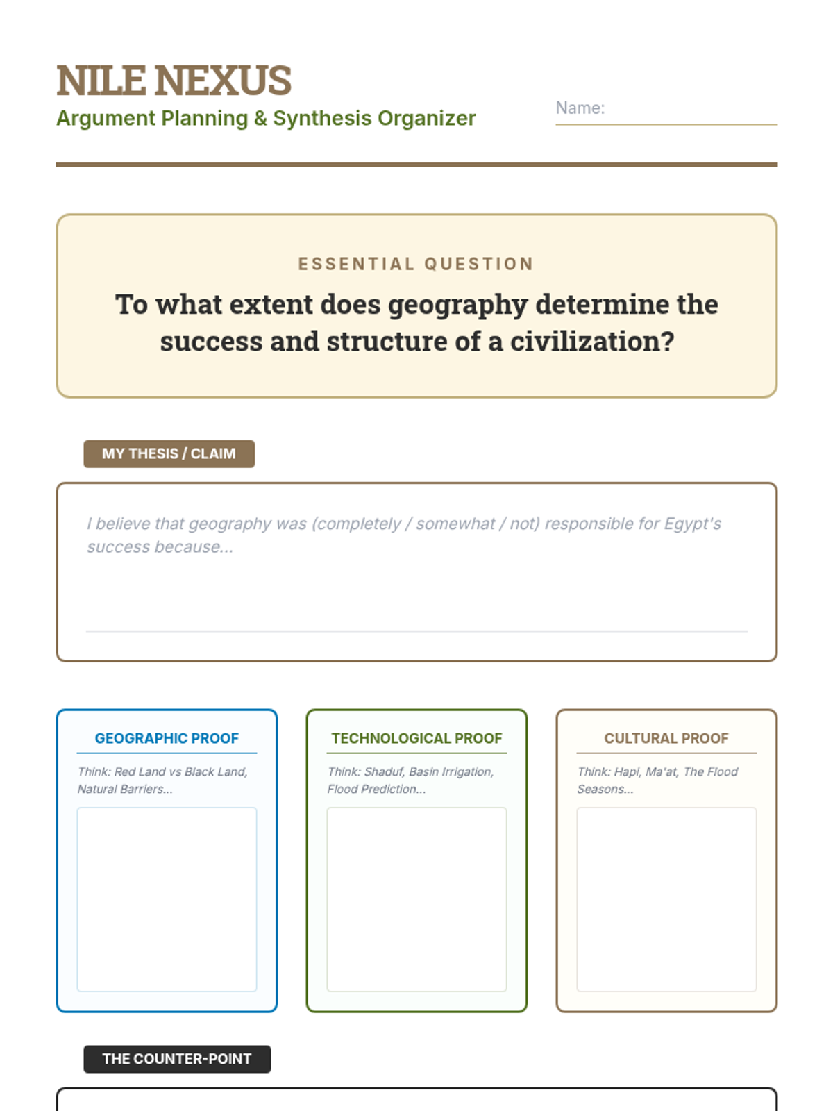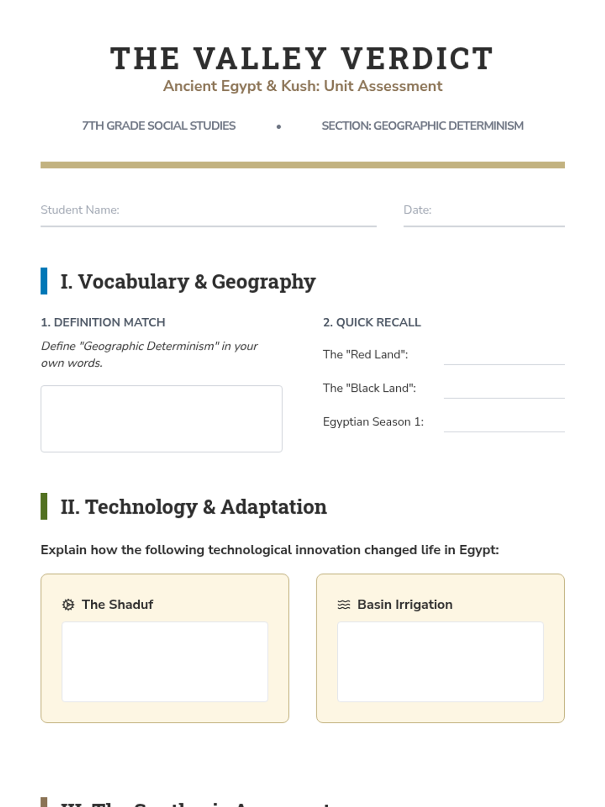 This 7th Grade Social Studies sequence investigates the profound impact of the Nile River on Ancient Egyptian and Kushite civilizations. Students explore geographic determinism through map analysis, flood simulations, technological diagrams, and primary source evaluation to understand how the environment shaped settlement, religion, and innovation.