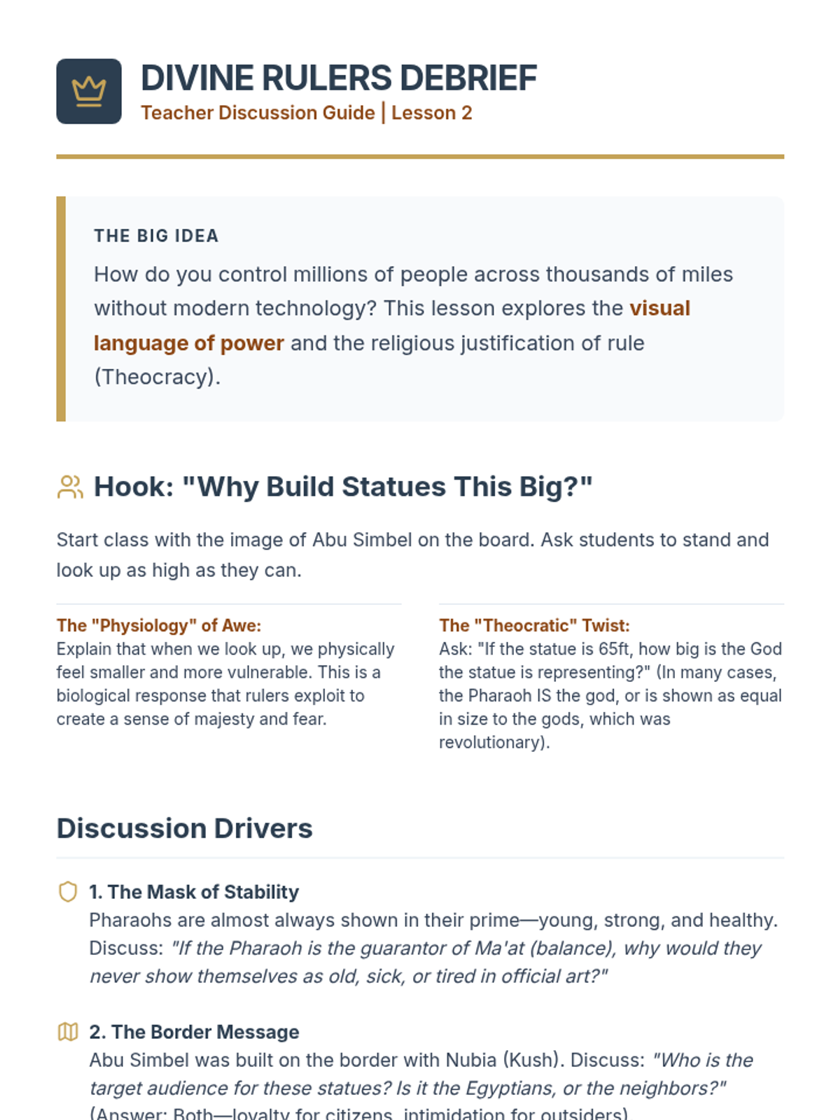 This sequence examines the rigid social hierarchy of Ancient Egypt and the distinct roles within it, from the Pharaoh to the peasantry. Students analyze the consolidation of power, the role of bureaucracy, and the lives of specific rulers through case studies and simulations.
