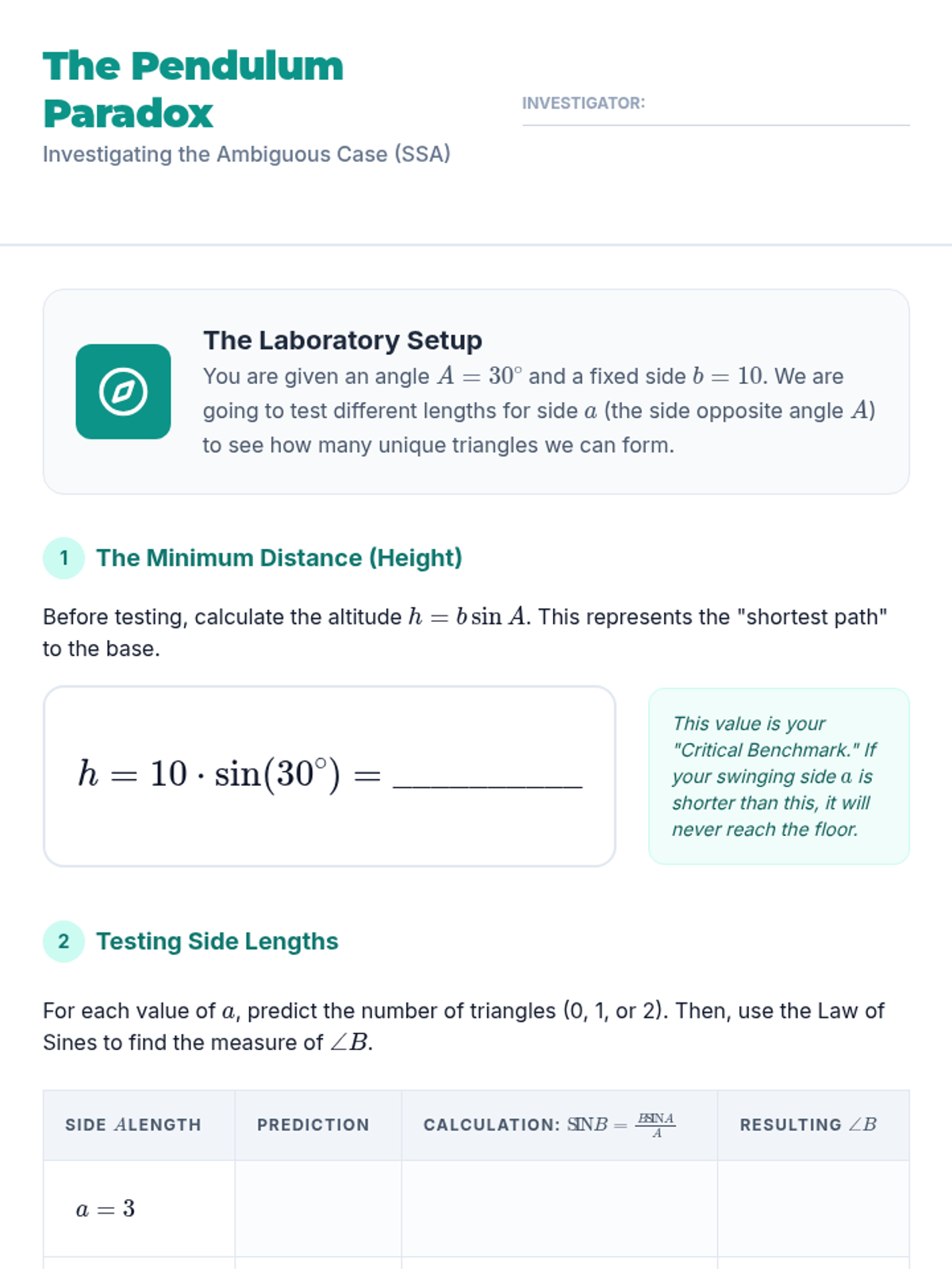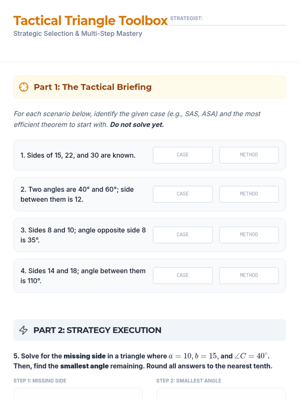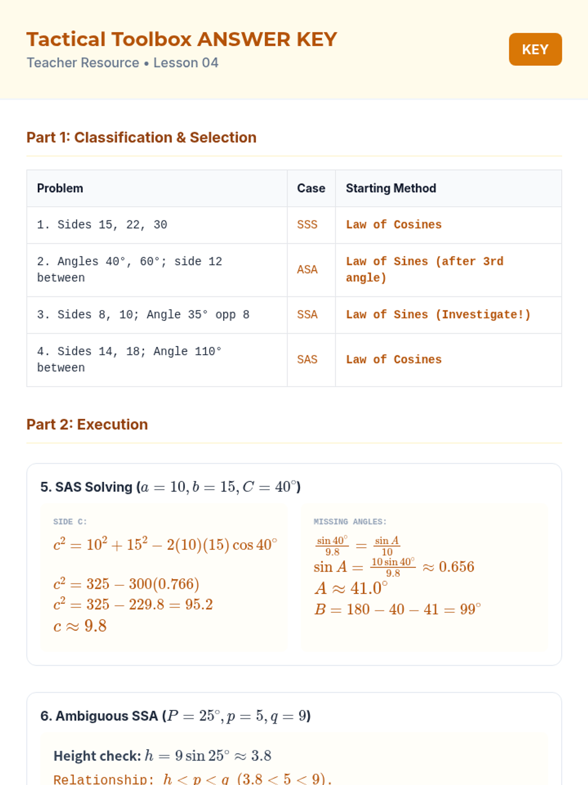 This sequence guides 11th-grade students through the derivation and application of the Law of Sines and the Law of Cosines. It focuses on solving oblique triangles, navigating the ambiguous case (SSA), and developing a strategic framework for selecting the correct trigonometric tool for any given triangle.
