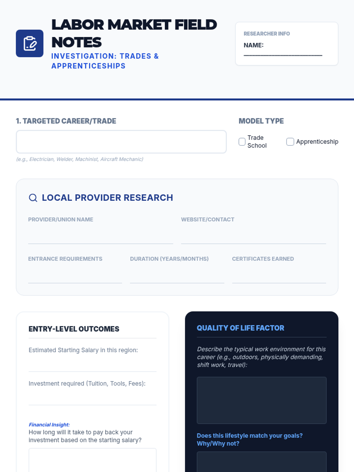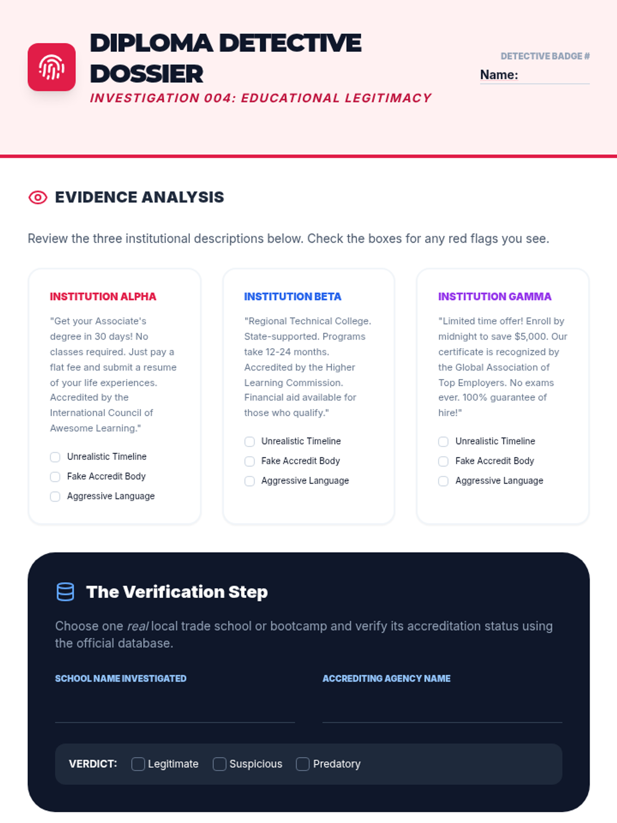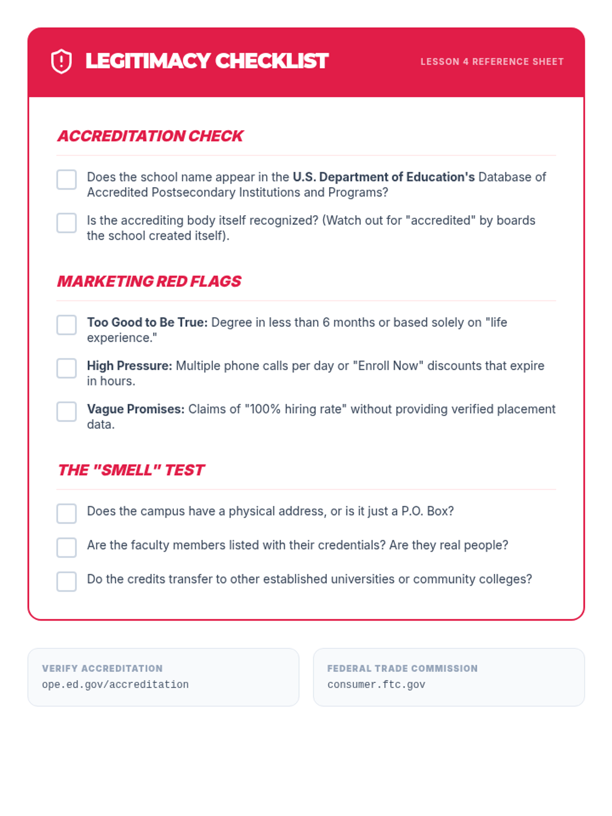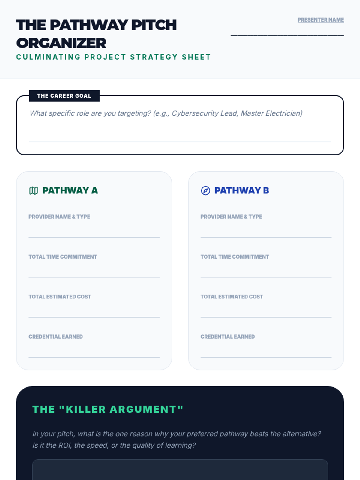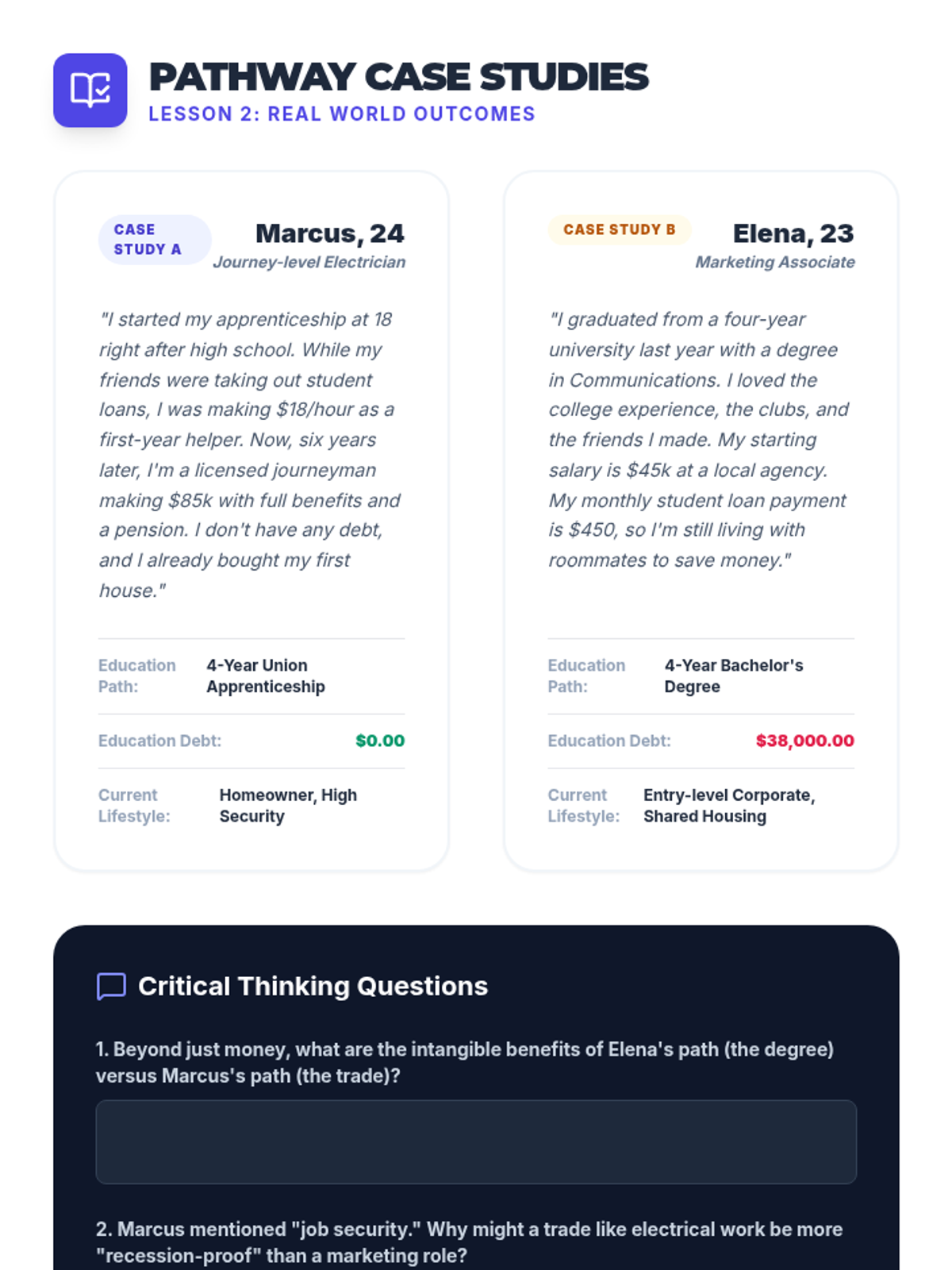 This sequence explores post-secondary education options beyond the traditional four-year degree, including trade schools, apprenticeships, coding bootcamps, and certificate programs. Students learn to evaluate the legitimacy of various programs and compare different career pathways based on cost, duration, and outcomes.