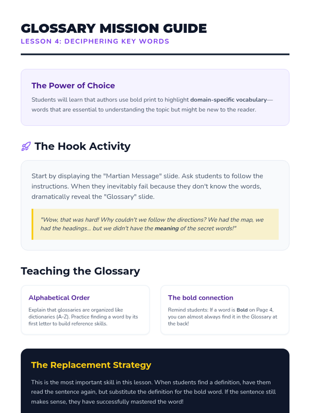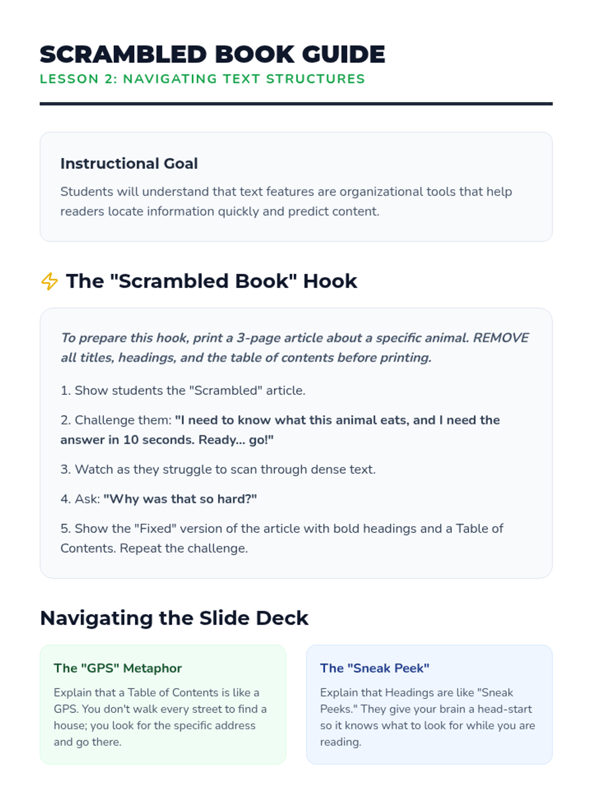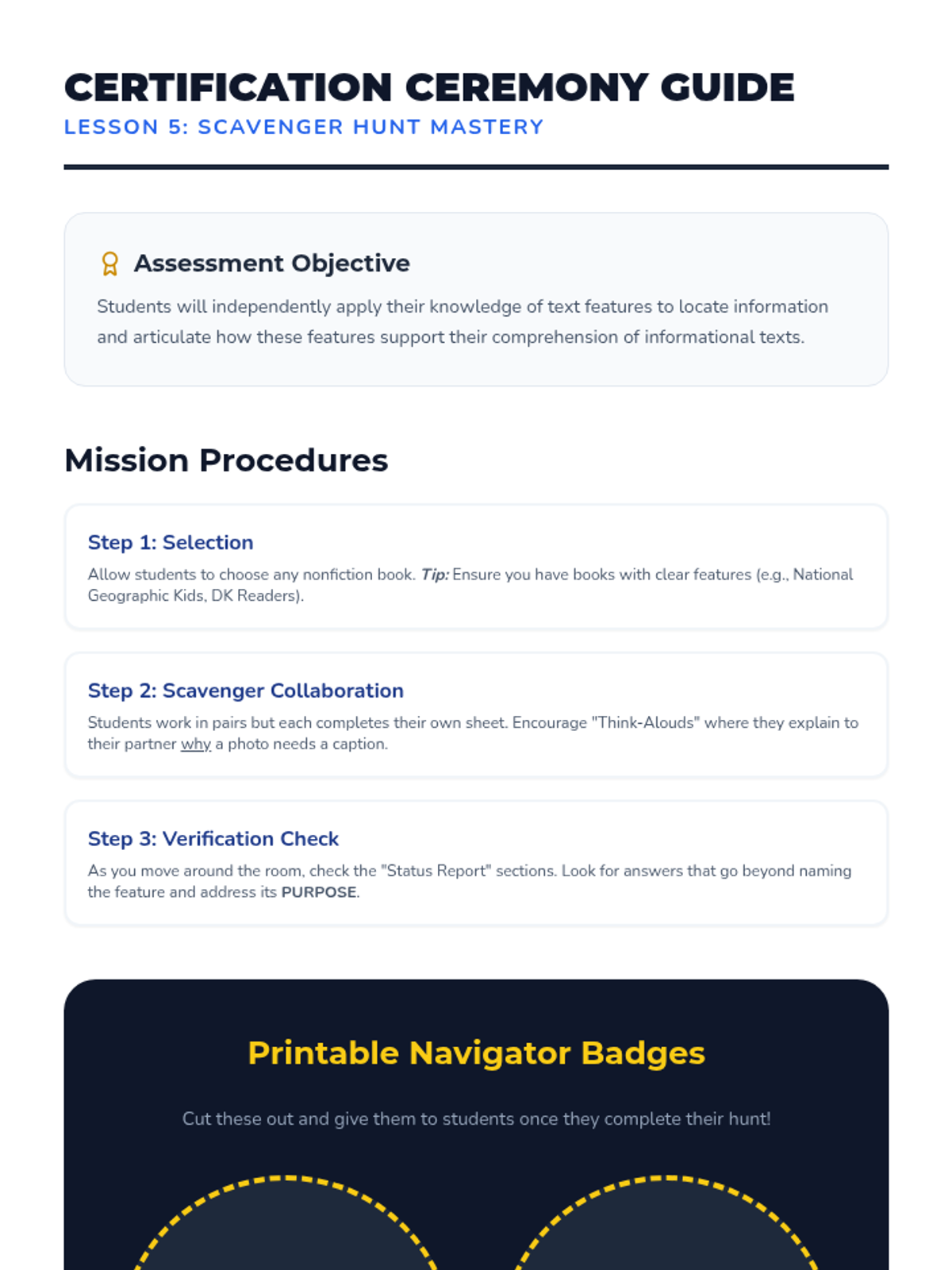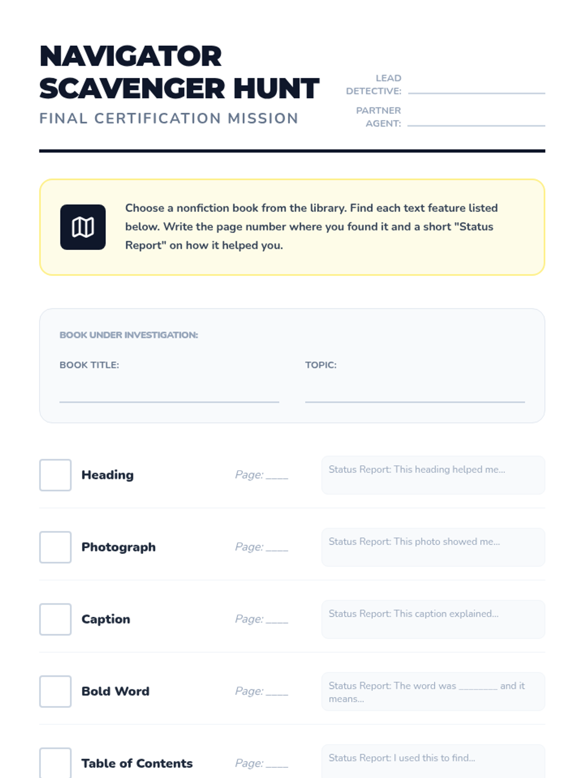 Students become 'Text Detectives' to explore informational text features. They learn to identify and use headings, captions, glossaries, and visual aids to navigate nonfiction books and gather information efficiently.