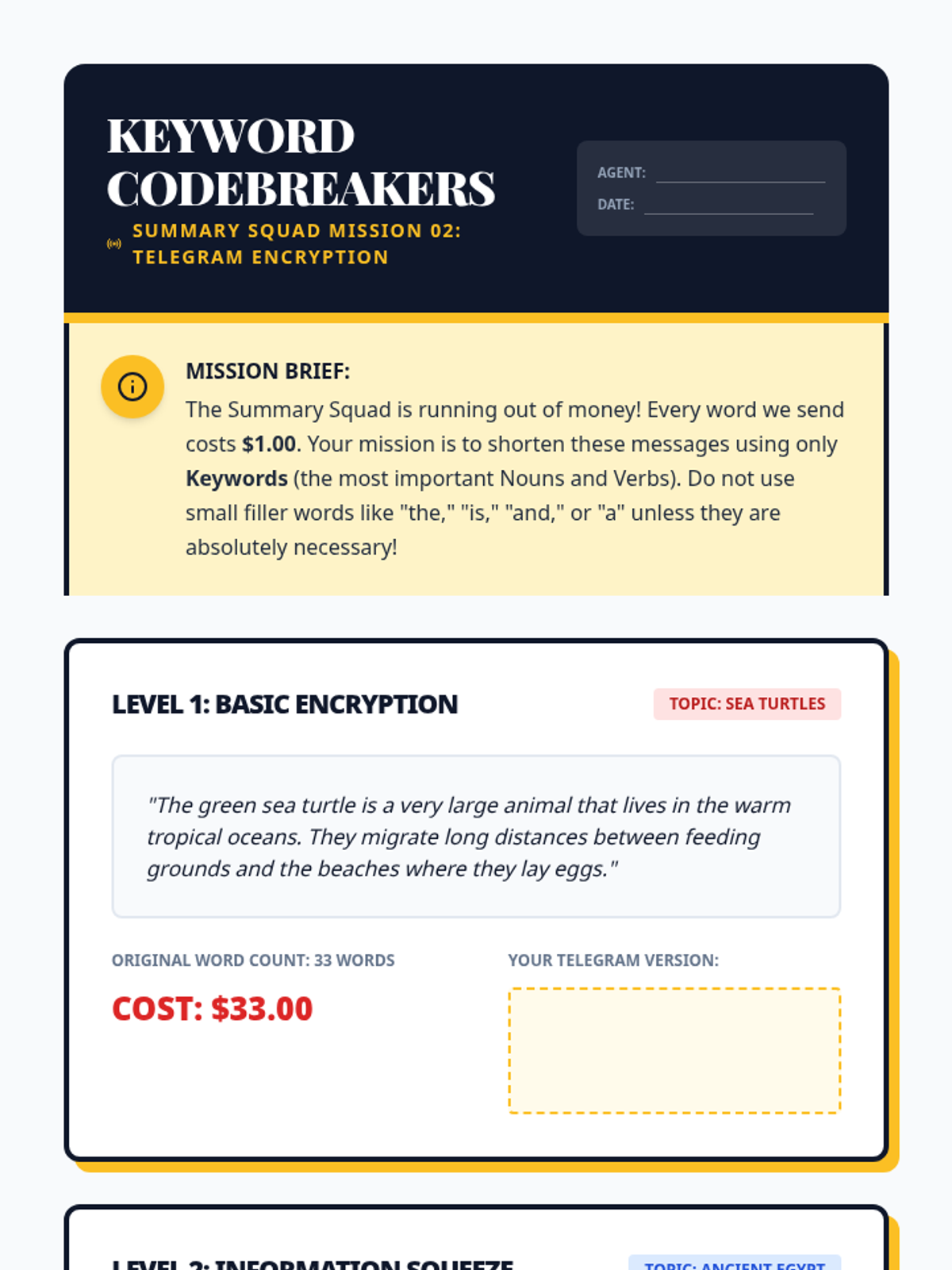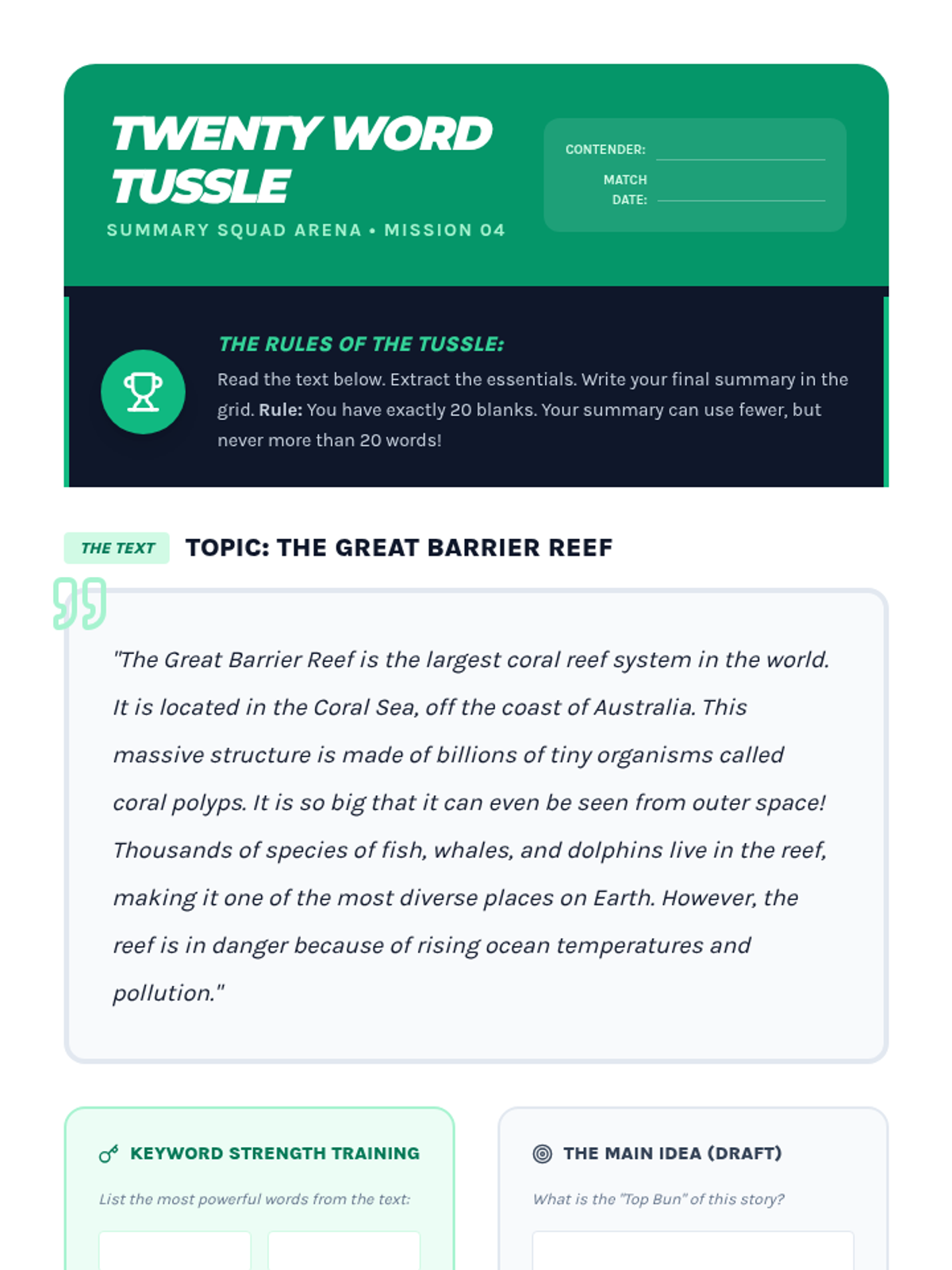 A workshop-style sequence where 3rd graders learn to distill nonfiction texts into concise summaries. Students progress from identifying essential information to using keywords and structured frameworks, culminating in high-stakes summarization challenges and peer critique.
