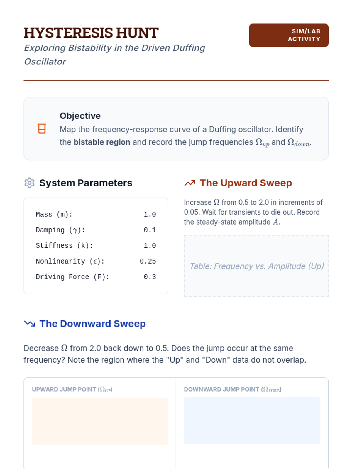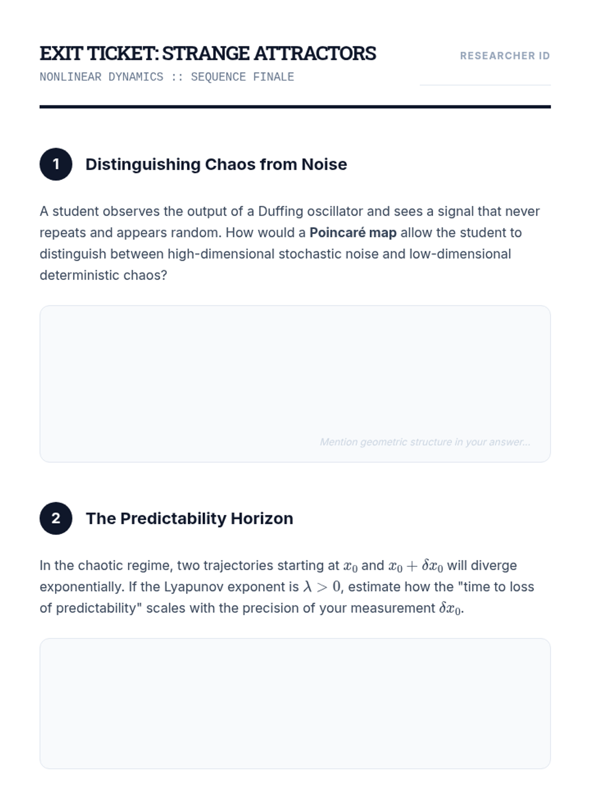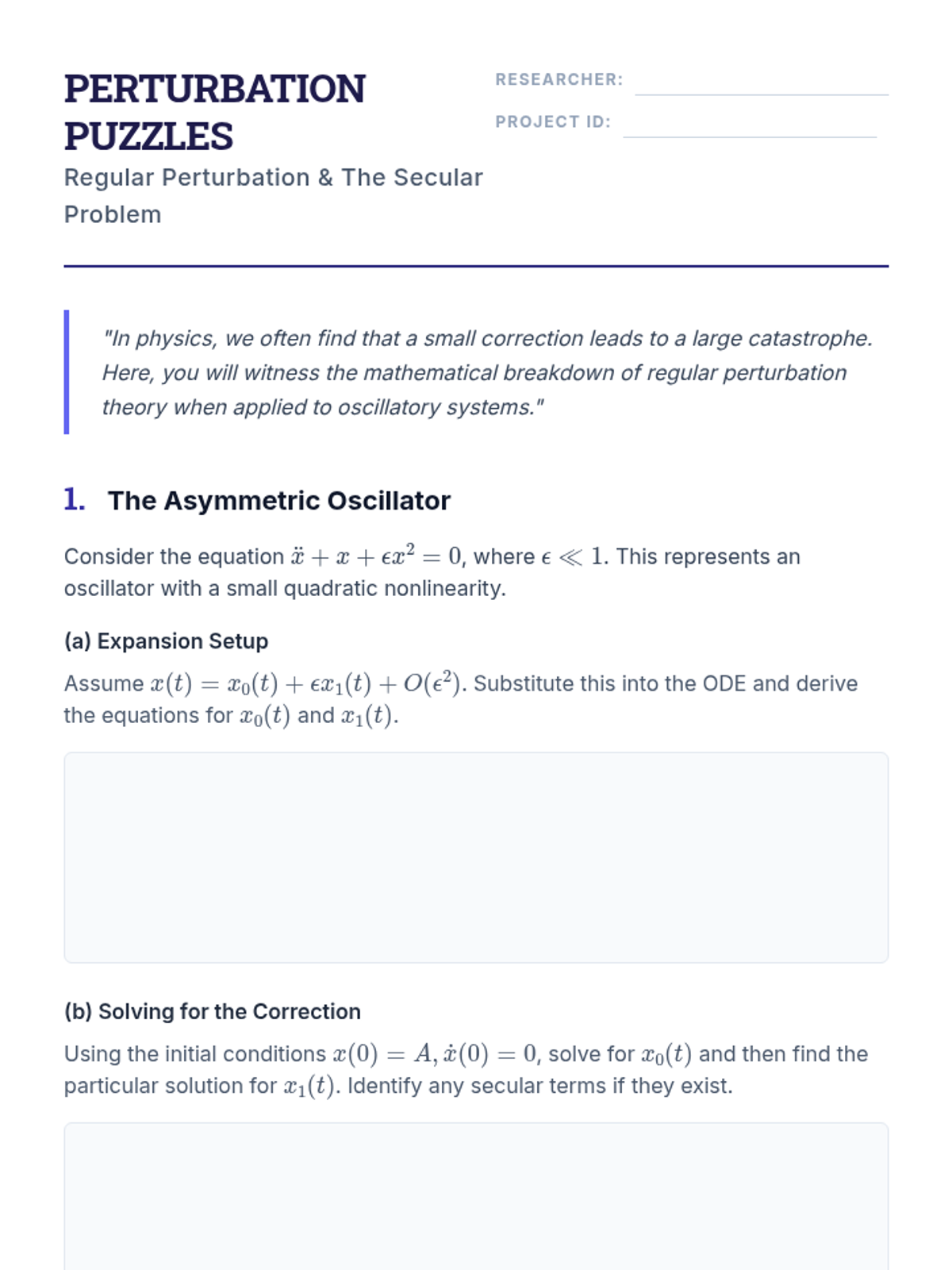 This graduate-level sequence explores nonlinear dynamics, moving from simple harmonic motion to complex chaotic systems. Students master perturbation techniques, multiple scales, and the analysis of bistable and chaotic behaviors.