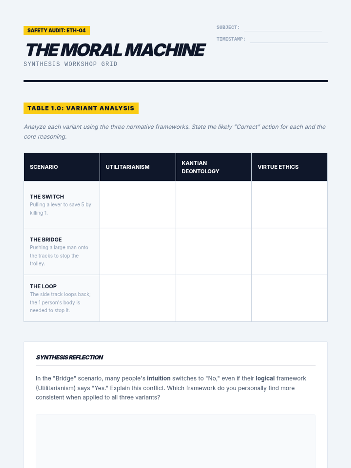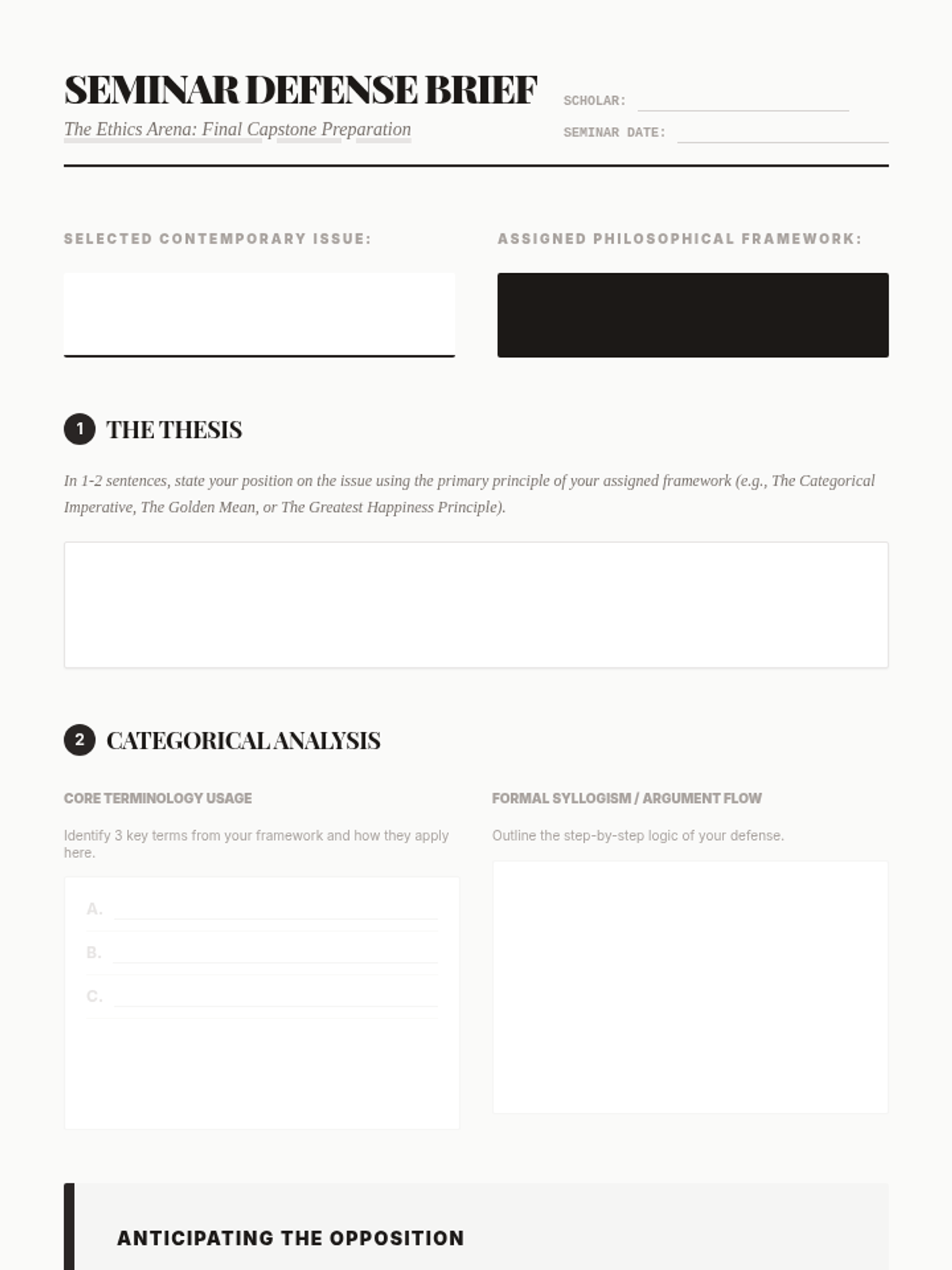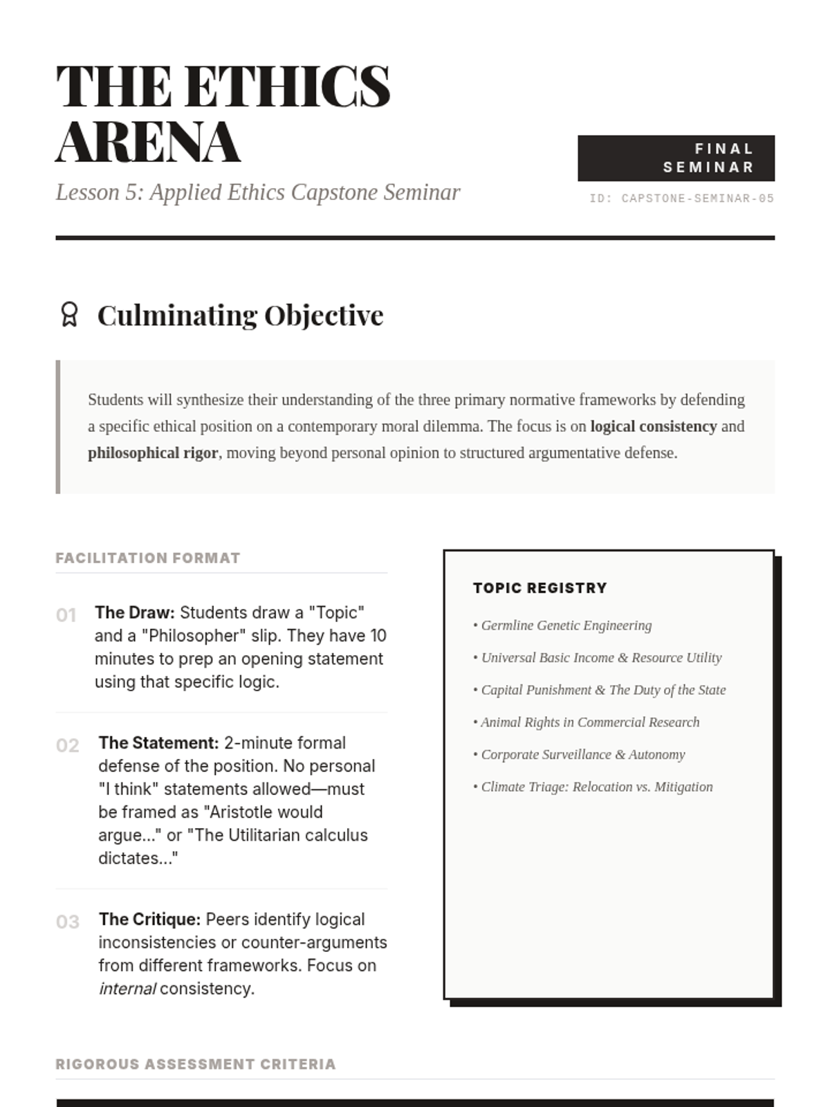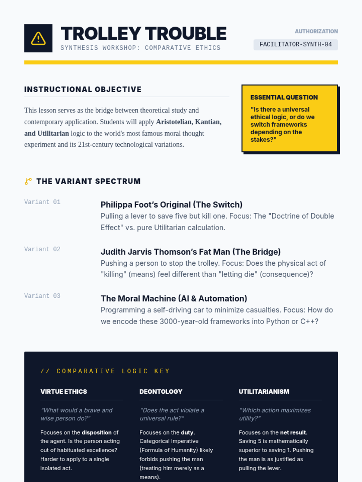 A rigorous undergraduate sequence exploring Western normative ethics through the lenses of Virtue Ethics, Deontology, and Utilitarianism, moving from theoretical foundations to contemporary applications.