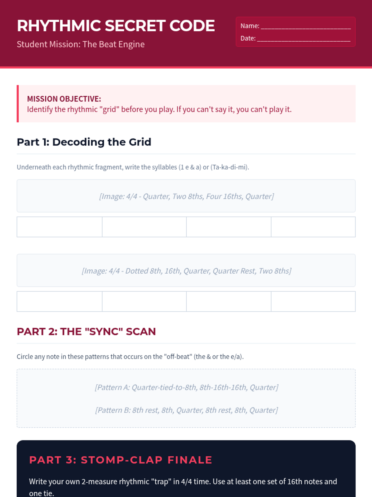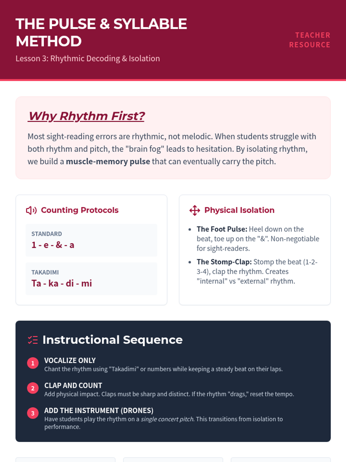 A comprehensive sequence for 9th-grade instrumentalists to master notation literacy and sight-reading through a systematic 'codebreaking' approach, focusing on scanning, pattern recognition, and rhythmic isolation.