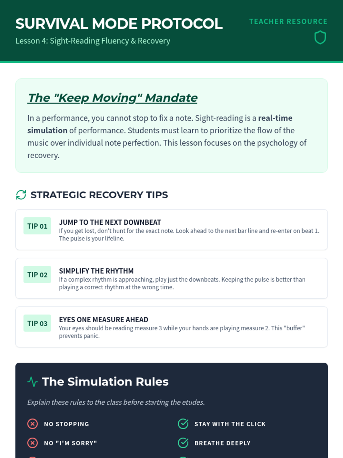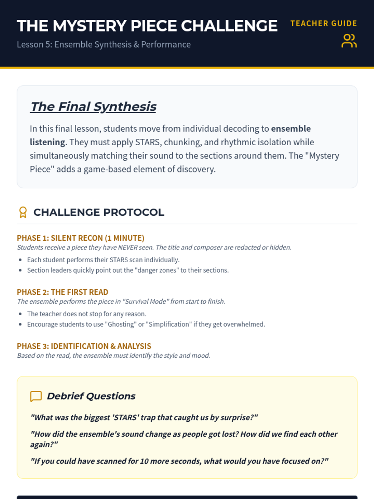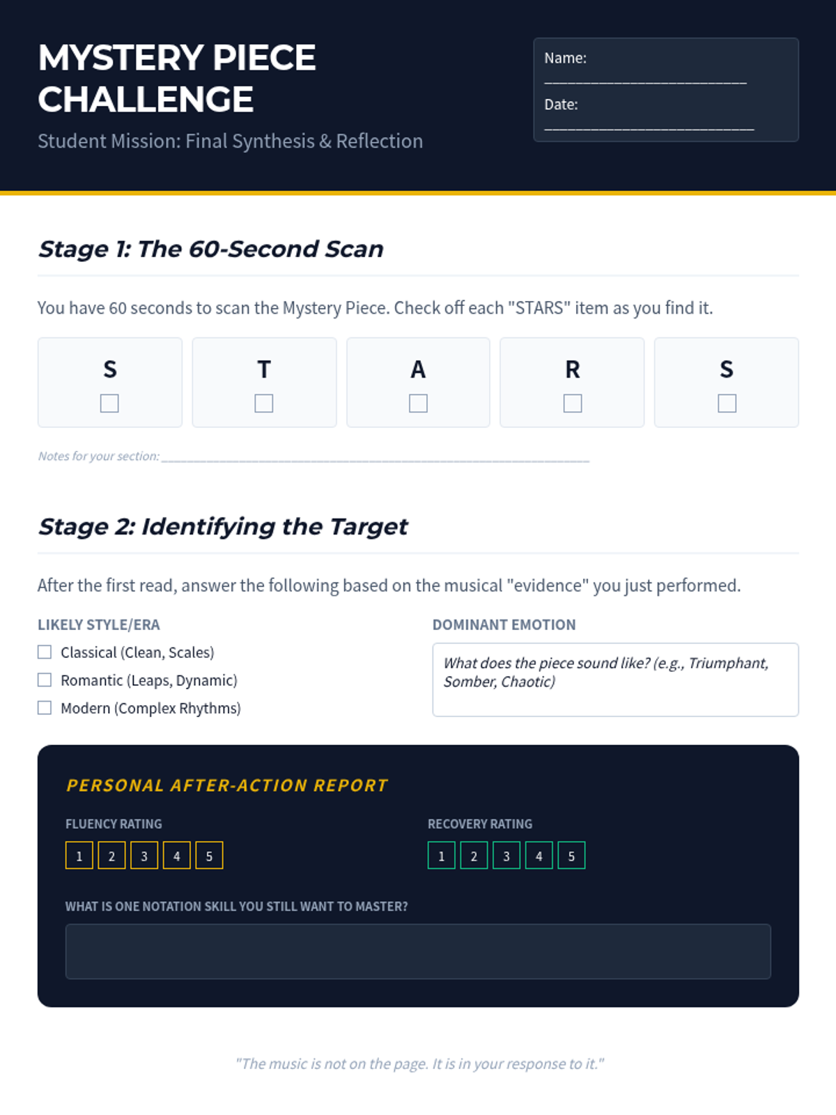 An 8-week intensive for band students to level up their music literacy, moving from basic note identification to fluently reading complex scores. Students will master ledger lines, key signatures, navigation markings, and ensemble sight-reading through a "Music Mission Control" theme.