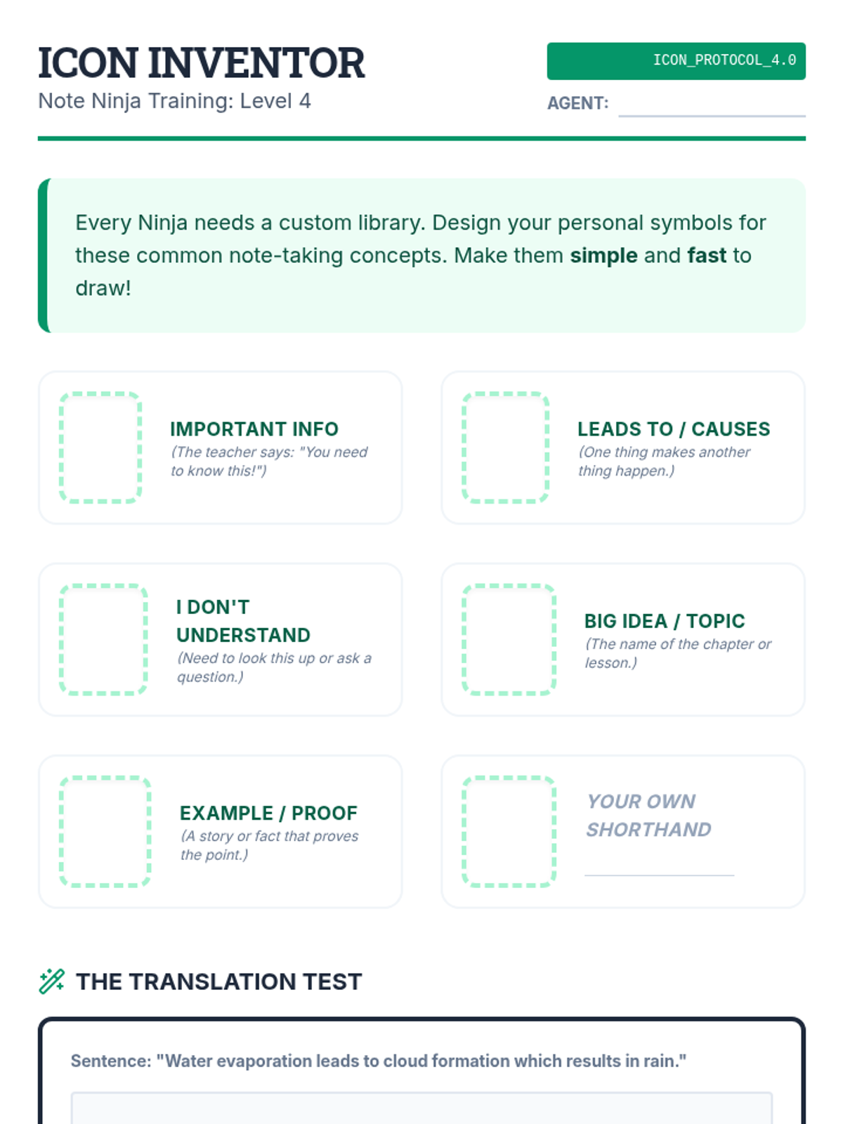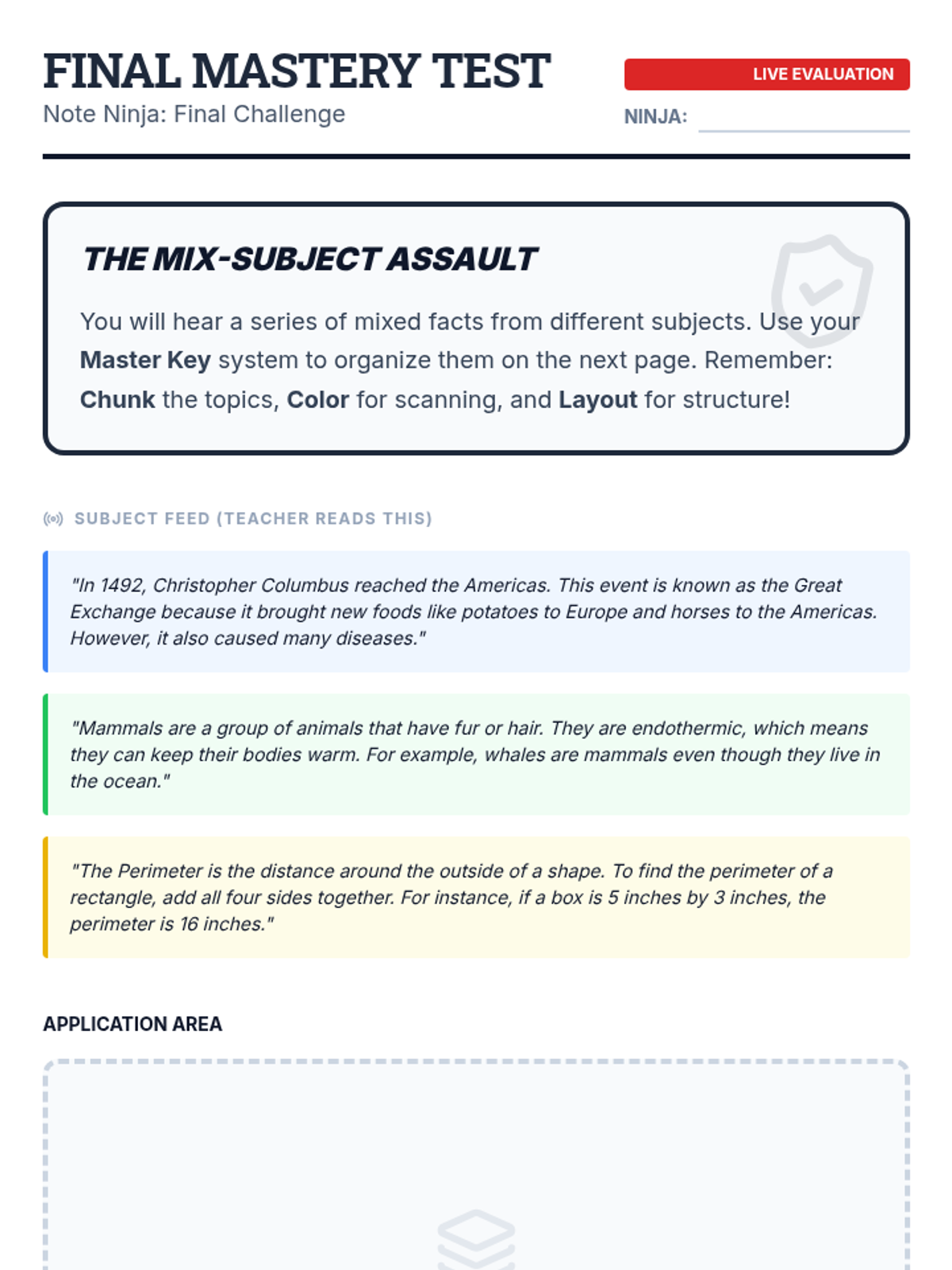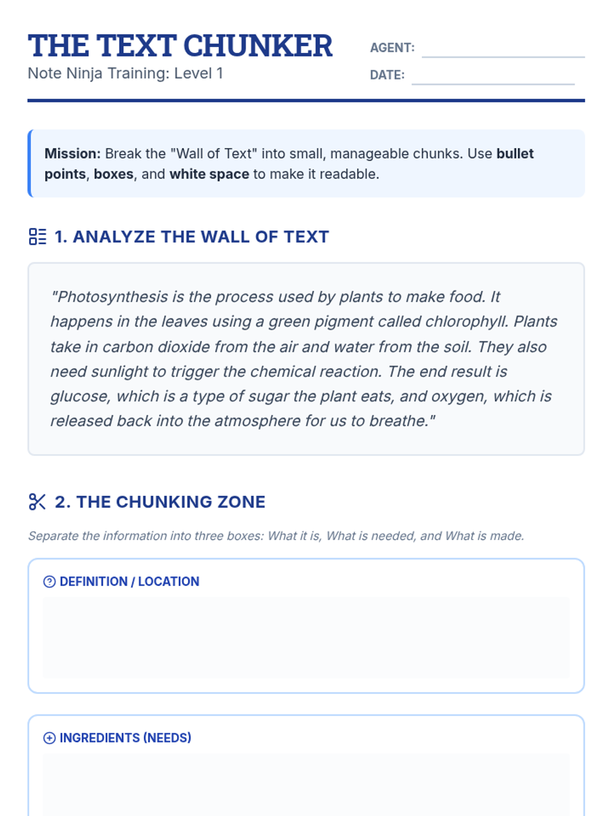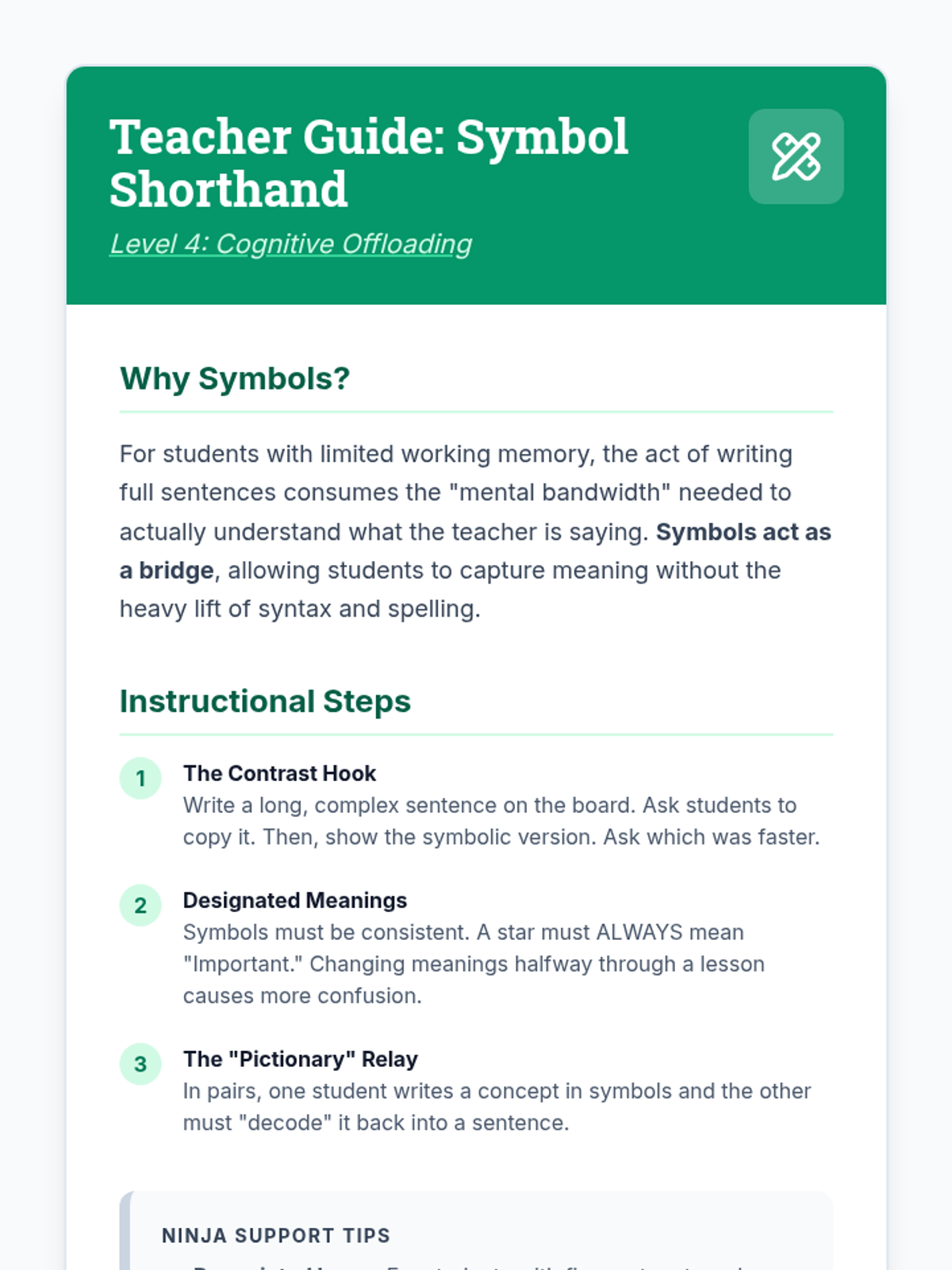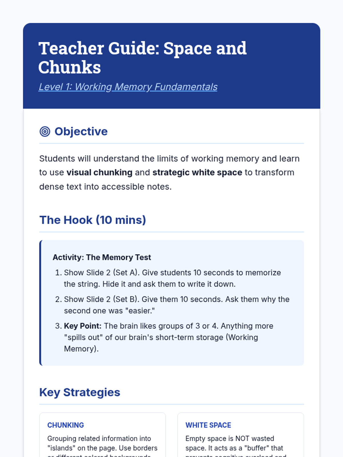 A specialized sequence for 6th-grade students with working memory challenges, focusing on visual organization strategies like chunking, color-coding, and spatial layouts to transform notes into accessible external memory aids.