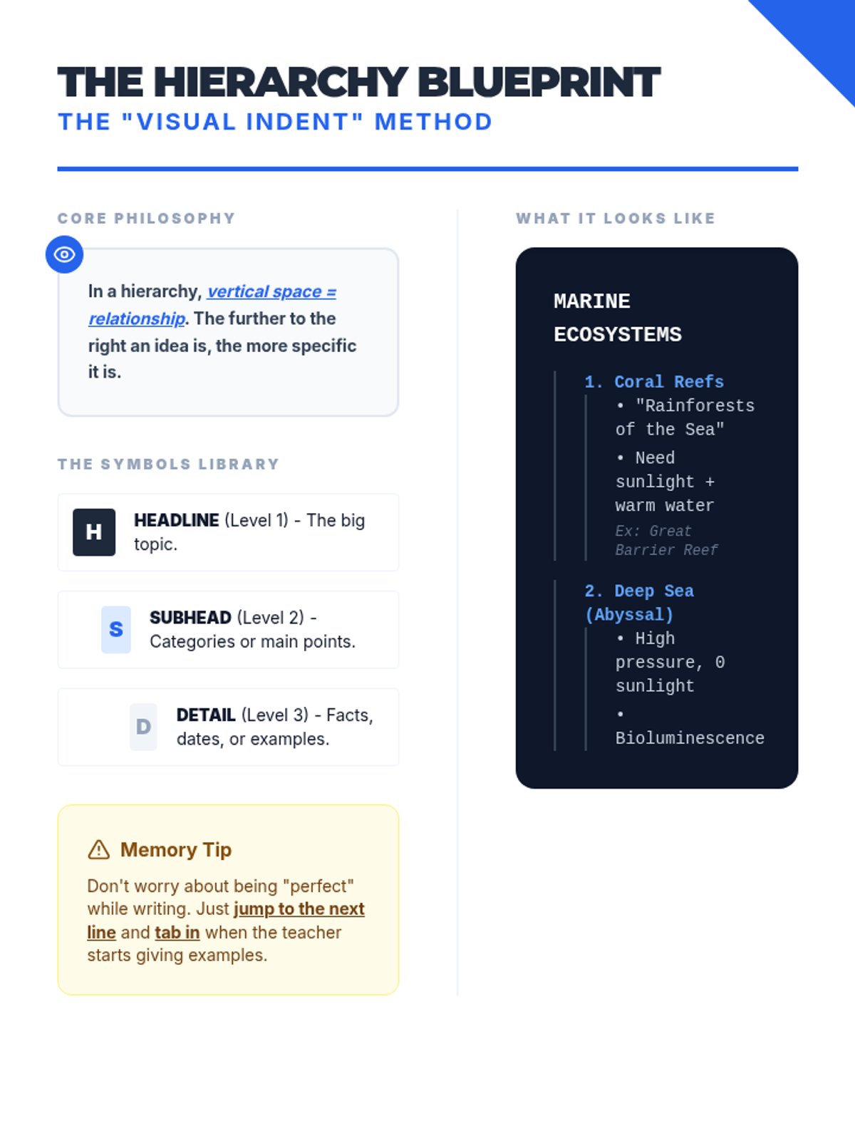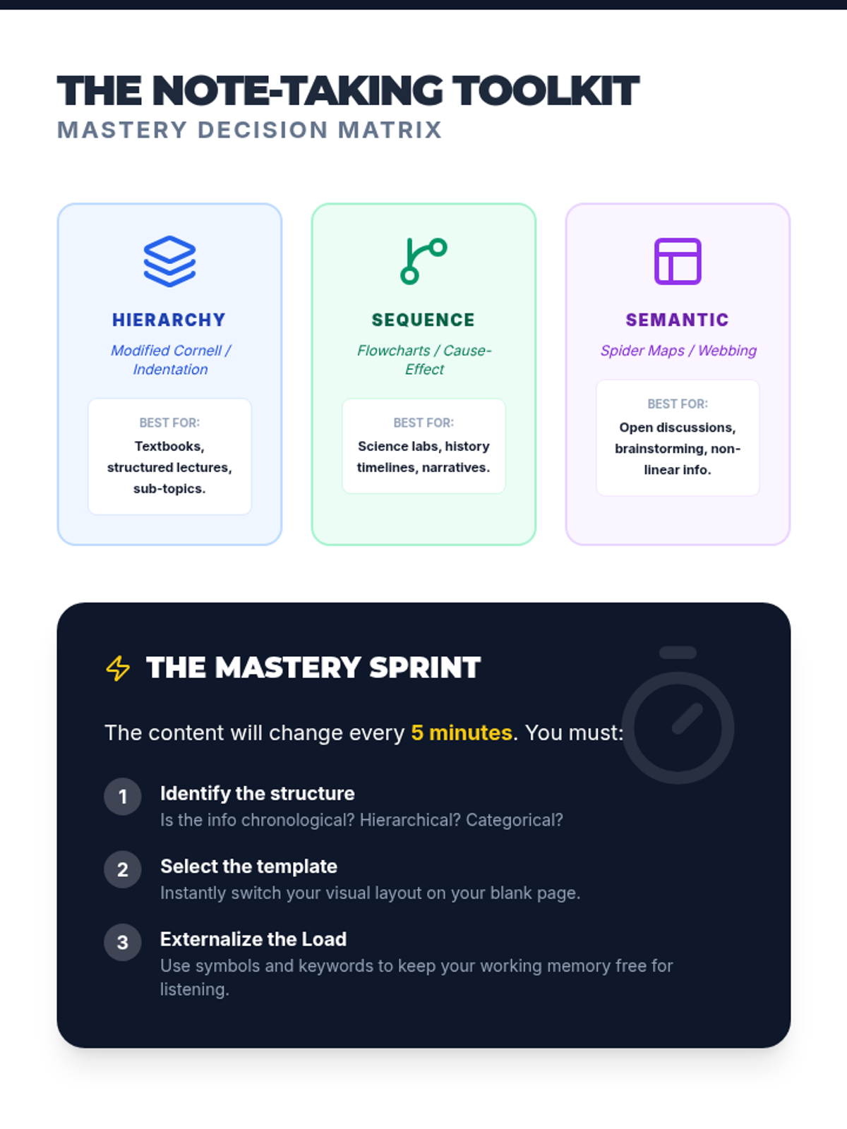 A 5-lesson sequence for 11th-grade students focusing on reducing cognitive load through specialized graphic organizer note-taking templates. Students move from understanding working memory limitations to fluidly selecting and applying hierarchical, sequential, and semantic models.