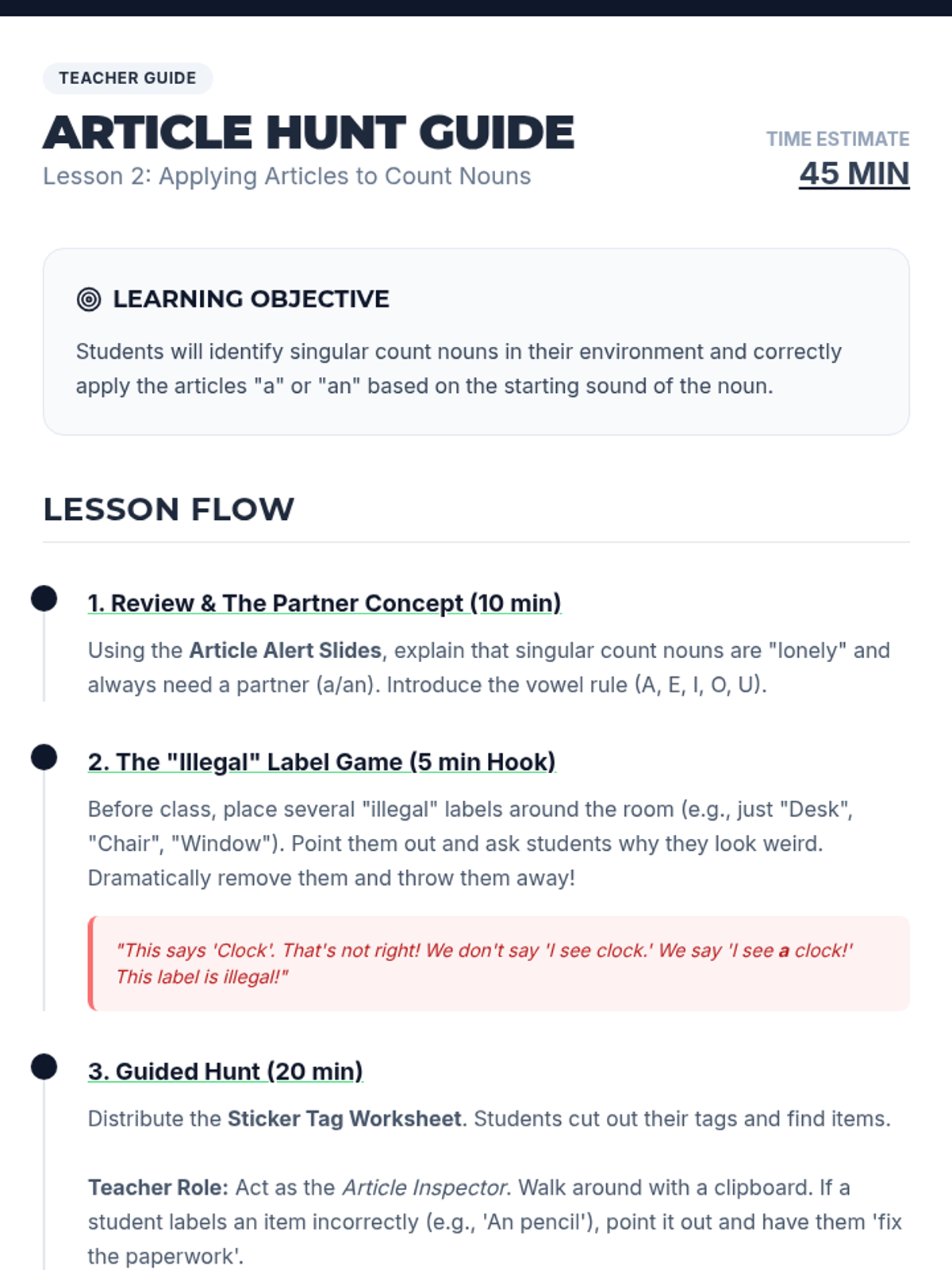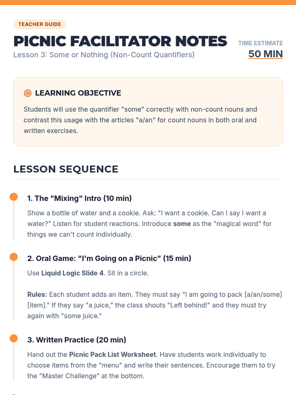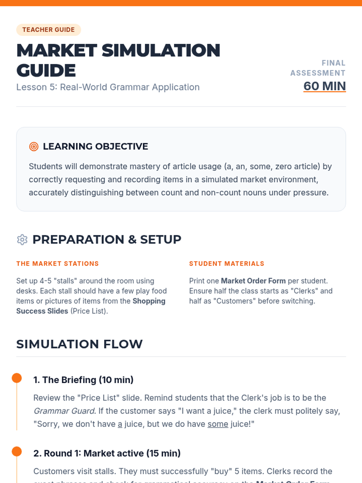 This sequence explores the relationship between articles and noun countability. Students distinguish between count and non-count nouns and learn the rules for using 'a', 'an', 'some', or no article, culminating in a market simulation.