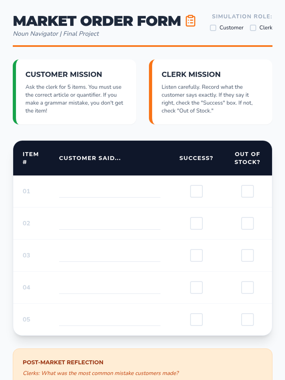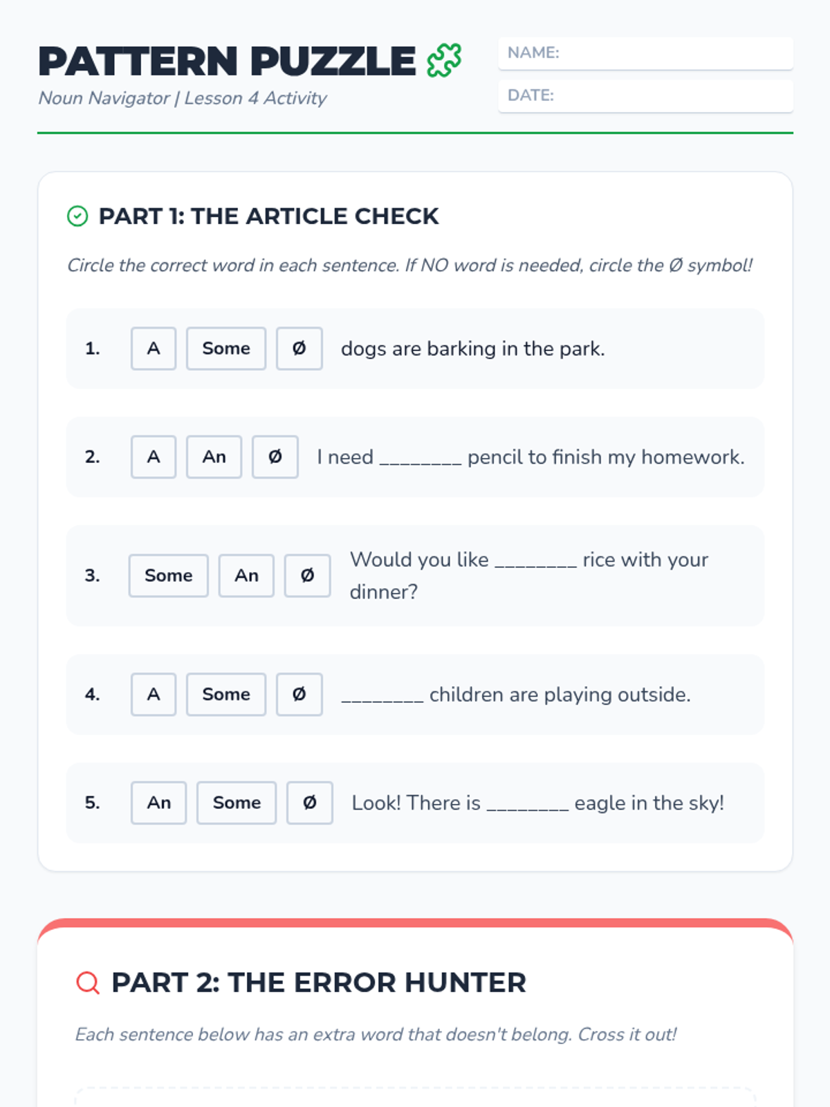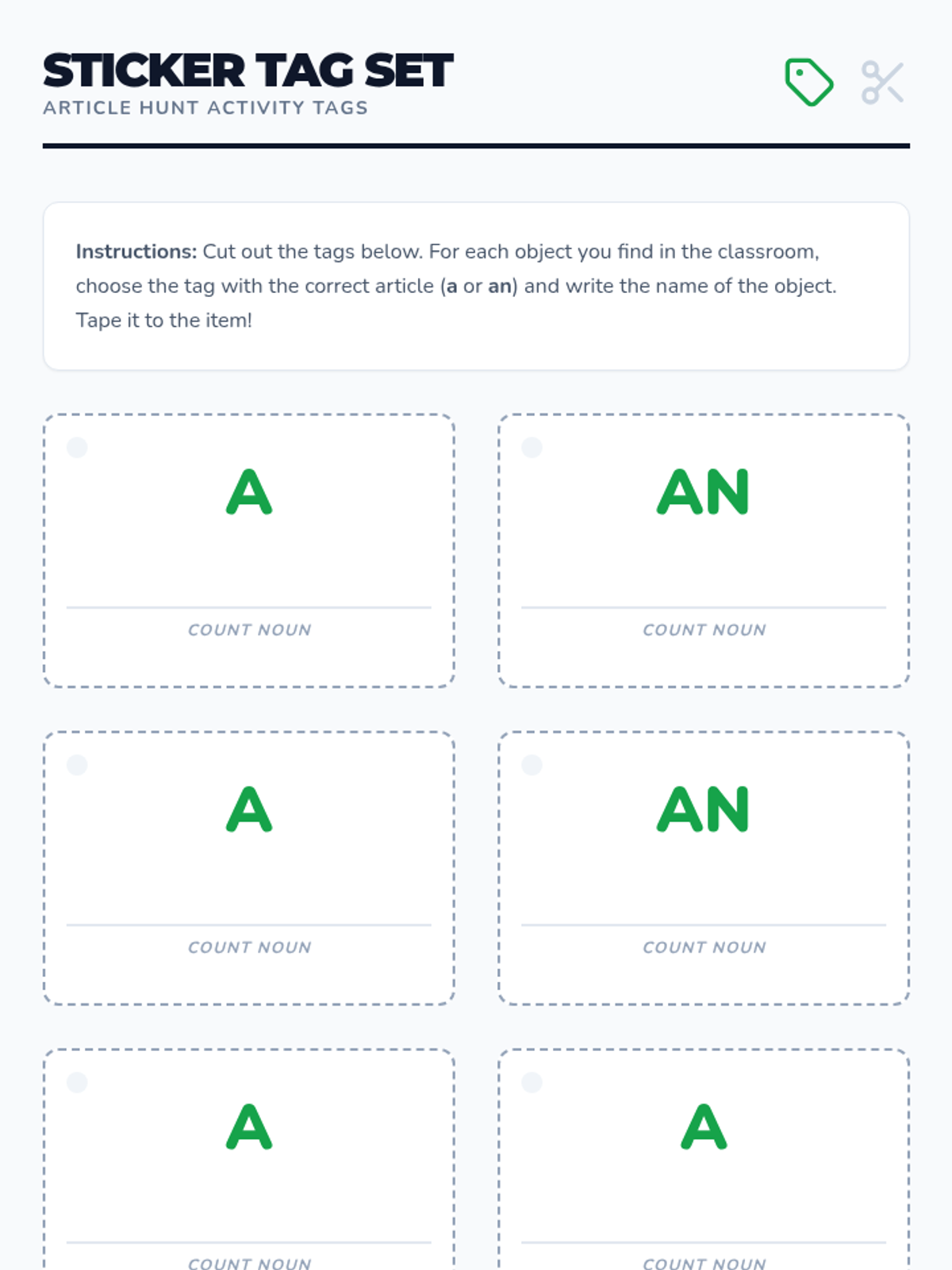 This sequence explores the relationship between articles and noun countability. Students distinguish between count and non-count nouns and learn the rules for using 'a', 'an', 'some', or no article, culminating in a market simulation.