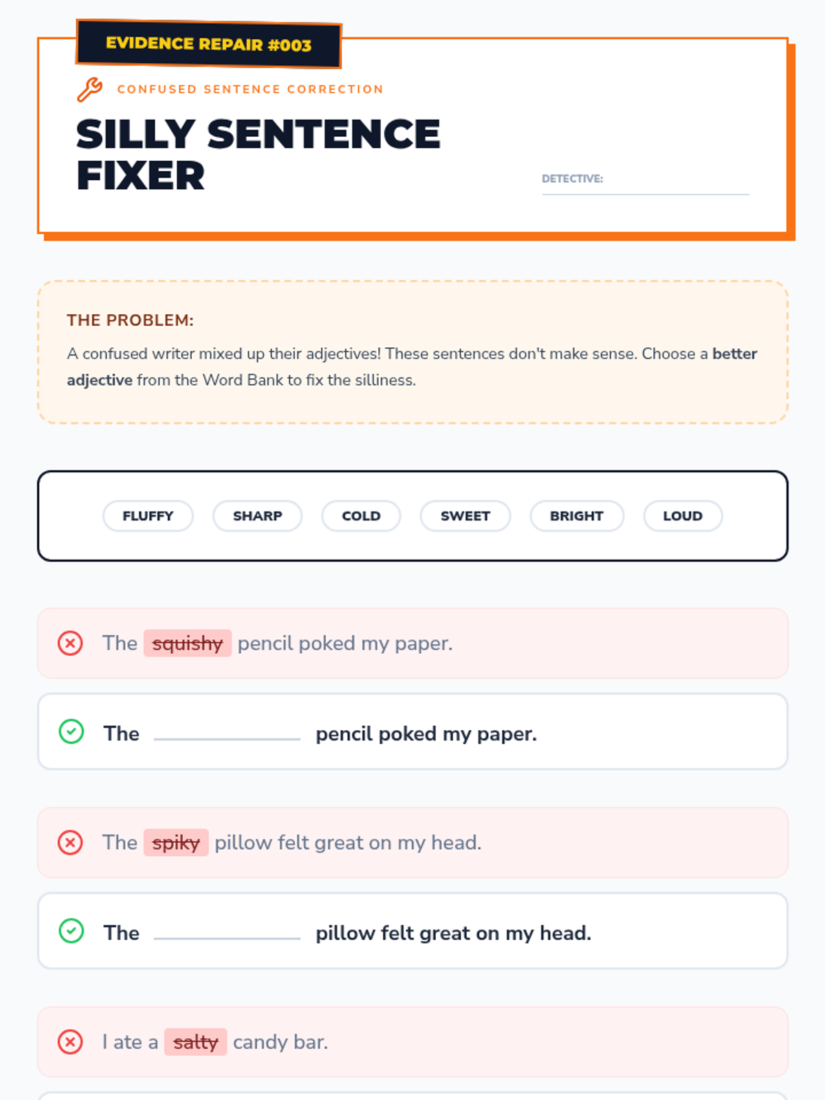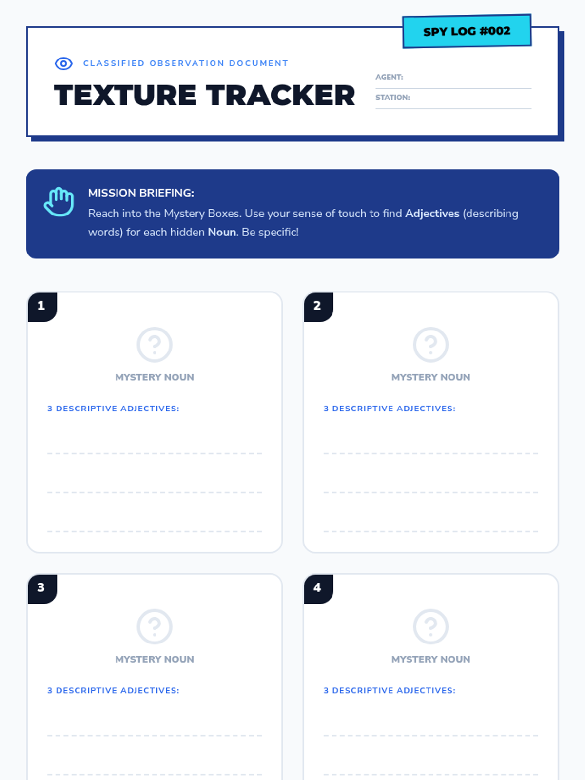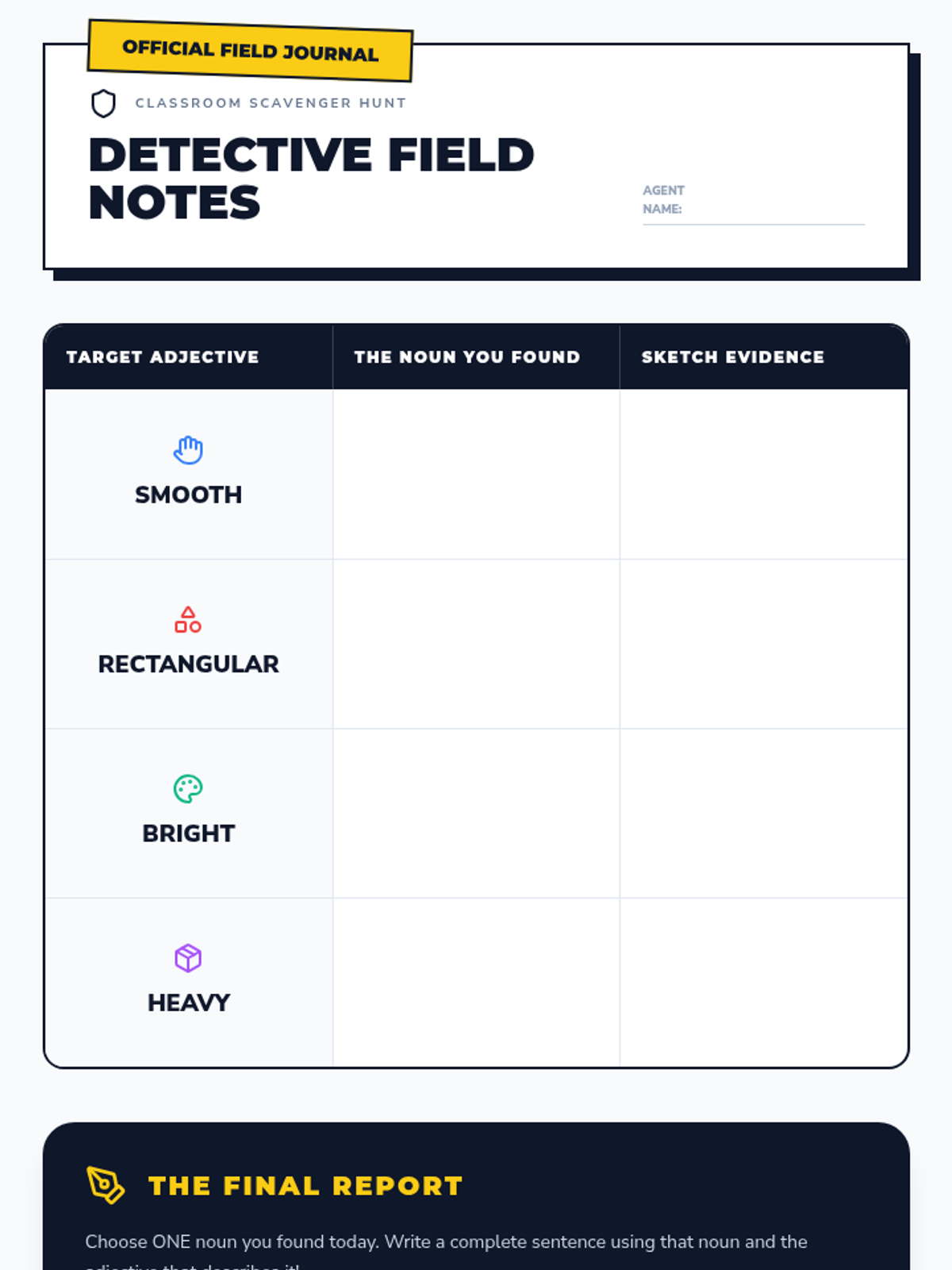 An inquiry-based sequence for 2nd-grade students to master nouns and adjectives through categorization, sensory exploration, and sentence expansion. Students act as 'Word Detectives' to identify naming words and describe them with precision.