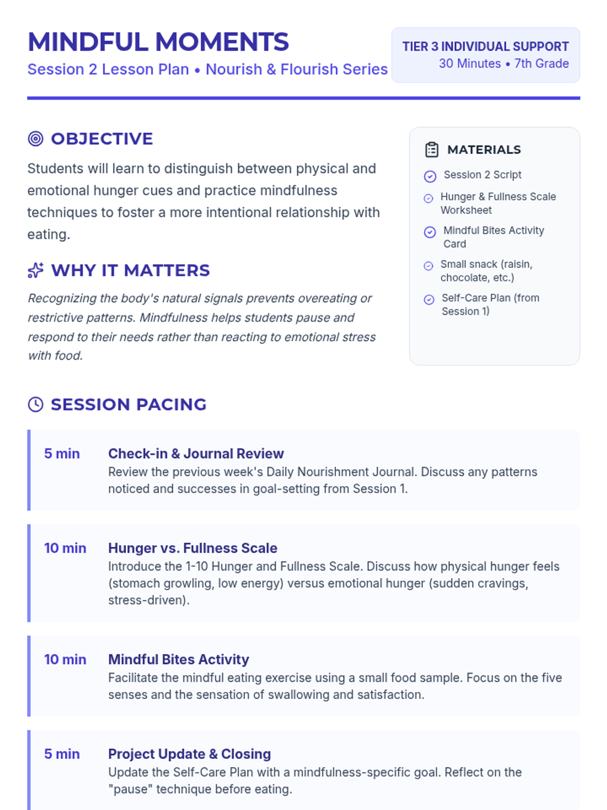 A 4-session individual support series for 7th-grade students focused on building positive eating habits, mindfulness, and self-care strategies to foster a healthy relationship with food and body.