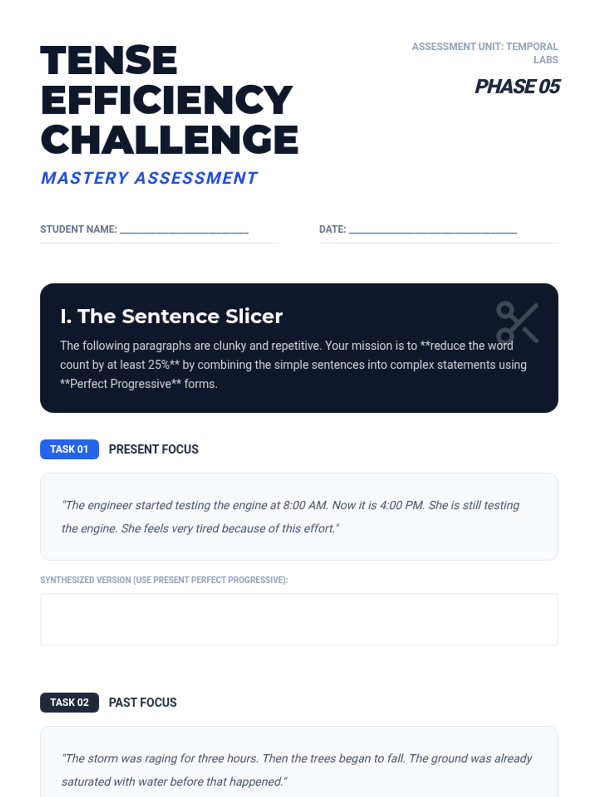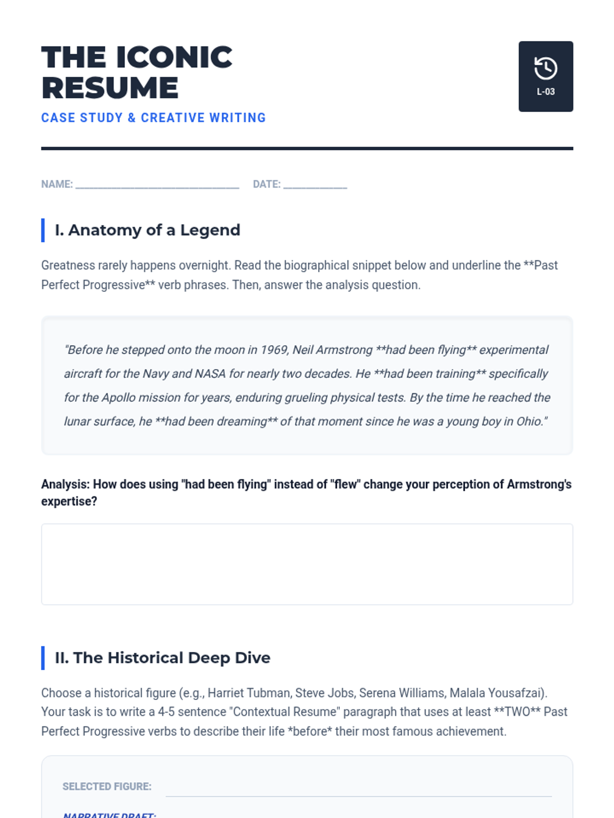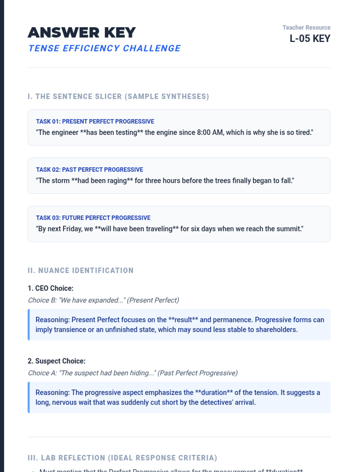 This advanced 11th-grade ELA sequence focuses on the nuances of perfect progressive verb forms. Students move from anatomical understanding of complex tenses to sophisticated application in biography, professional projections, and sentence-combining challenges.