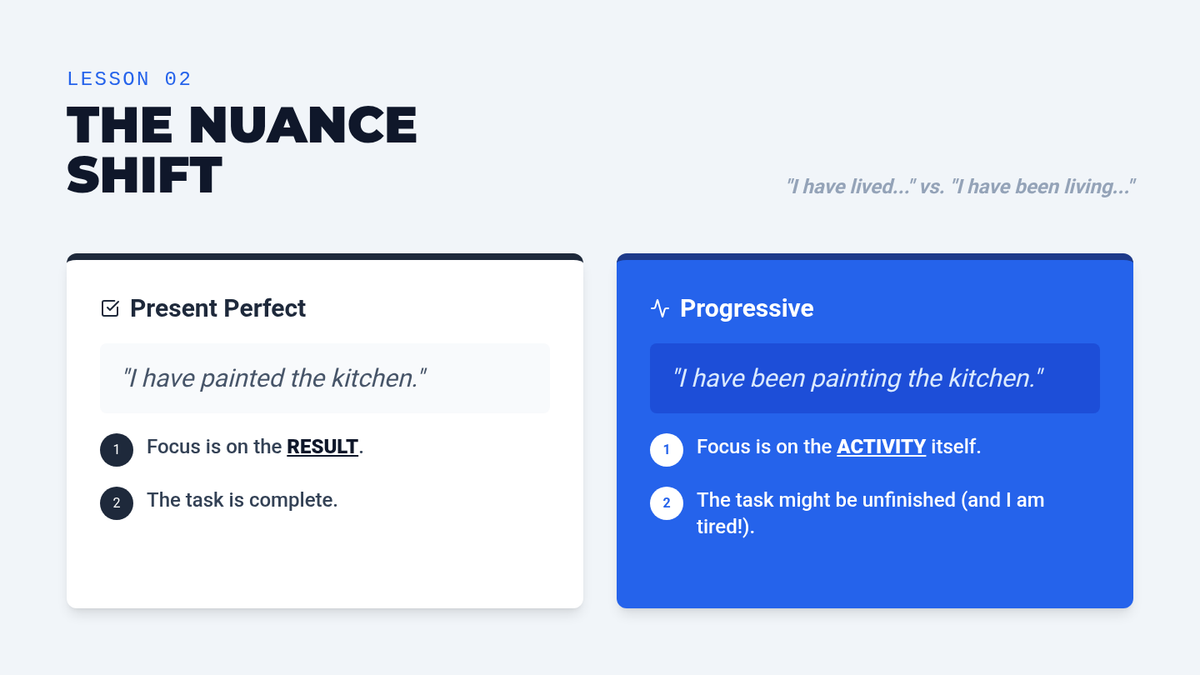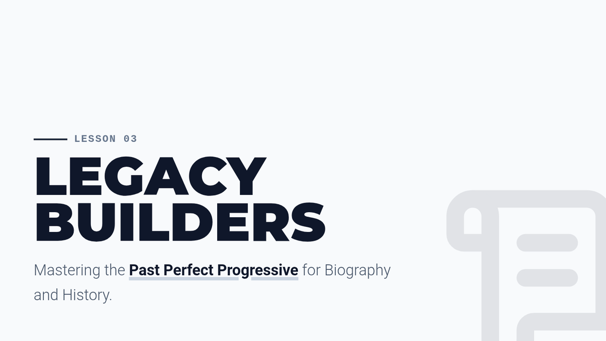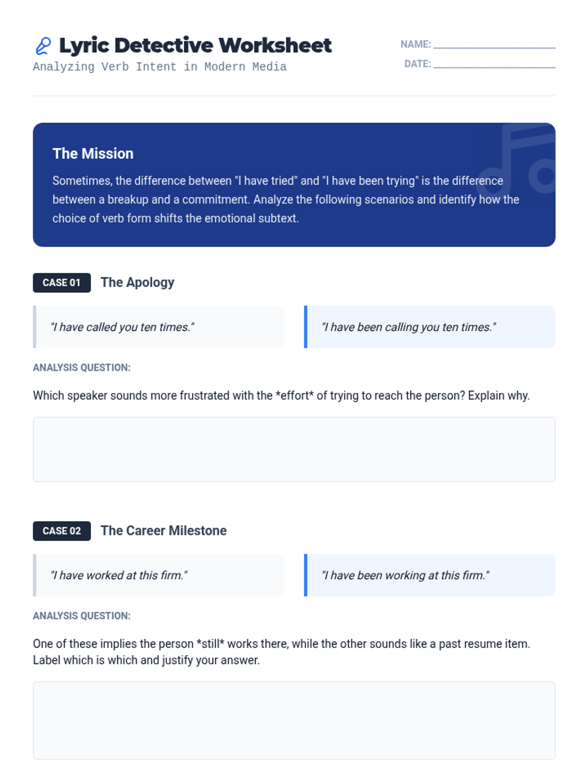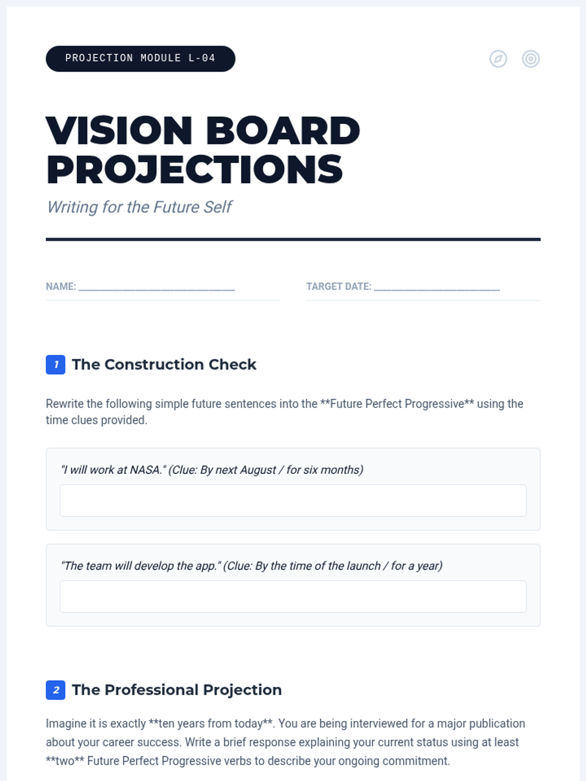 This advanced 11th-grade ELA sequence focuses on the nuances of perfect progressive verb forms. Students move from anatomical understanding of complex tenses to sophisticated application in biography, professional projections, and sentence-combining challenges.