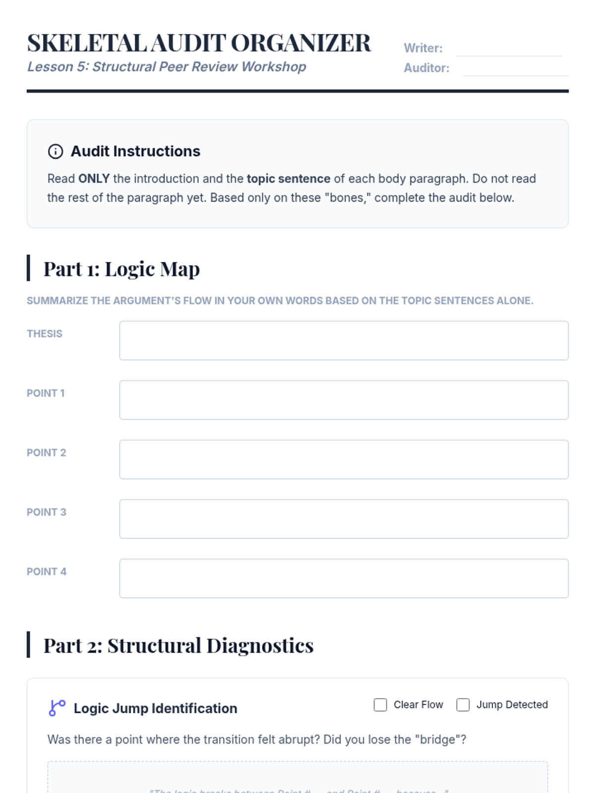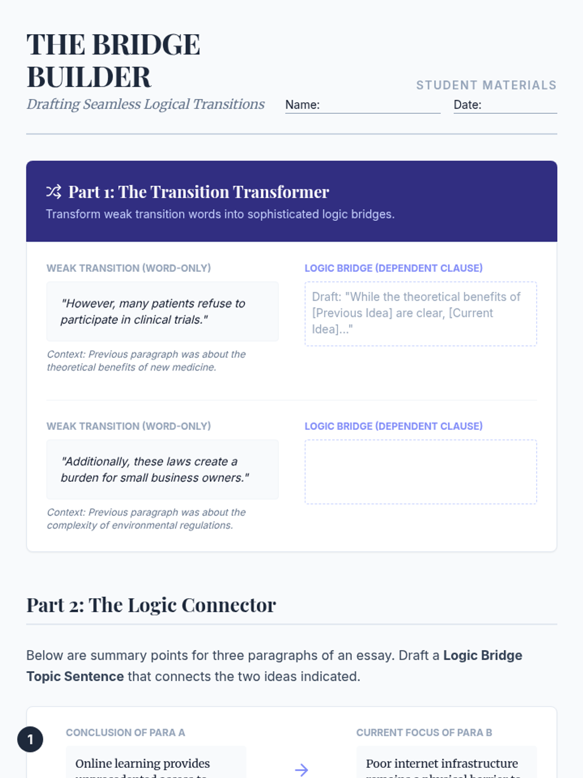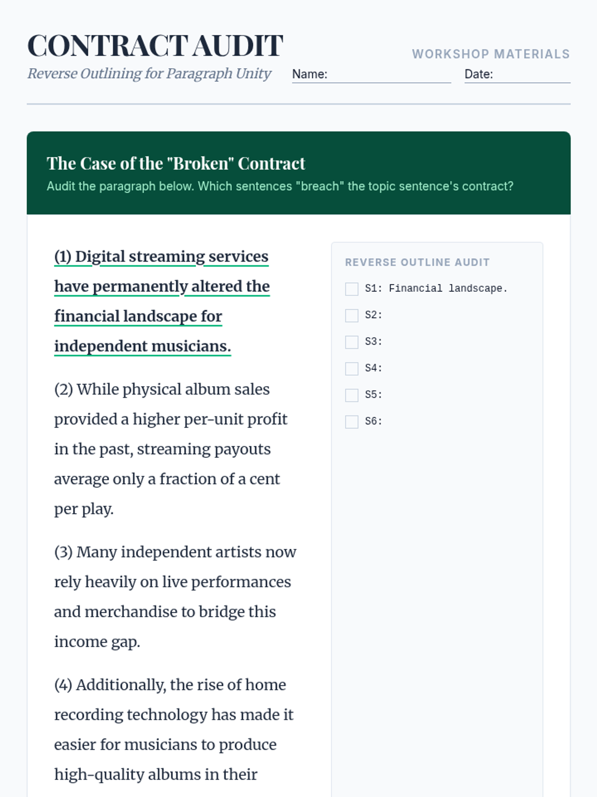 A comprehensive sequence for undergraduate students focused on mastering the structural and rhetorical functions of topic sentences in academic writing. Students progress from analyzing scholarly excerpts to constructing complex, multi-clause sentences that manage transitions and counter-arguments.
