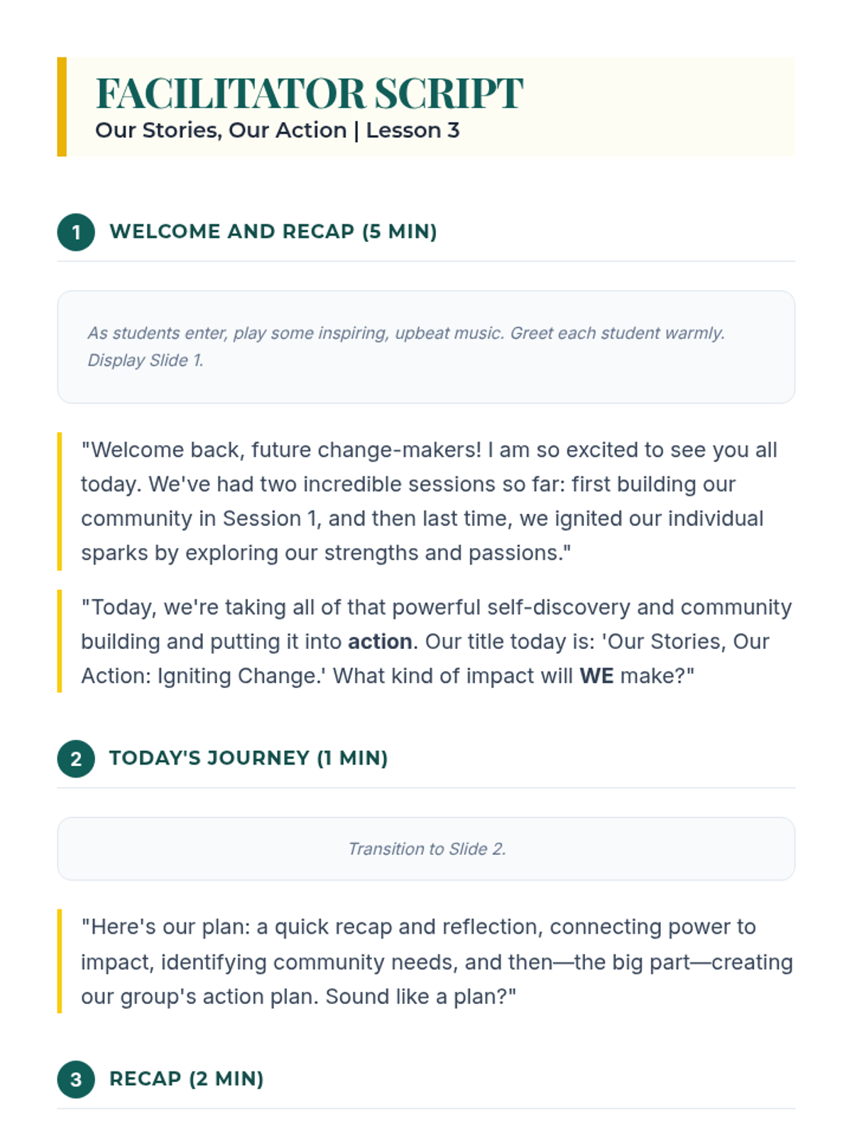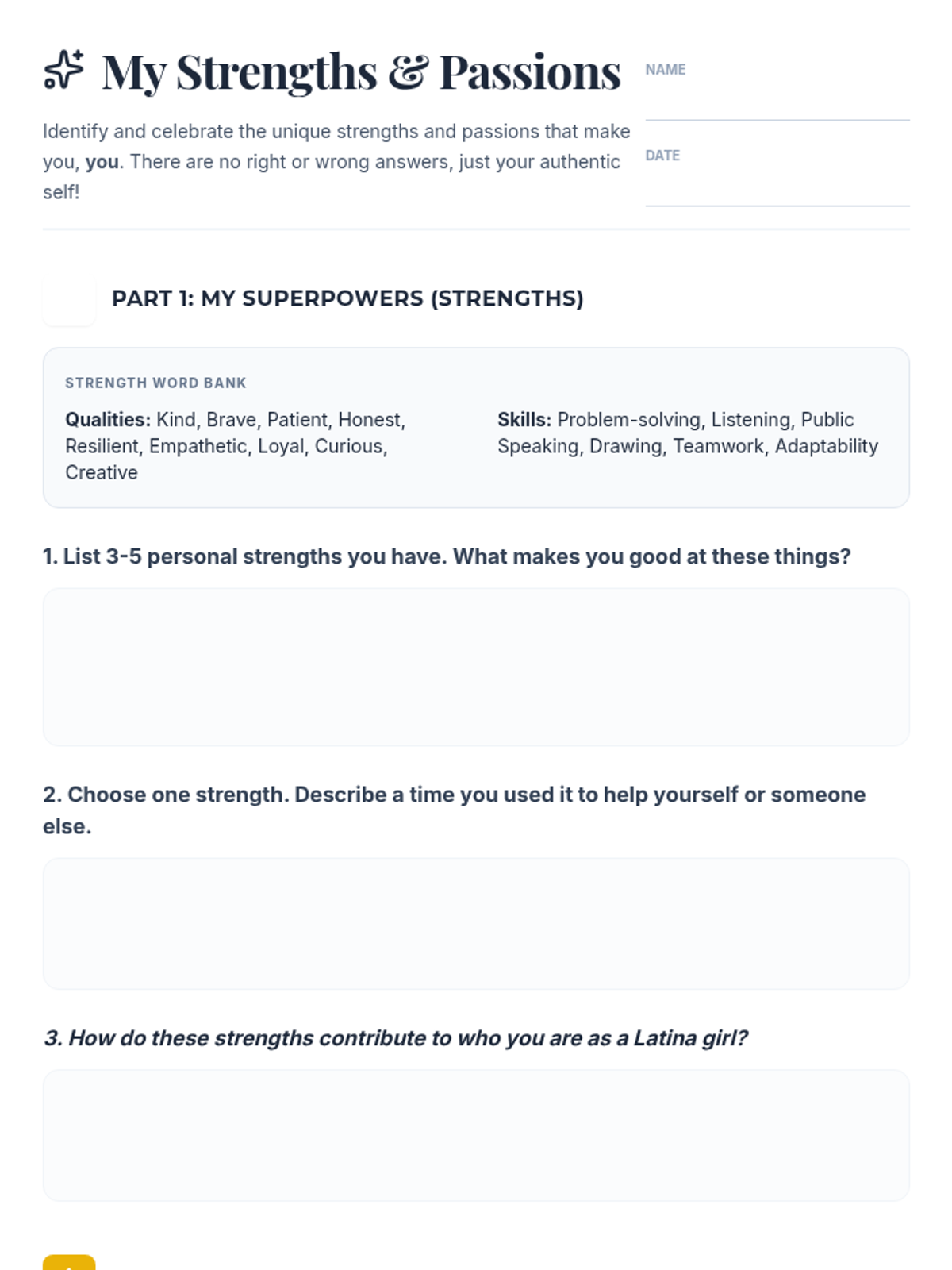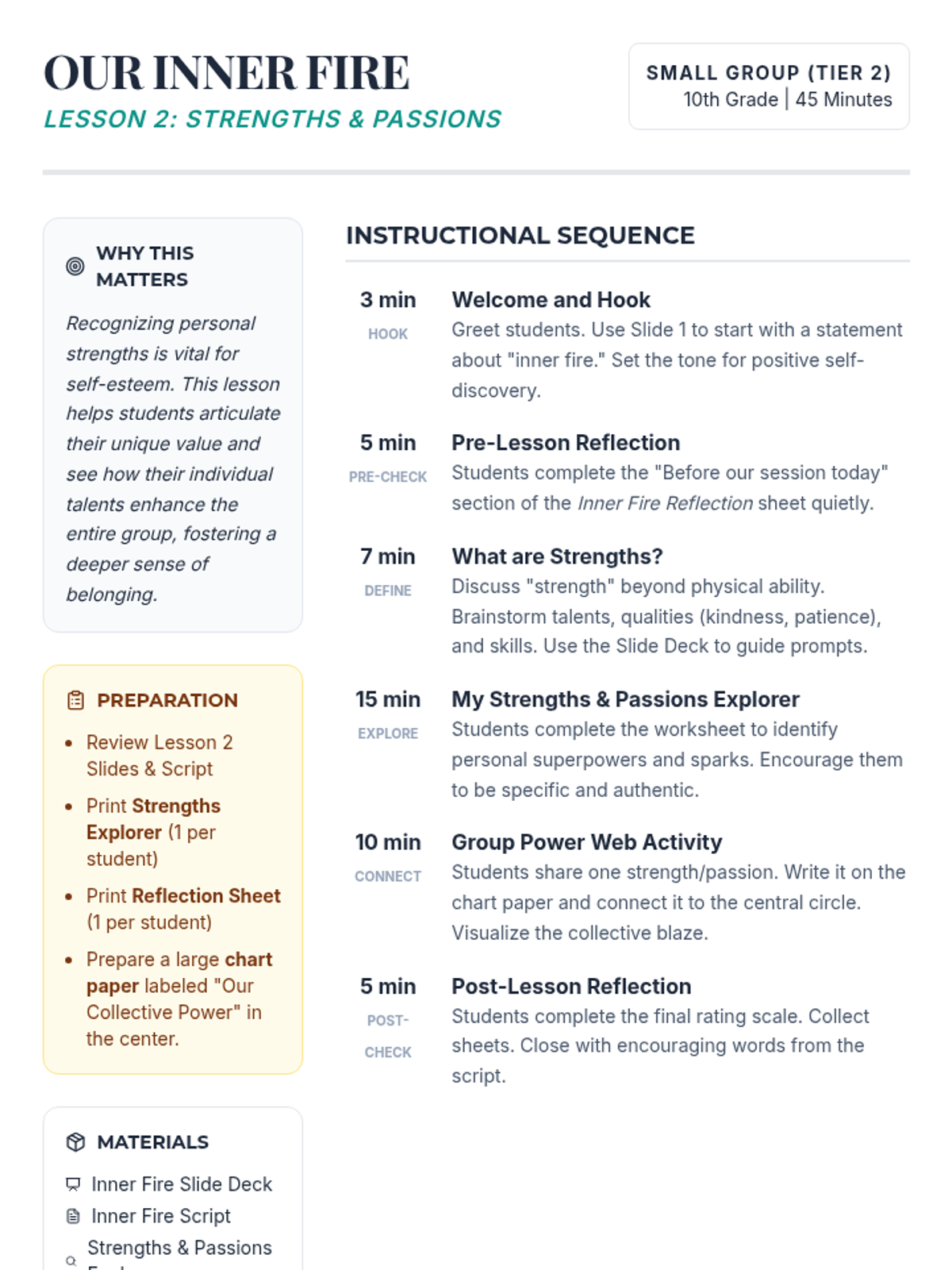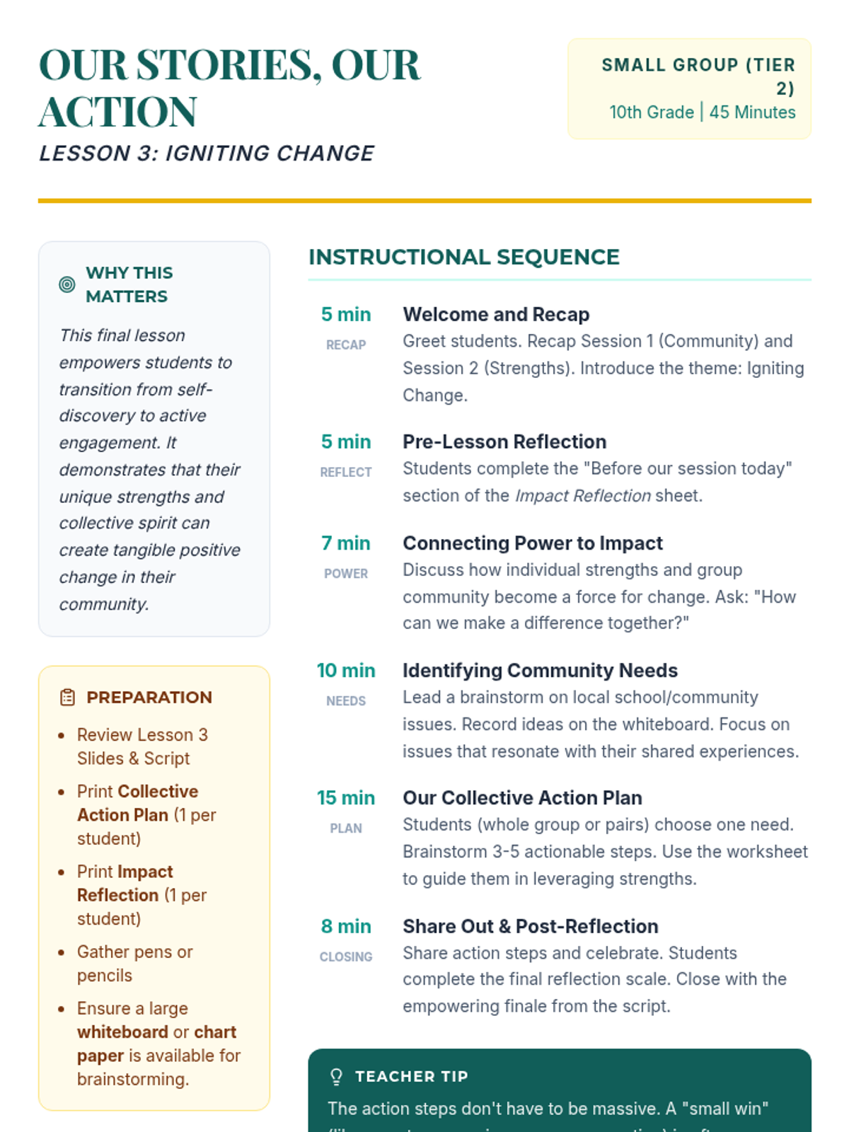 A three-session empowerment sequence for 10th-grade Latina students, focusing on community building, individual strengths, and collective social action. Students transition from personal discovery to creating tangible community impact.