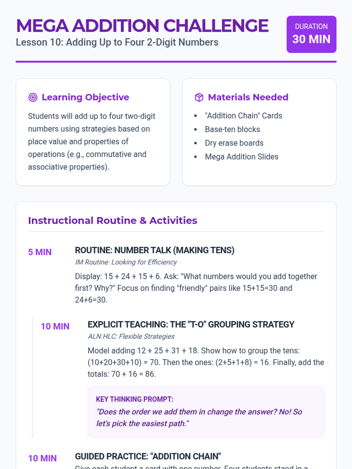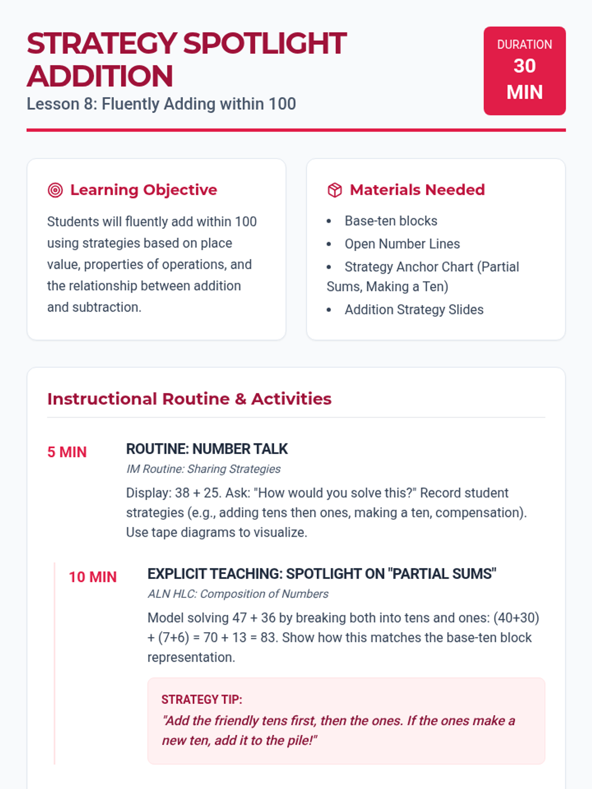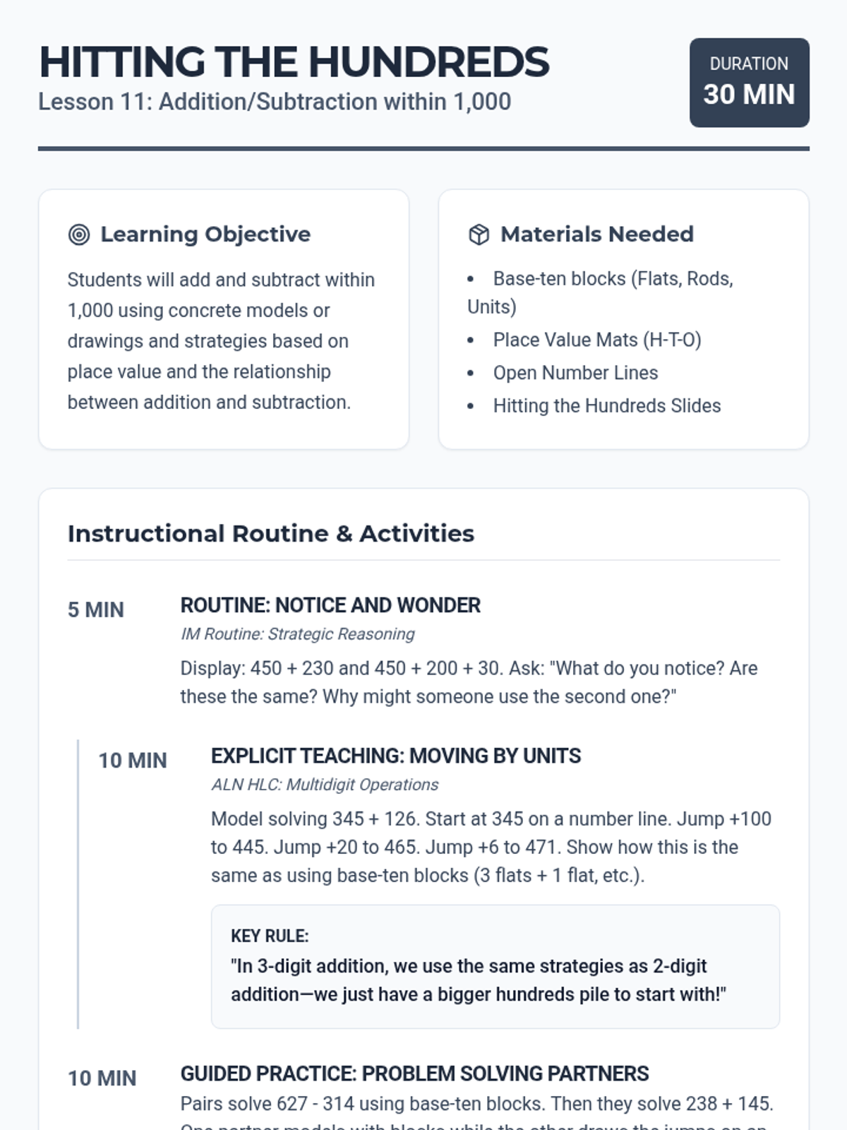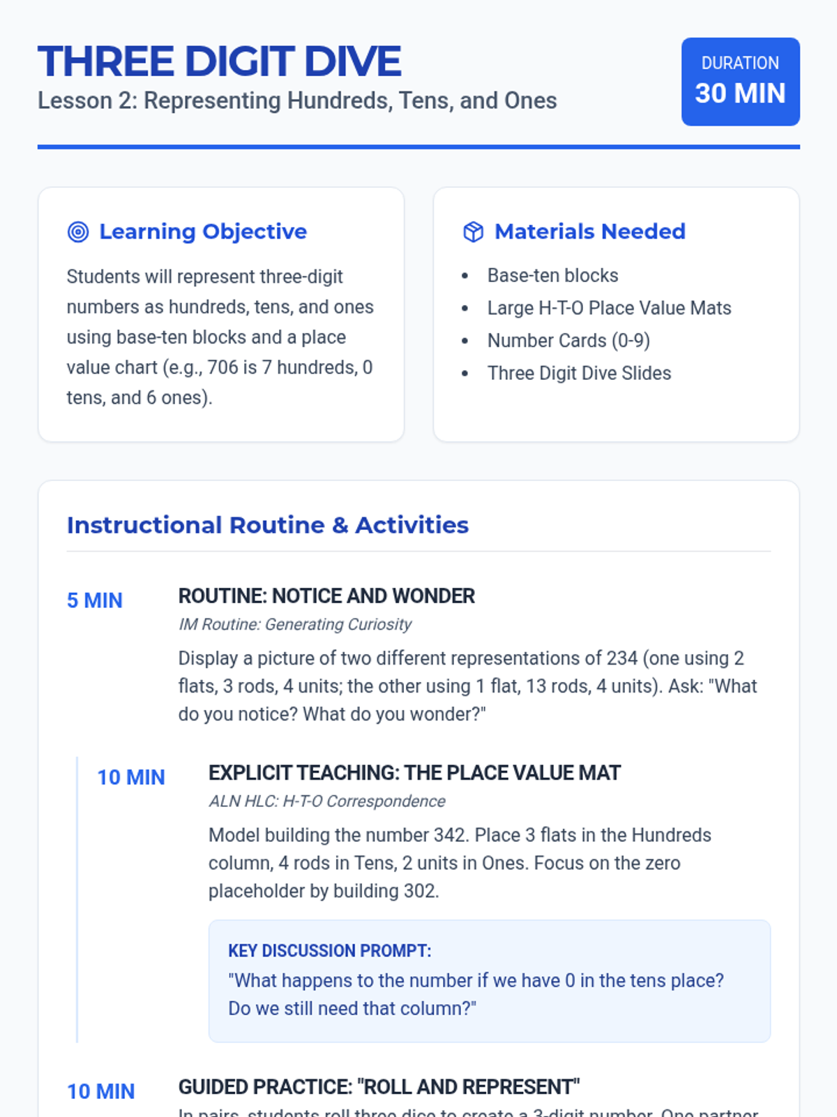 A comprehensive 12-lesson Tier 2 intervention sequence for second grade, focusing on place value and addition/subtraction strategies (2.NBT.A and 2.NBT.B). Each lesson follows a 30-minute structure using ALN High Leverage Concepts and IM-inspired instructional routines.