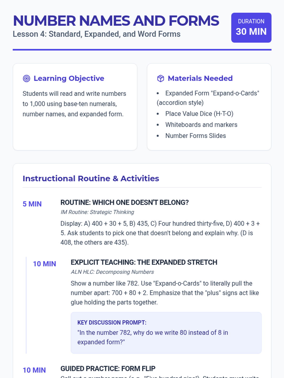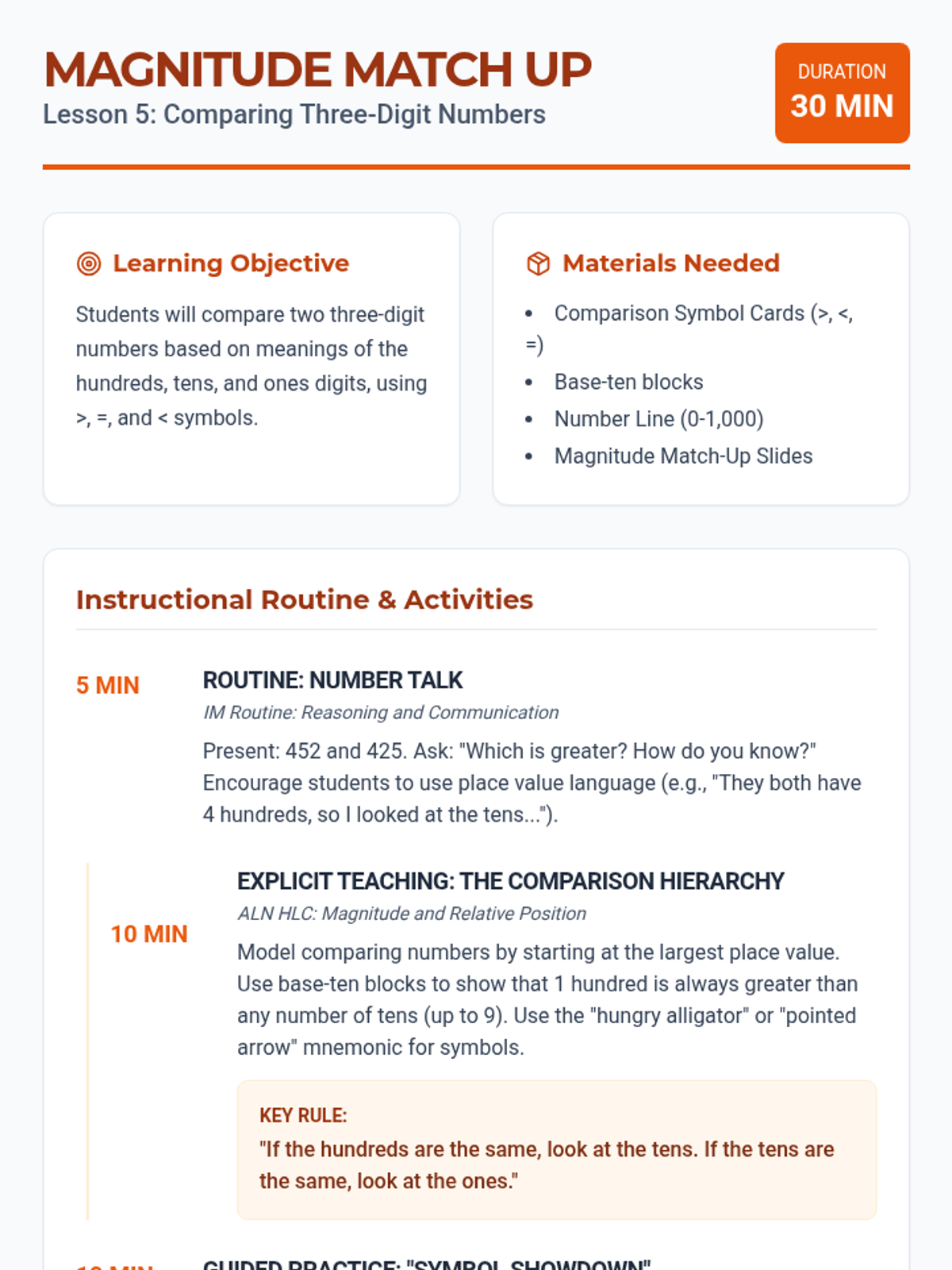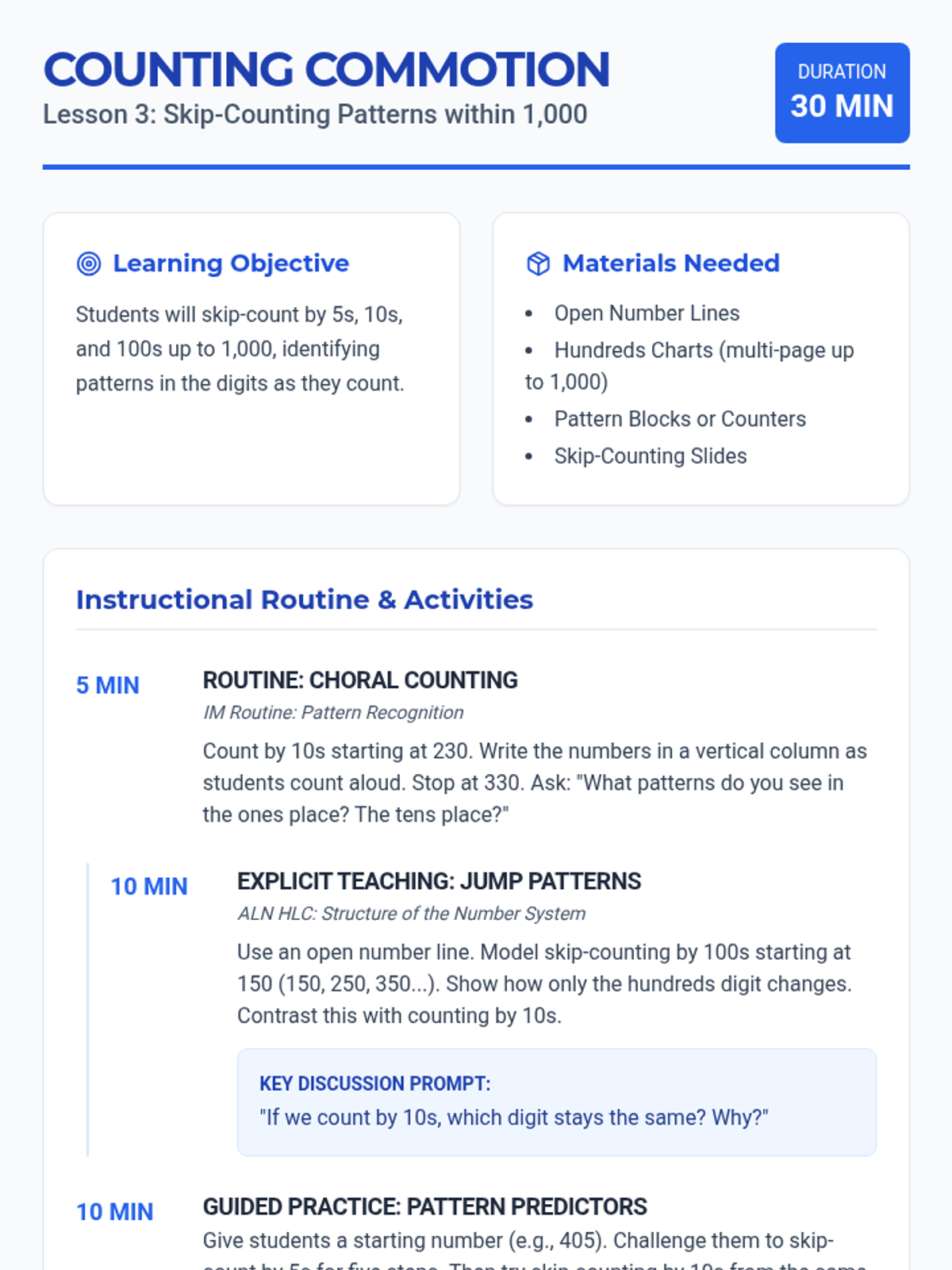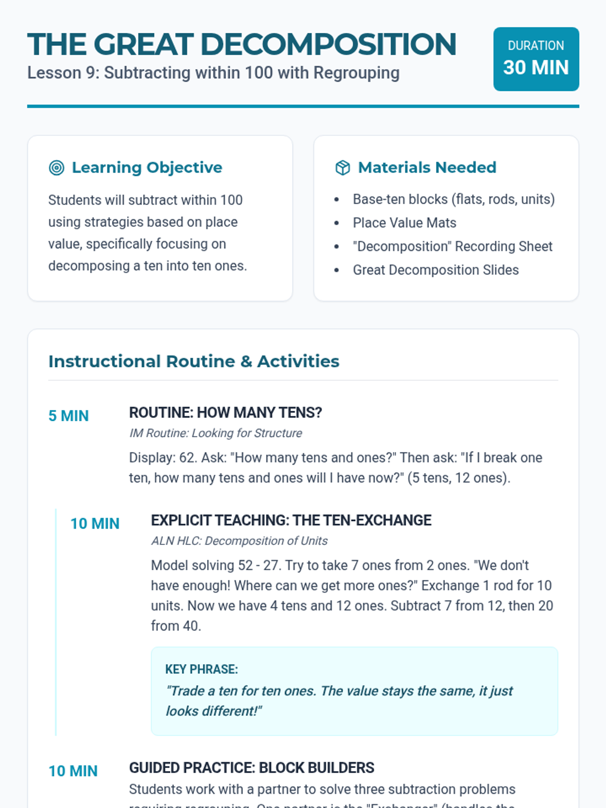 A comprehensive 12-lesson Tier 2 intervention sequence for second grade, focusing on place value and addition/subtraction strategies (2.NBT.A and 2.NBT.B). Each lesson follows a 30-minute structure using ALN High Leverage Concepts and IM-inspired instructional routines.