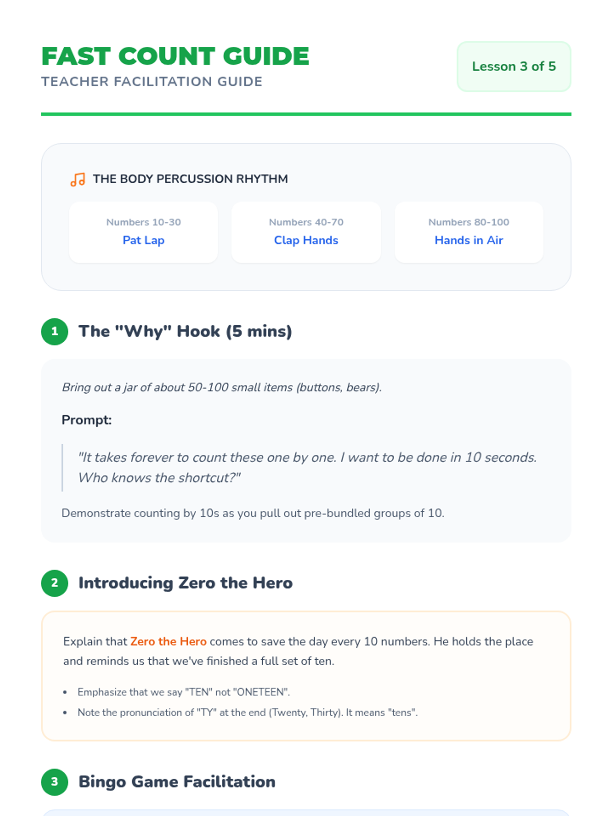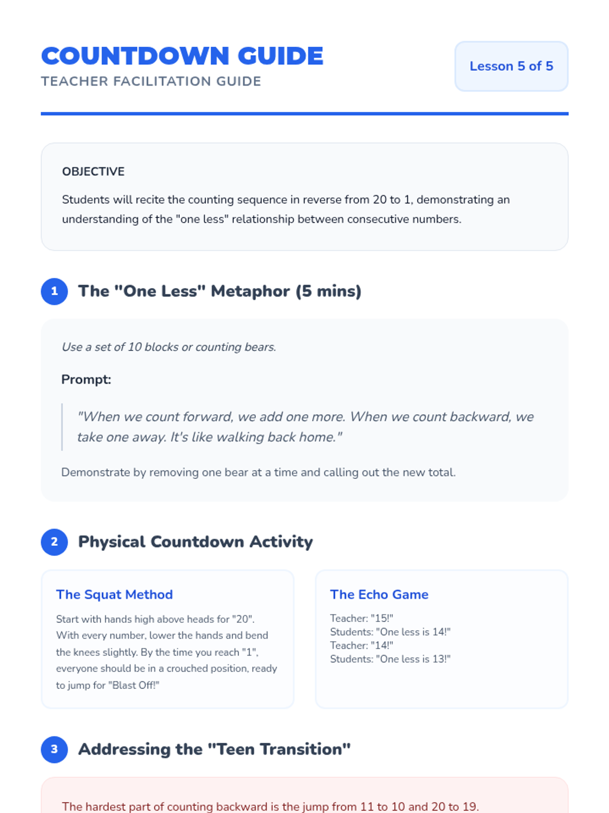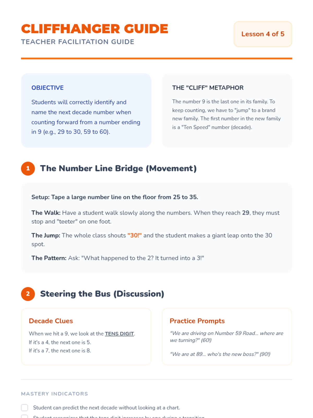 A Kindergarten math sequence focused on building oral counting fluency from 1 to 100 and backward from 20. Students explore number patterns using the hundred chart, master tricky teen numbers, and navigate decade transitions through games and movement.