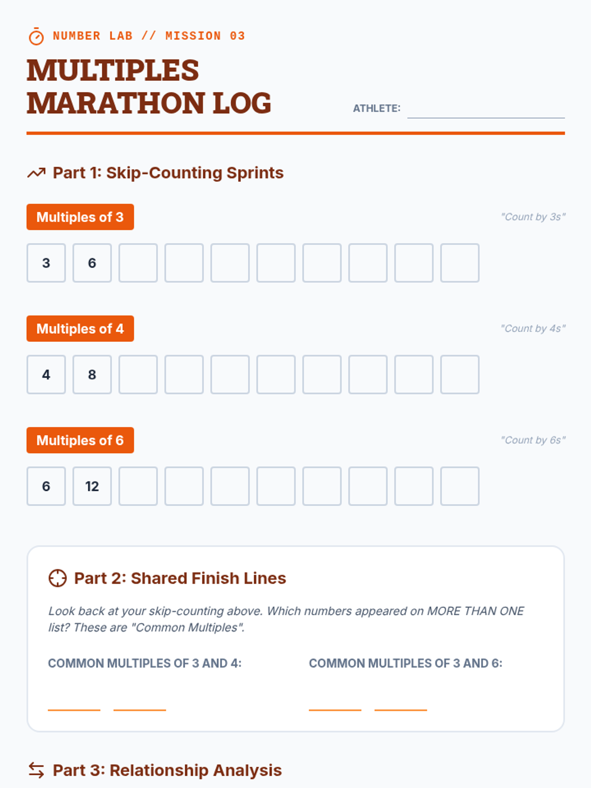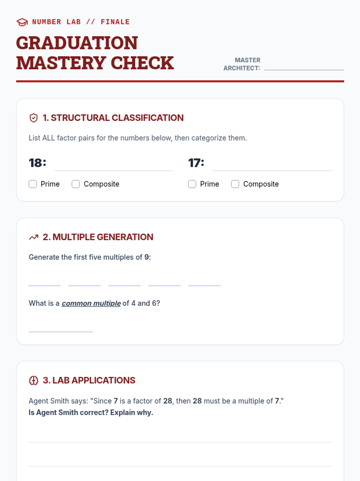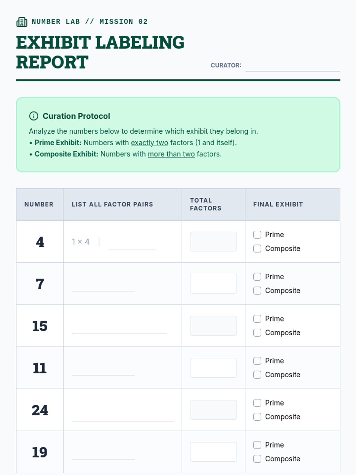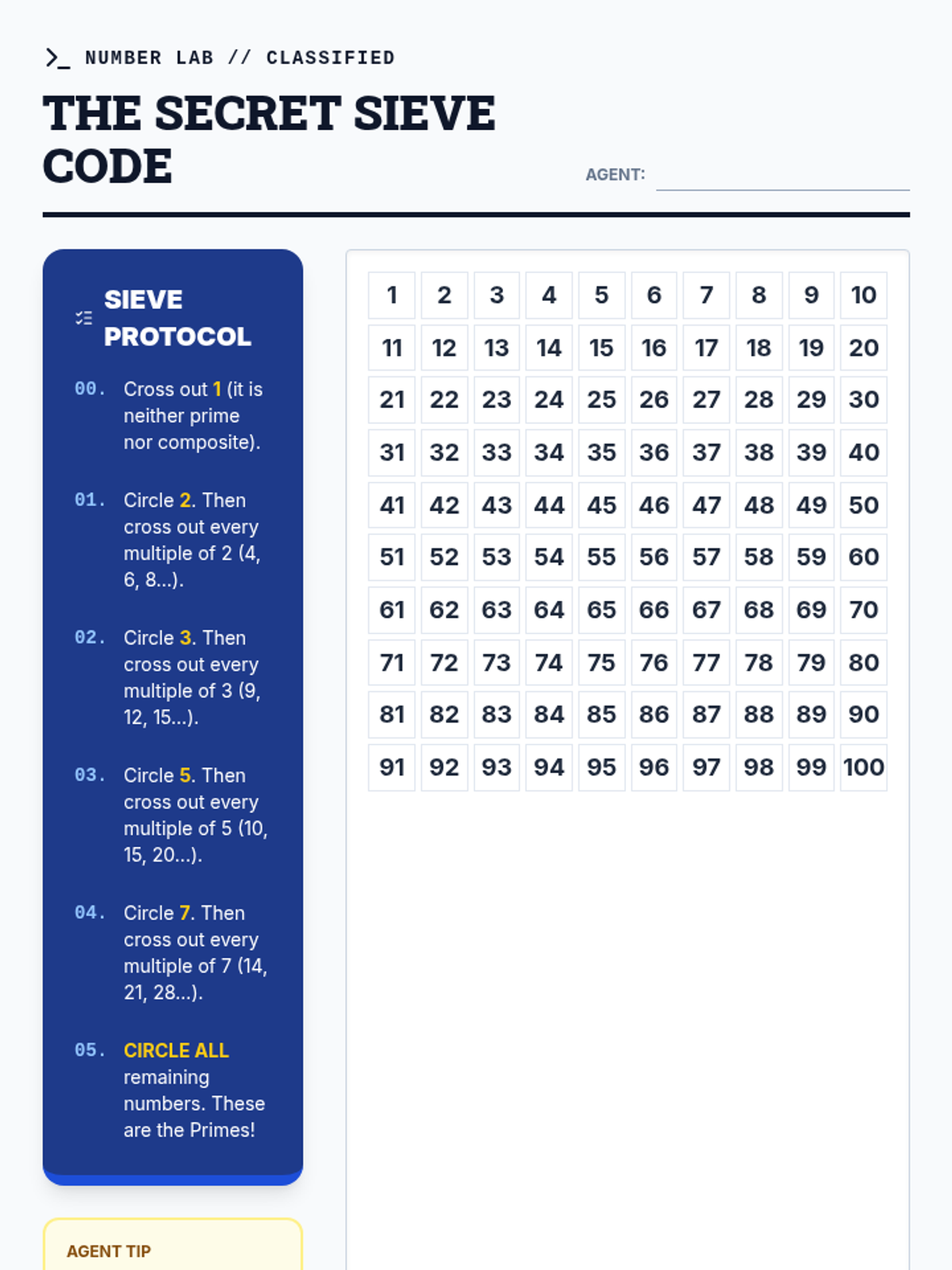 A comprehensive 4th-grade math unit that explores the building blocks of numbers through arrays, prime/composite classification, multiples, and the historic Sieve of Eratosthenes. Students transition from concrete models to abstract number patterns.