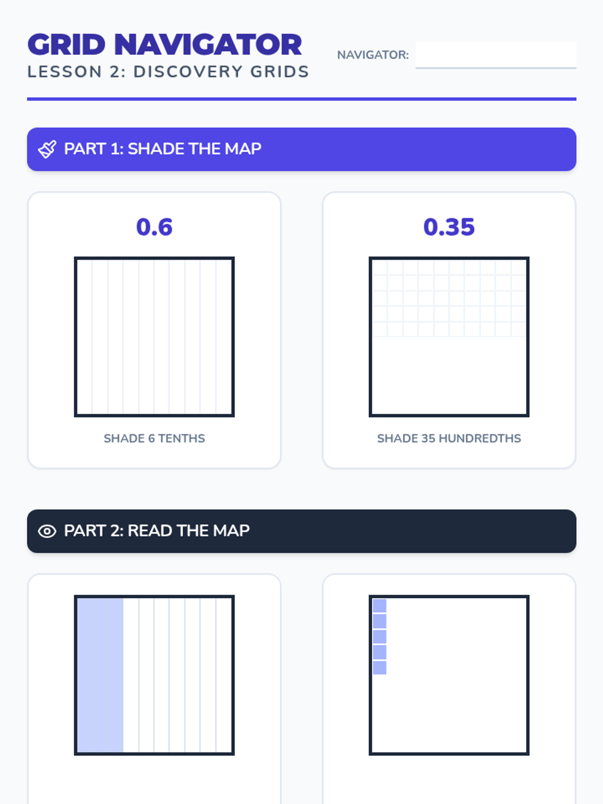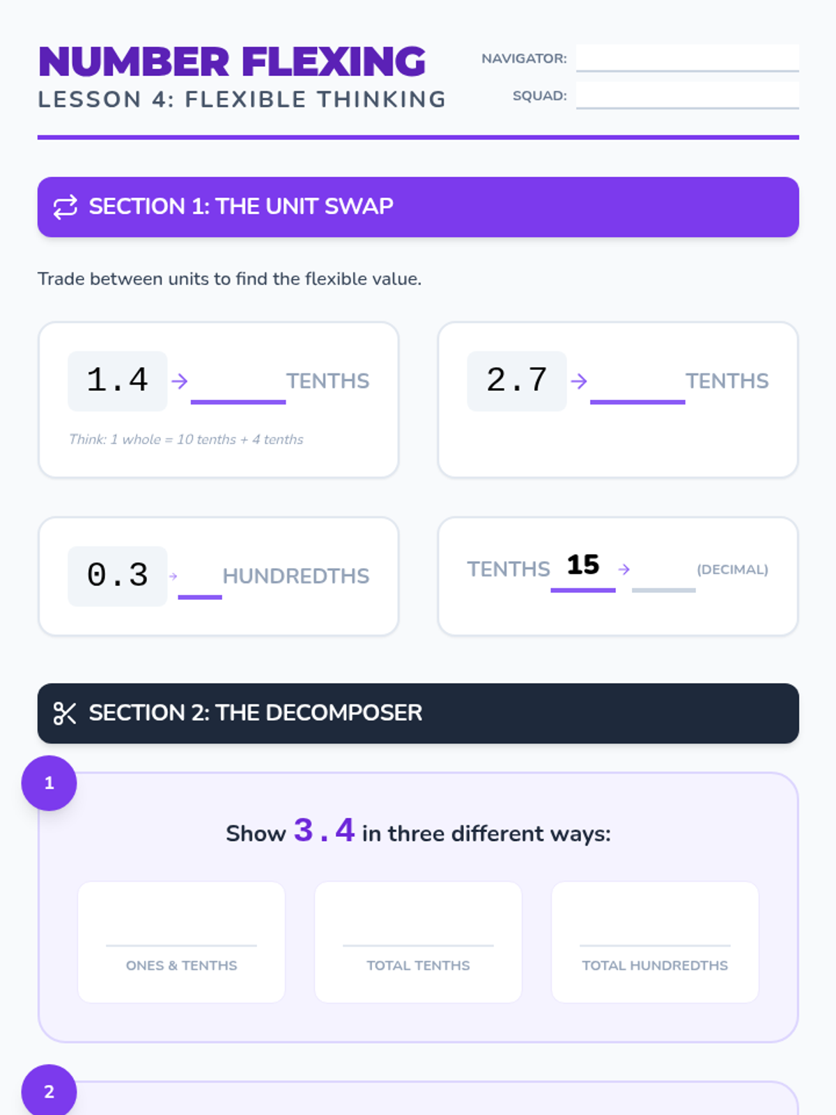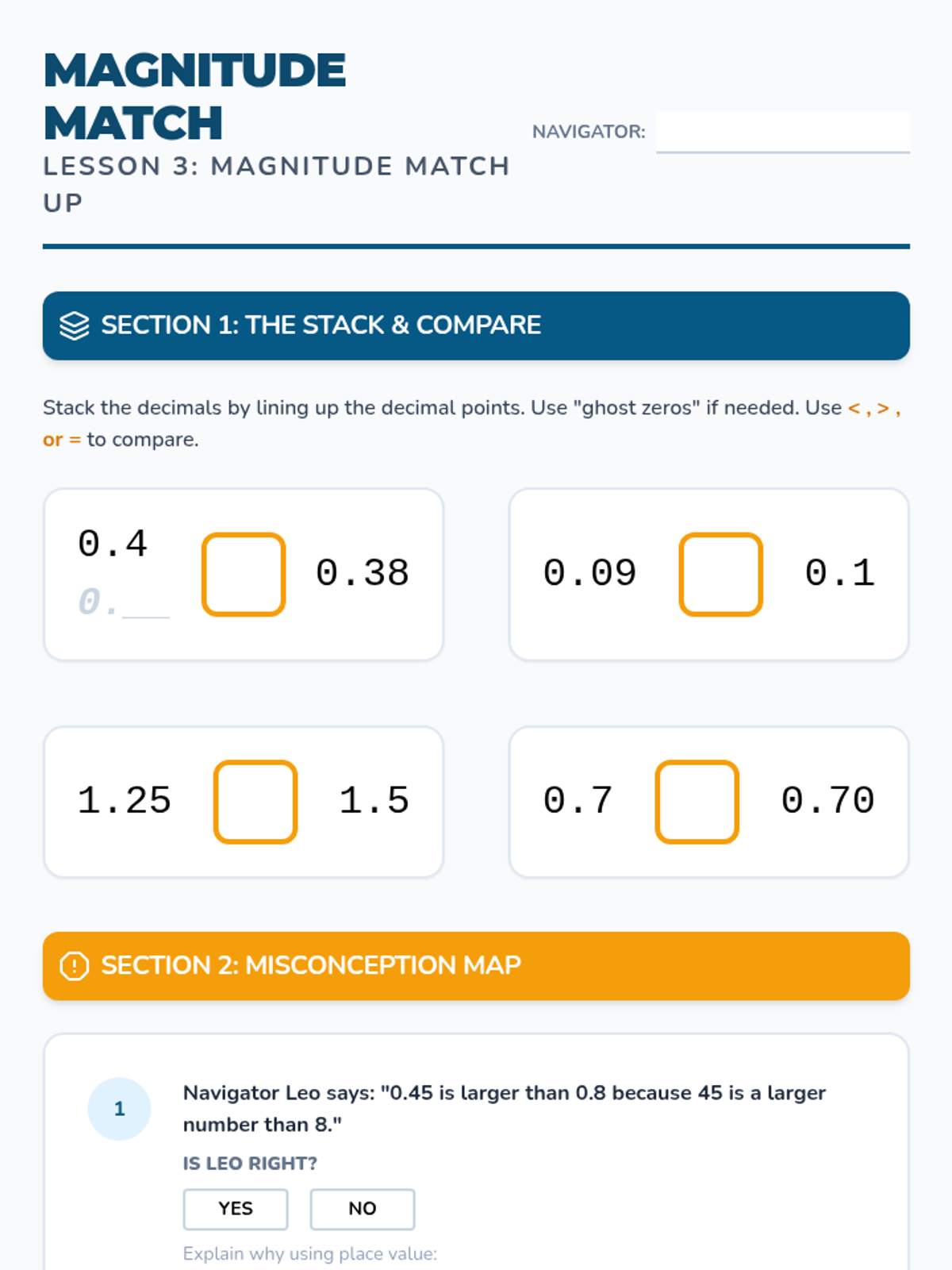 A 12-lesson intervention sequence focused on building flexible thinking with place value and fractions for 6th-grade students performing at 4th-6th grade levels. The sequence uses a 'Number Navigators' theme to explore decimal relationships, fractional equivalence, and the bridge between the two.