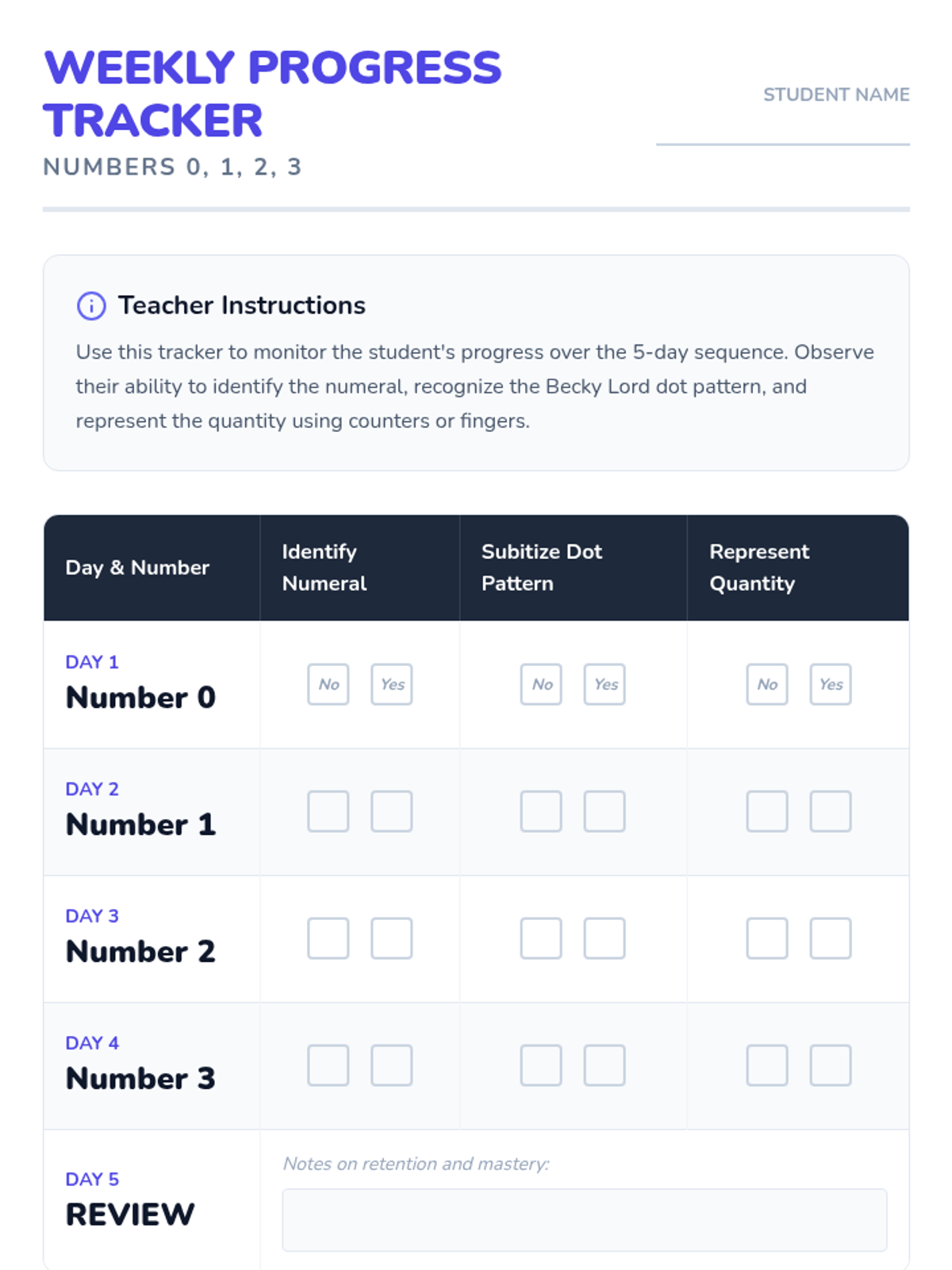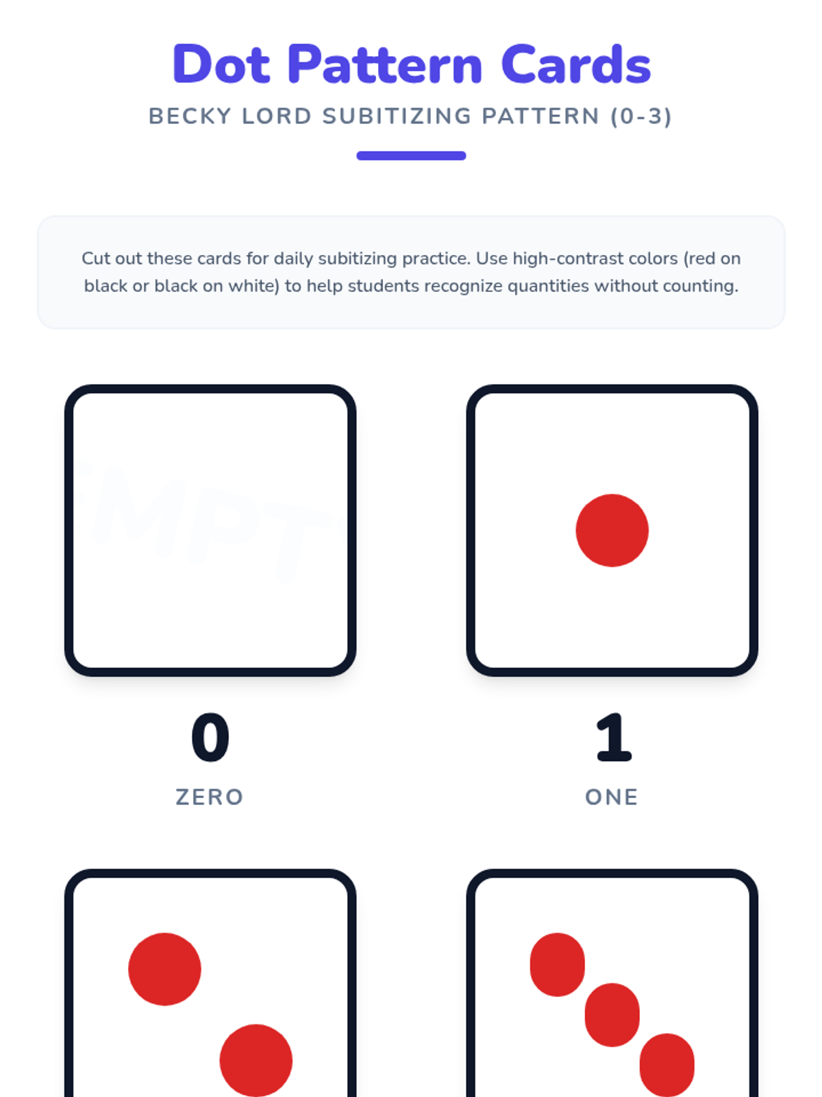 A 5-day introductory math sequence for multilingual kindergarteners focusing on numbers 0, 1, 2, and 3 using subitizing dot patterns, visual aids, and hands-on coloring activities.