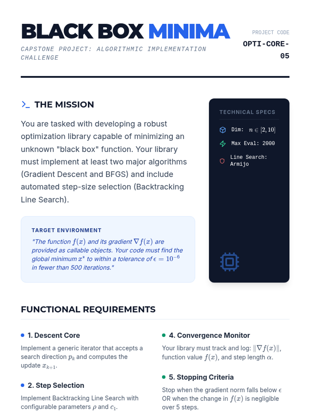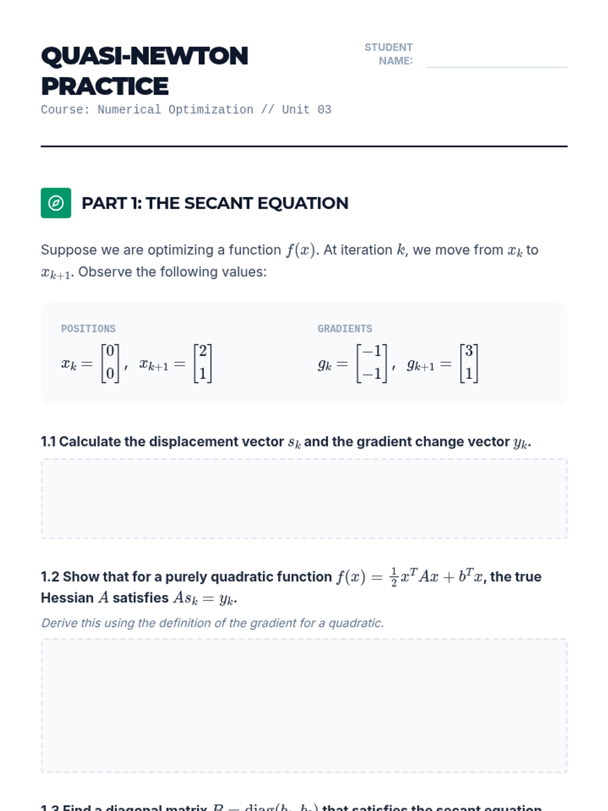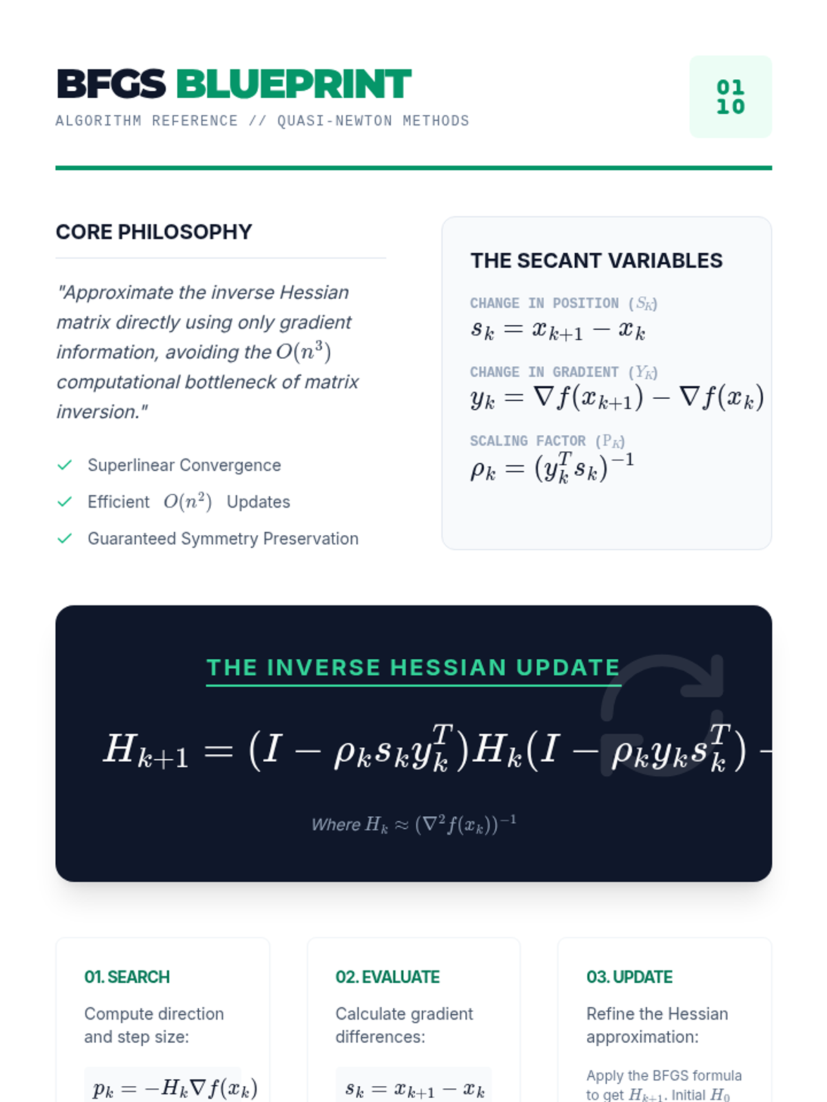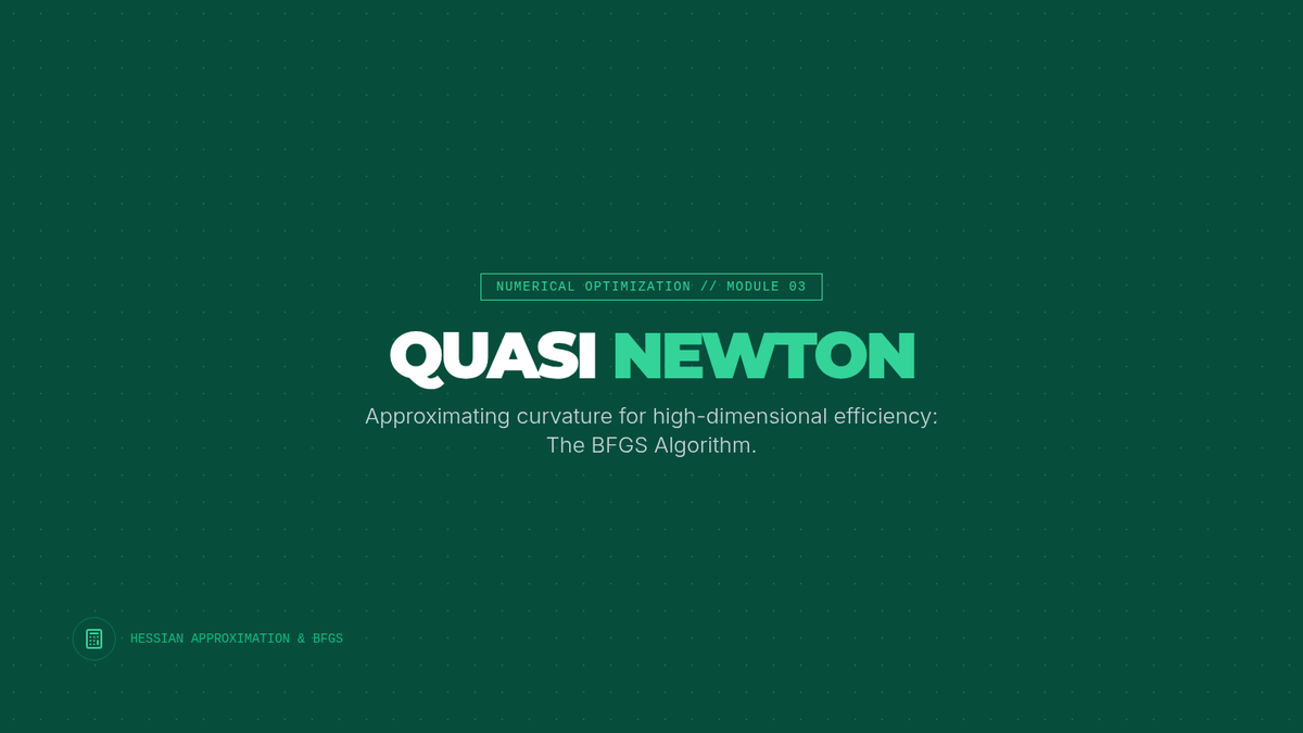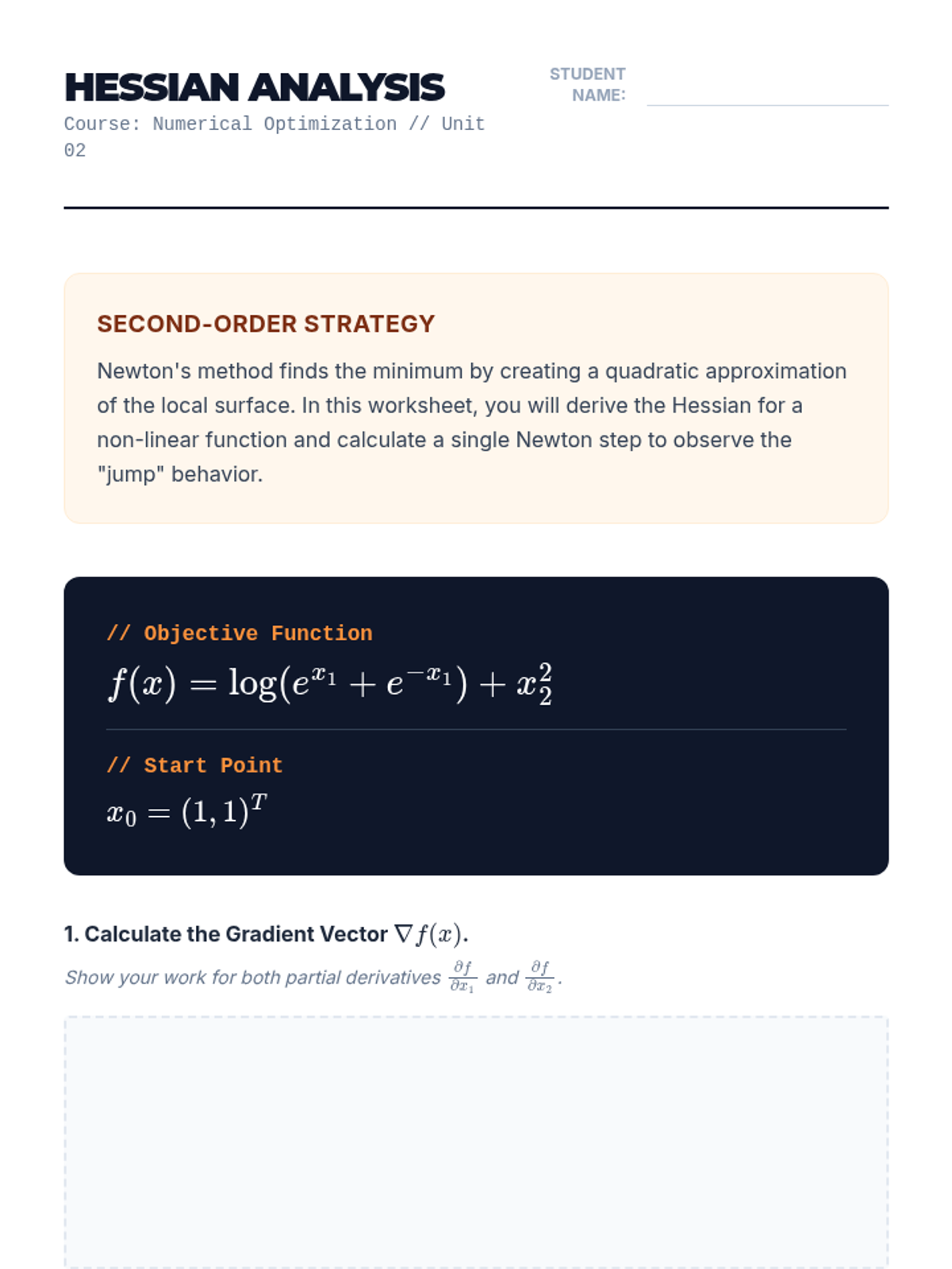 A comprehensive graduate-level exploration of numerical optimization algorithms, moving from first-order gradient descent to second-order Newton methods and computationally efficient Quasi-Newton approaches. Students analyze convergence rates, stability, and strategies for navigating complex, non-convex landscapes.