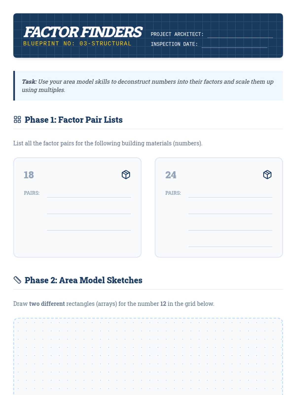 A 6-week comprehensive practice program focusing on 6+ digit addition and subtraction. Includes weekly homework assignments with increasing complexity and a final summative assessment, all featuring an architectural blueprint theme to emphasize precision and structure.