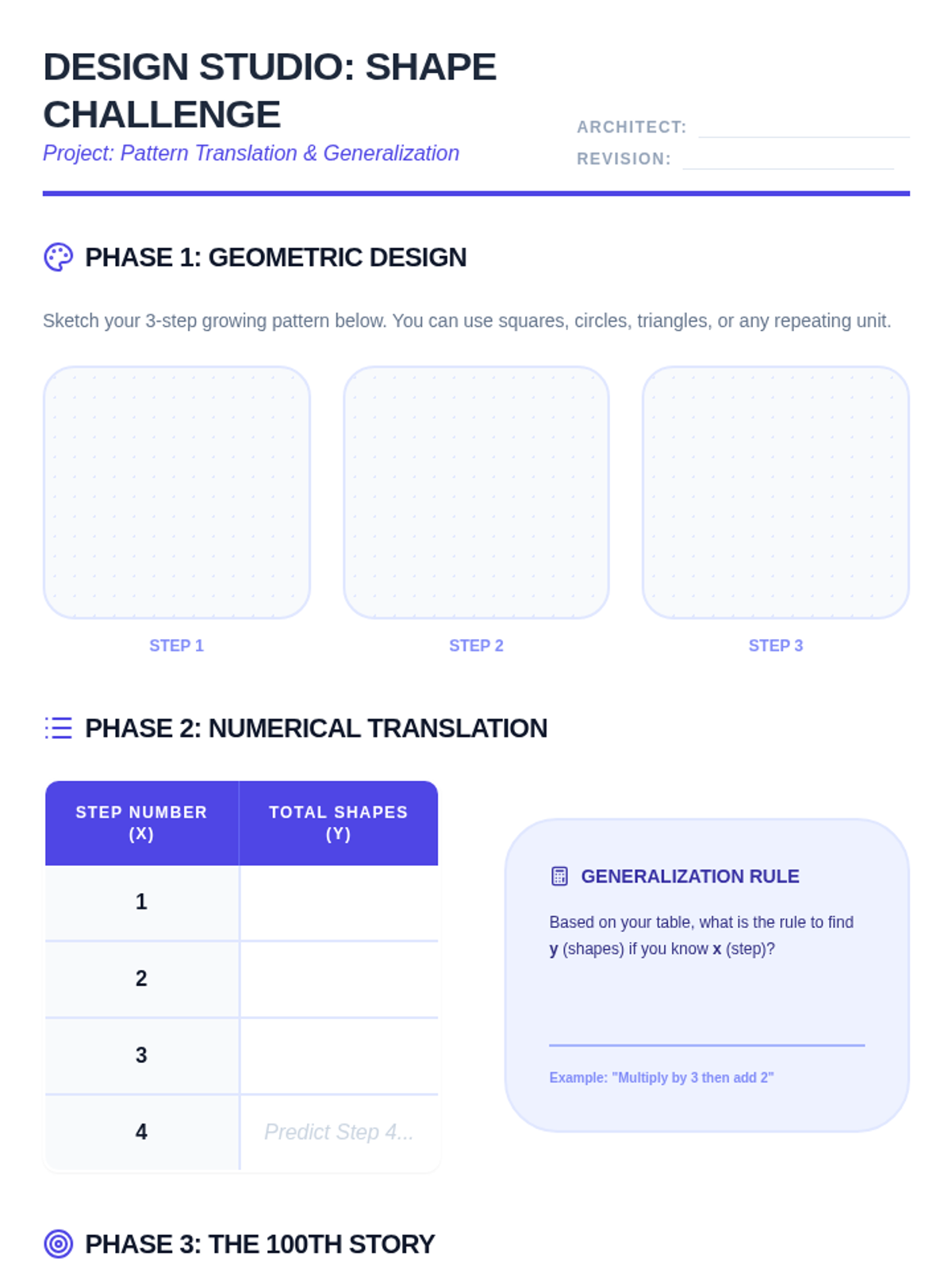 A 4th-grade math sequence exploring numerical patterns, input-output tables, factors, multiples, and prime/composite numbers to build algebraic thinking.