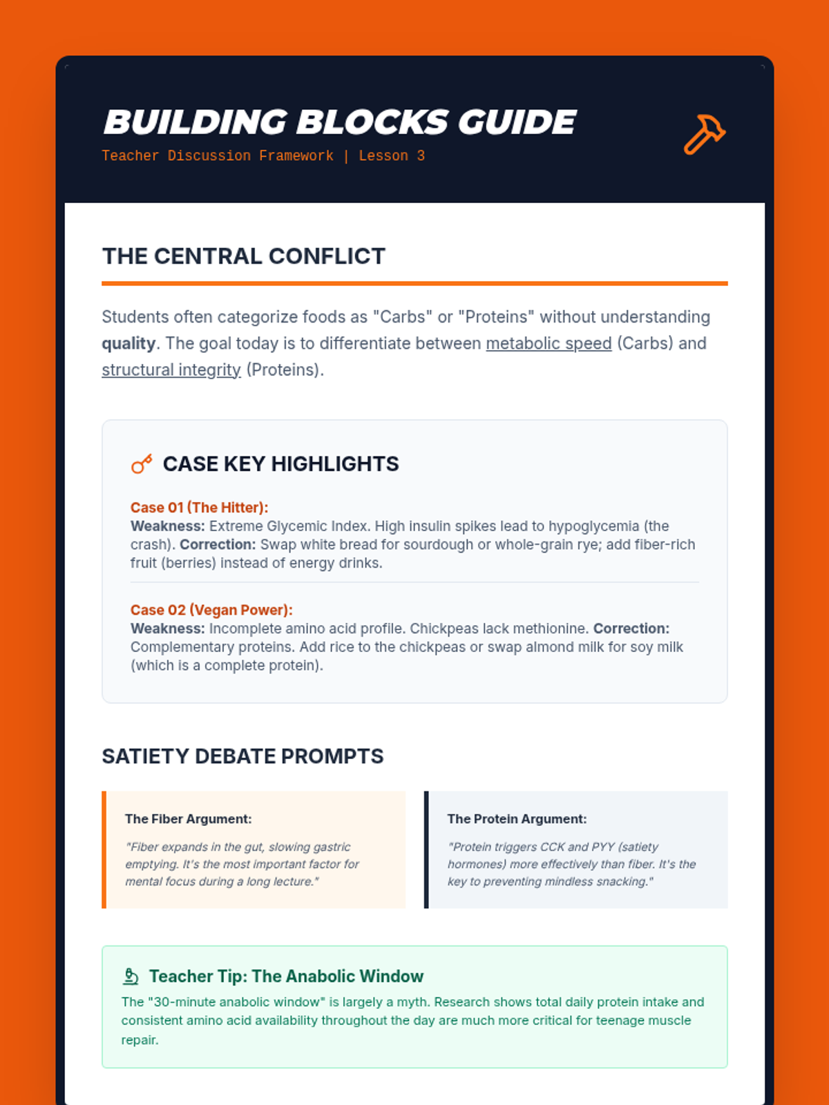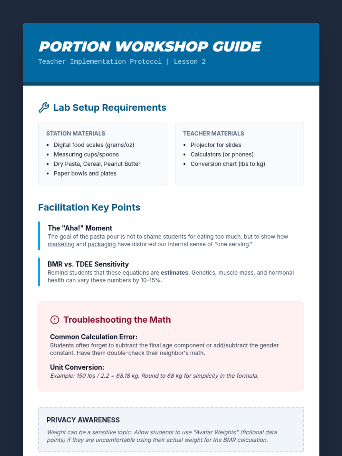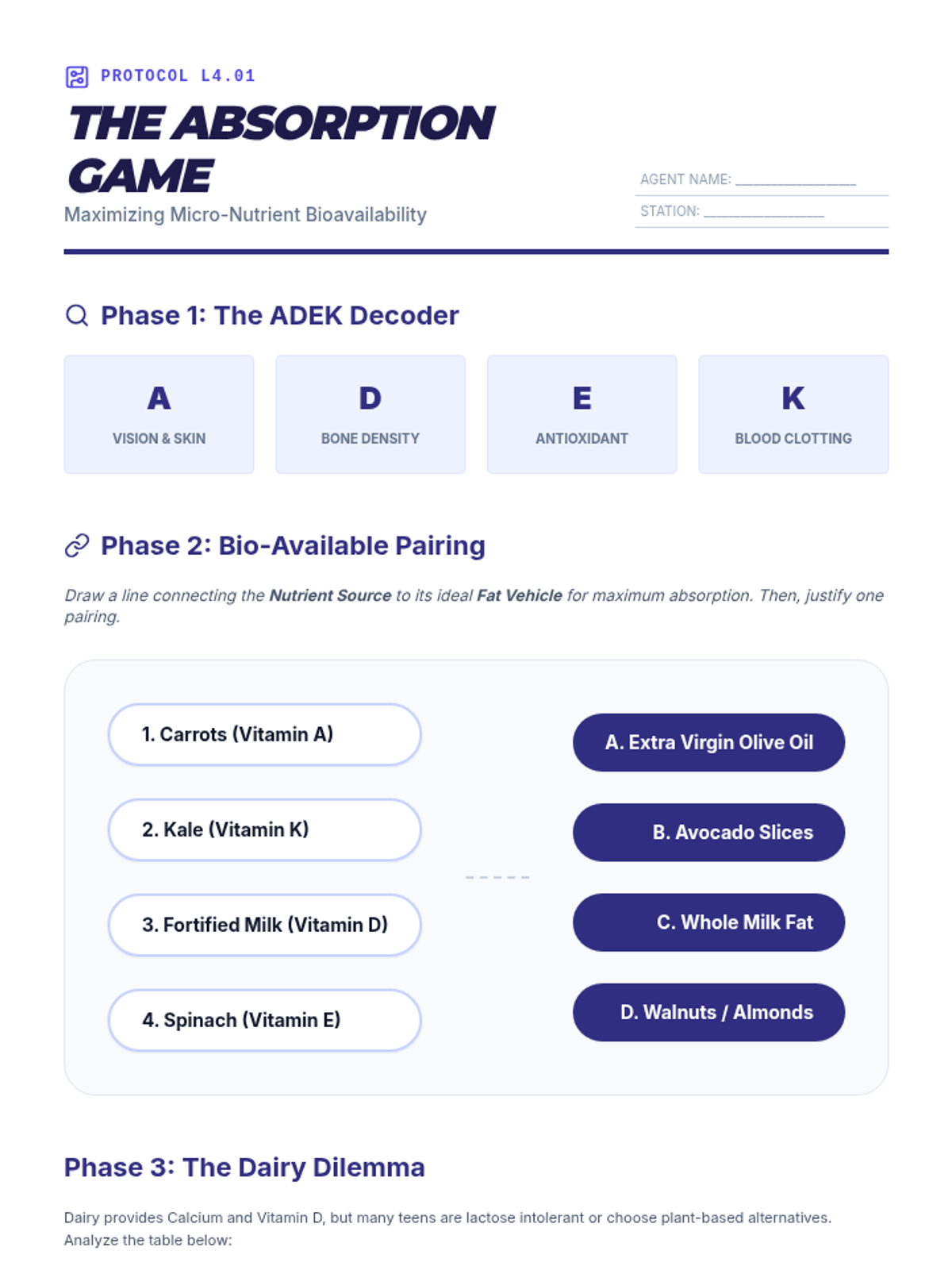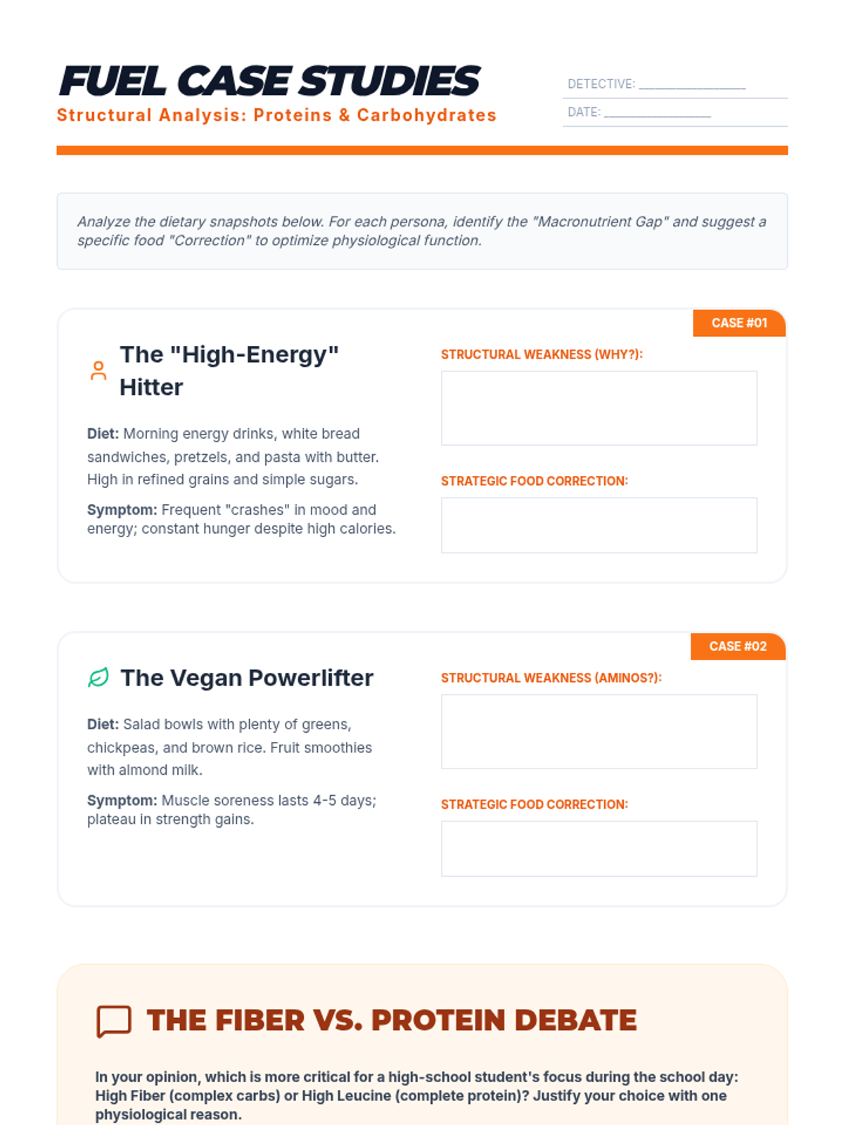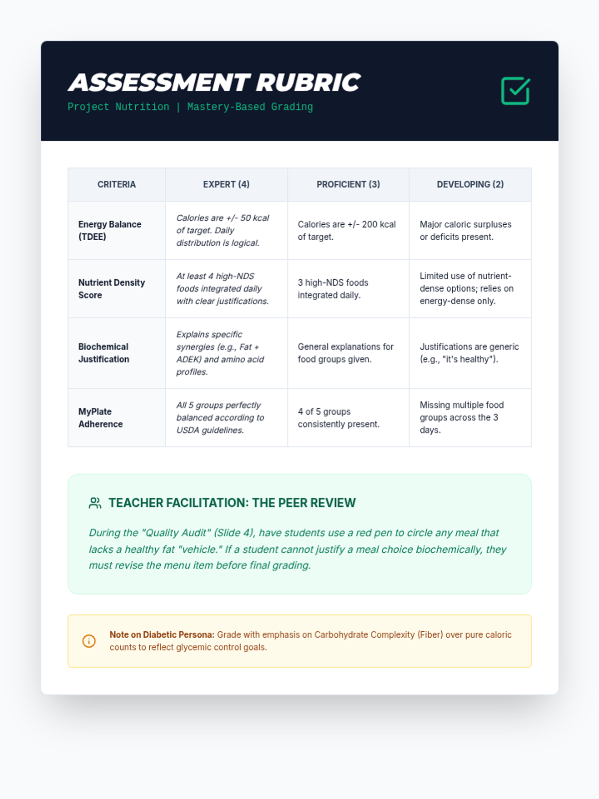 A comprehensive 10th-grade nutrition unit that transitions students from food identification to sophisticated biochemical analysis of nutrient density, caloric needs, and physiological optimization through meal planning.