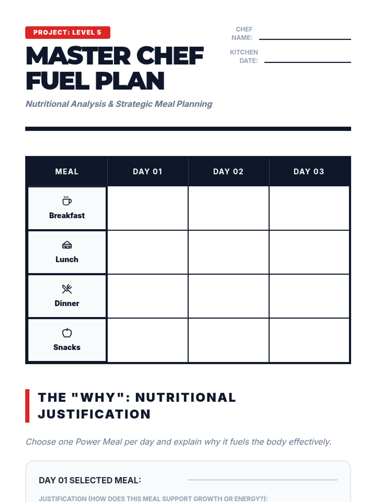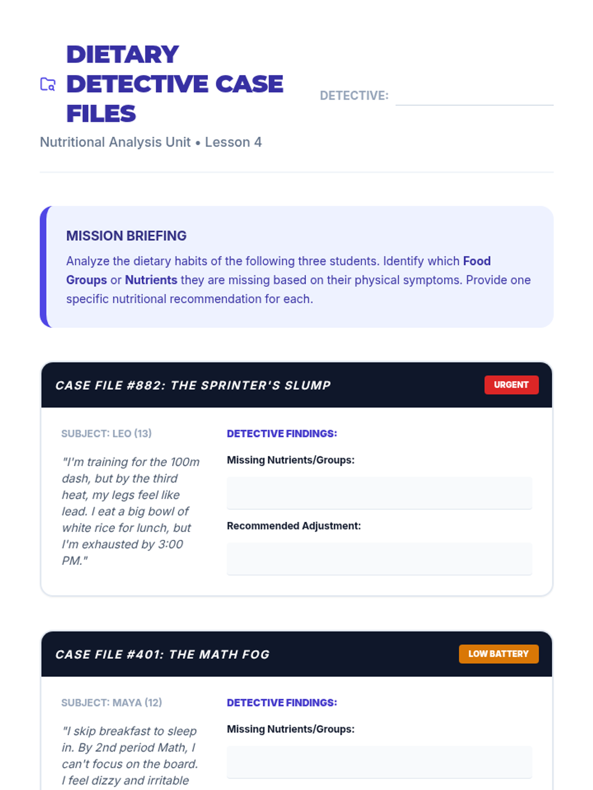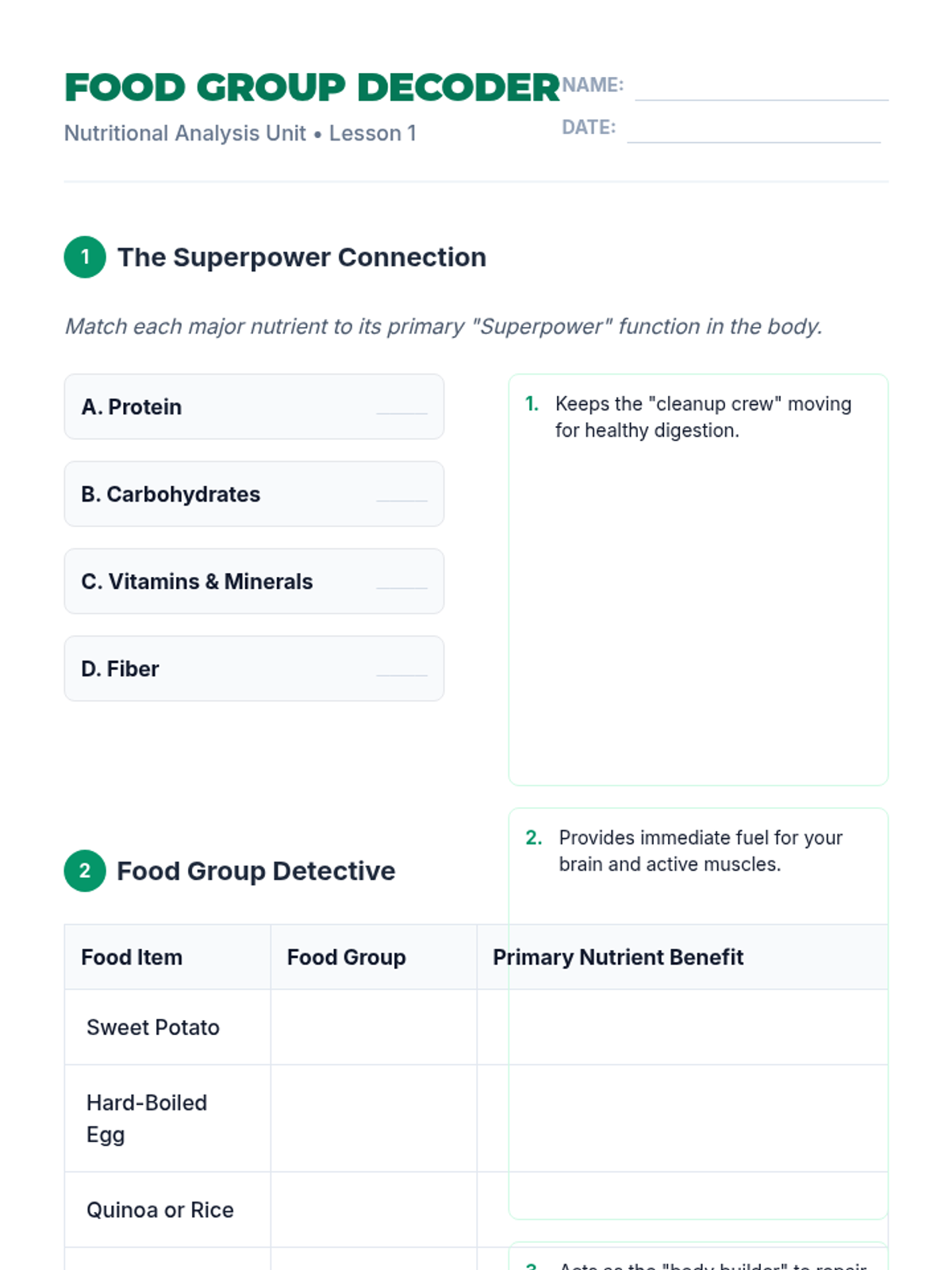 This sequence guides students through an in-depth exploration of the five major food groups and their specific physiological benefits for the adolescent body. Students progress from identifying food classifications to analyzing food labels and caloric density, culminating in the creation of a balanced, 3-day meal plan tailored to specific energy needs.