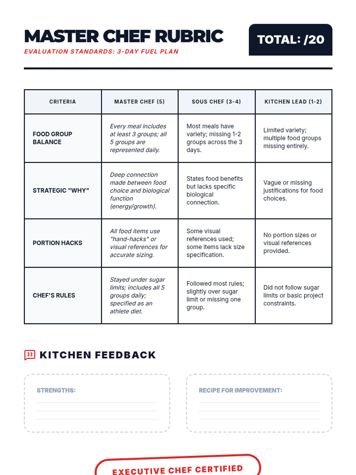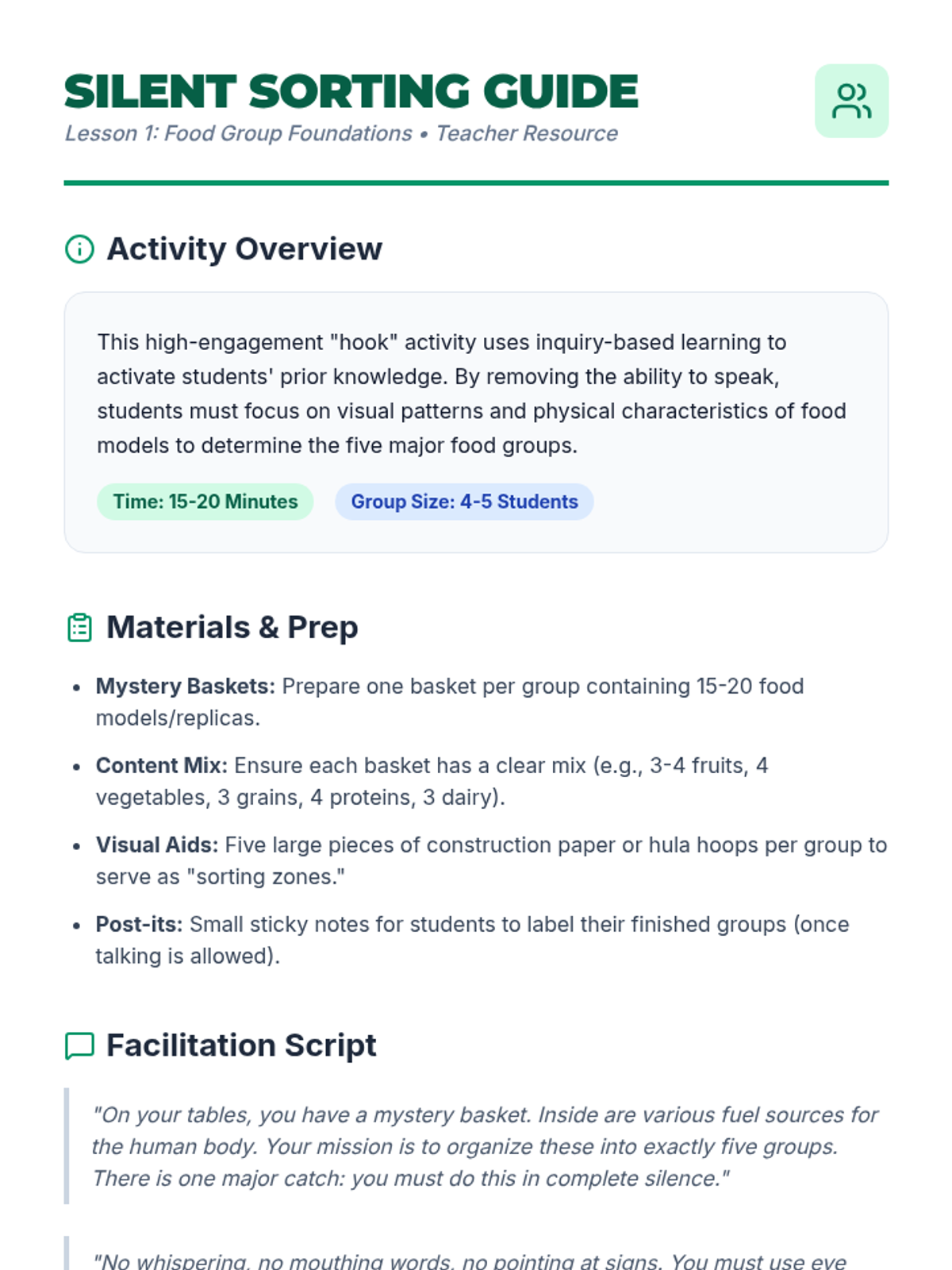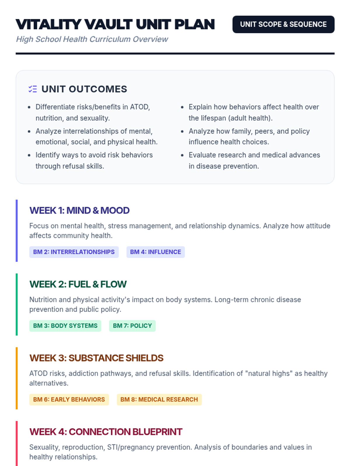 This sequence guides students through an in-depth exploration of the five major food groups and their specific physiological benefits for the adolescent body. Students progress from identifying food classifications to analyzing food labels and caloric density, culminating in the creation of a balanced, 3-day meal plan tailored to specific energy needs.