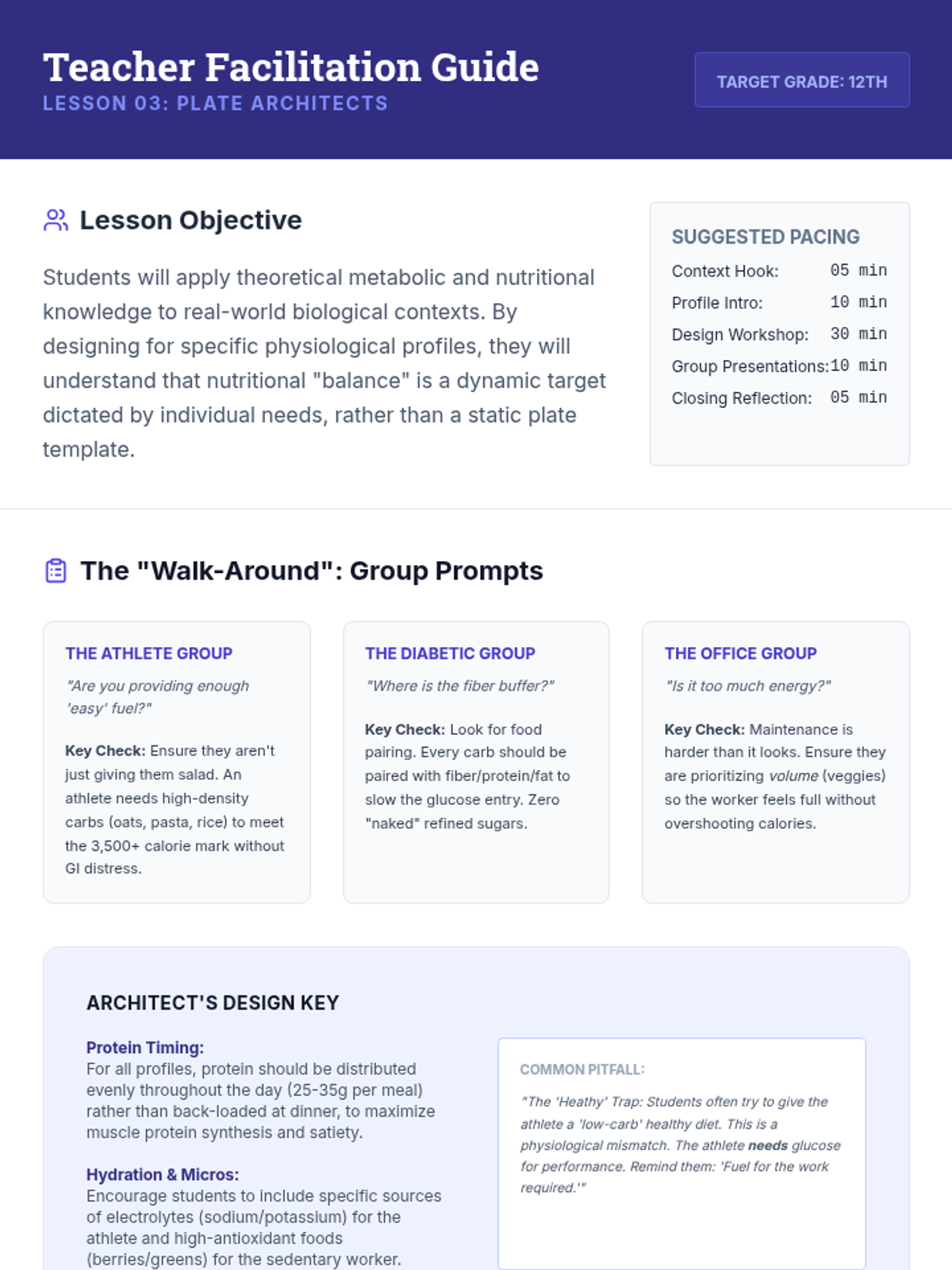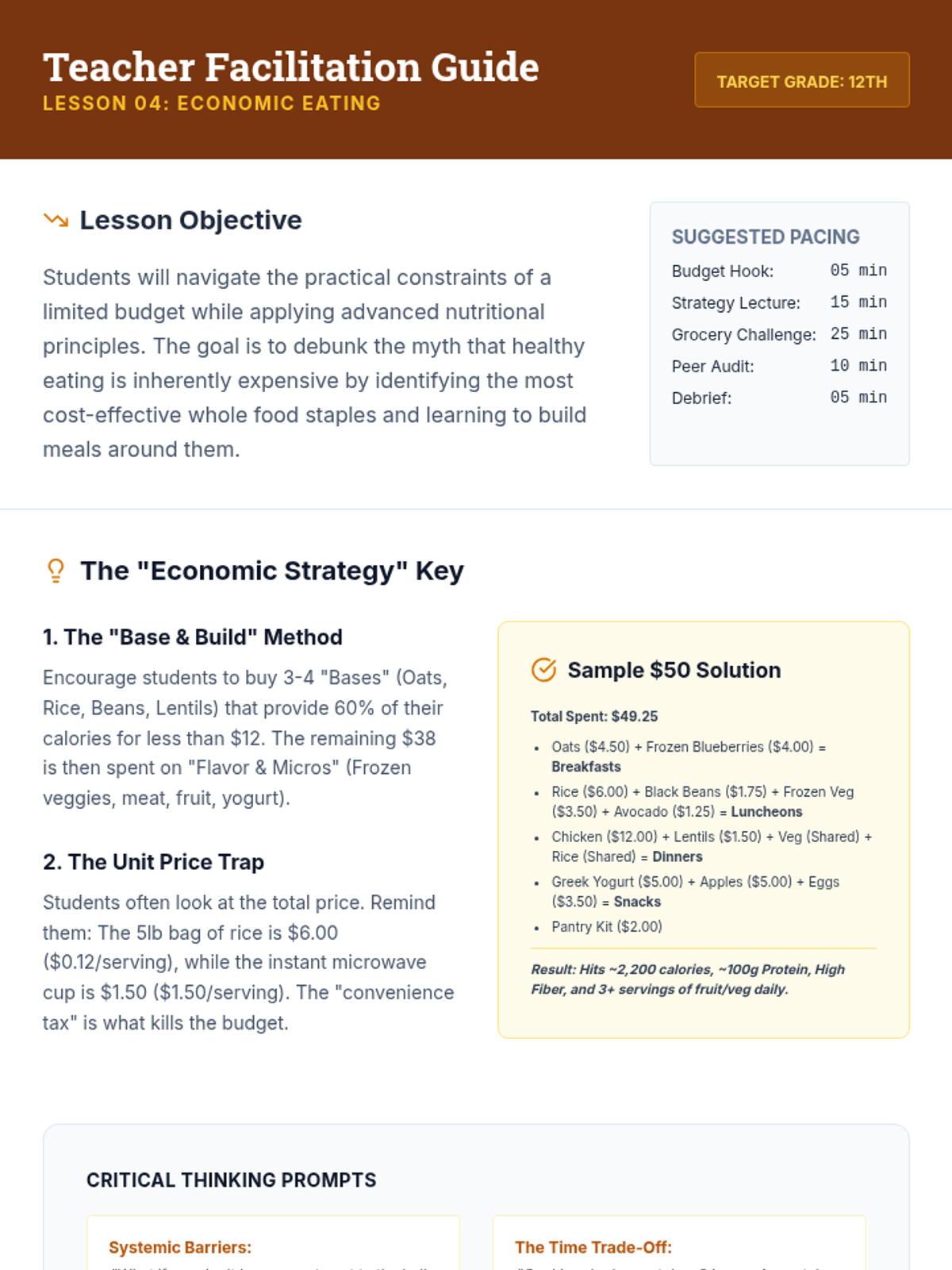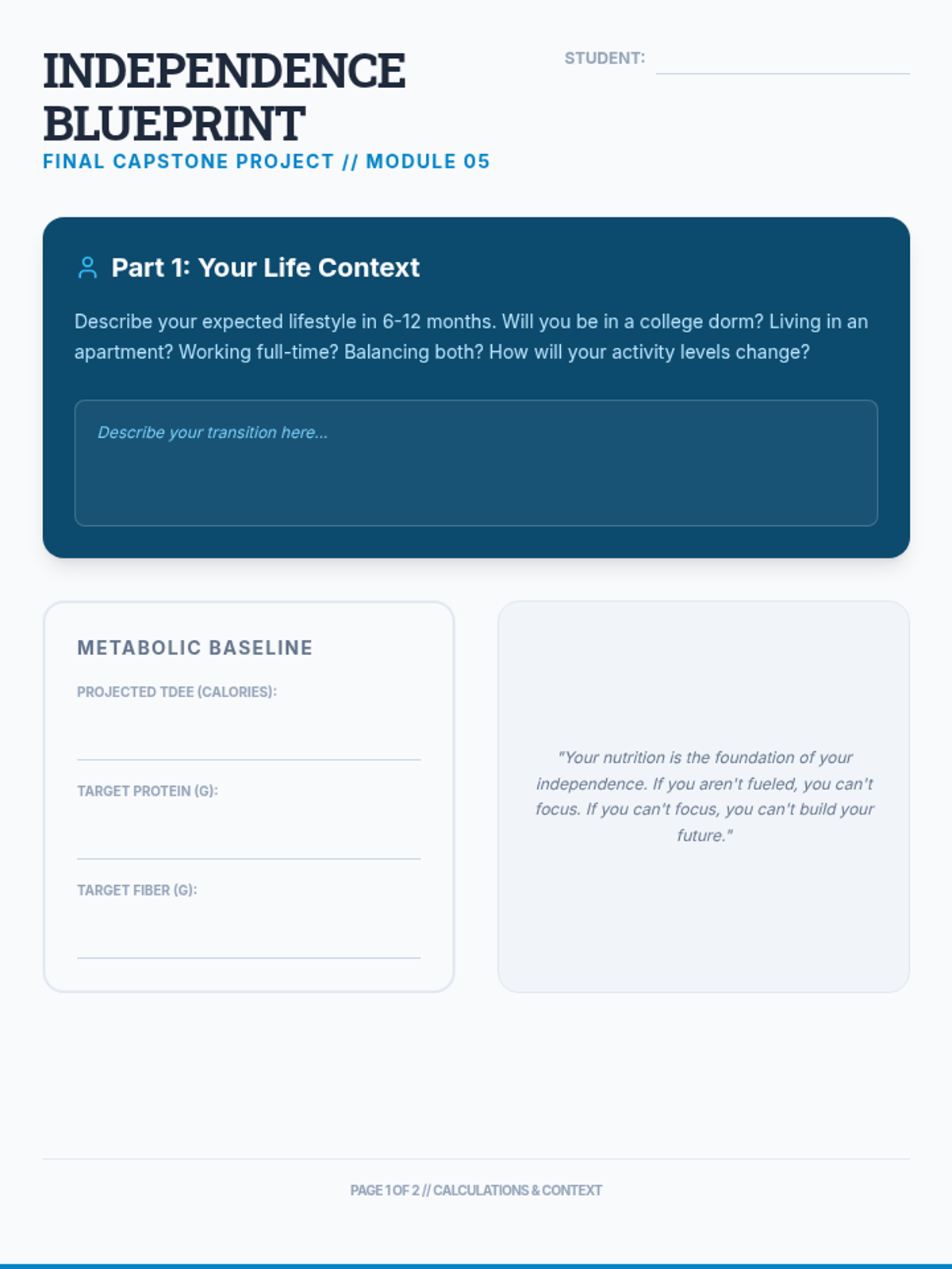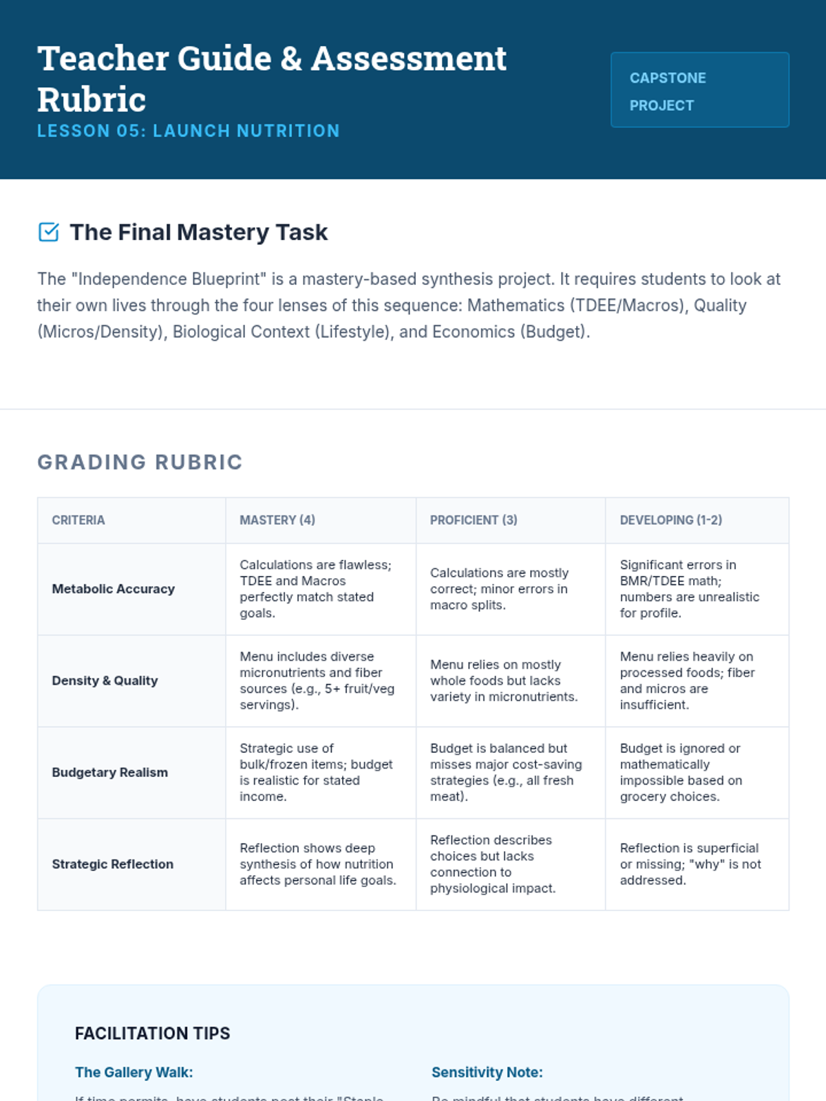 A comprehensive nutrition sequence for 12th-grade students focusing on the transition to independent living. Students move from metabolic calculations to practical meal planning for specific health needs and budget constraints.