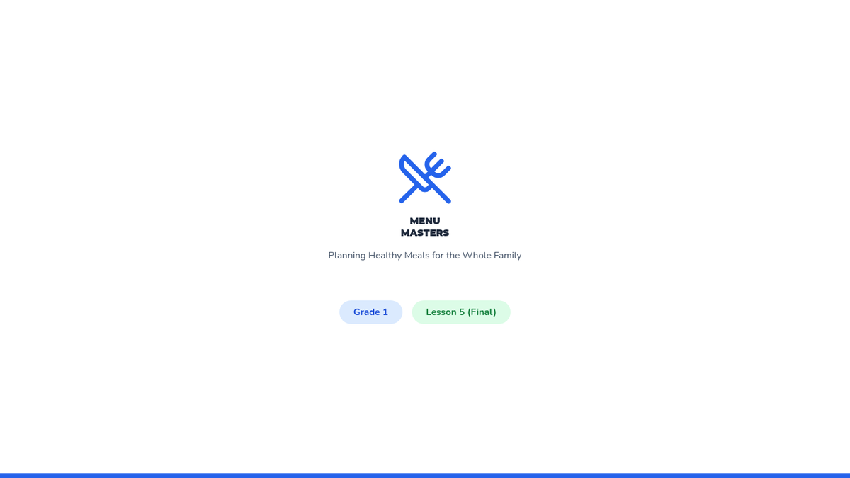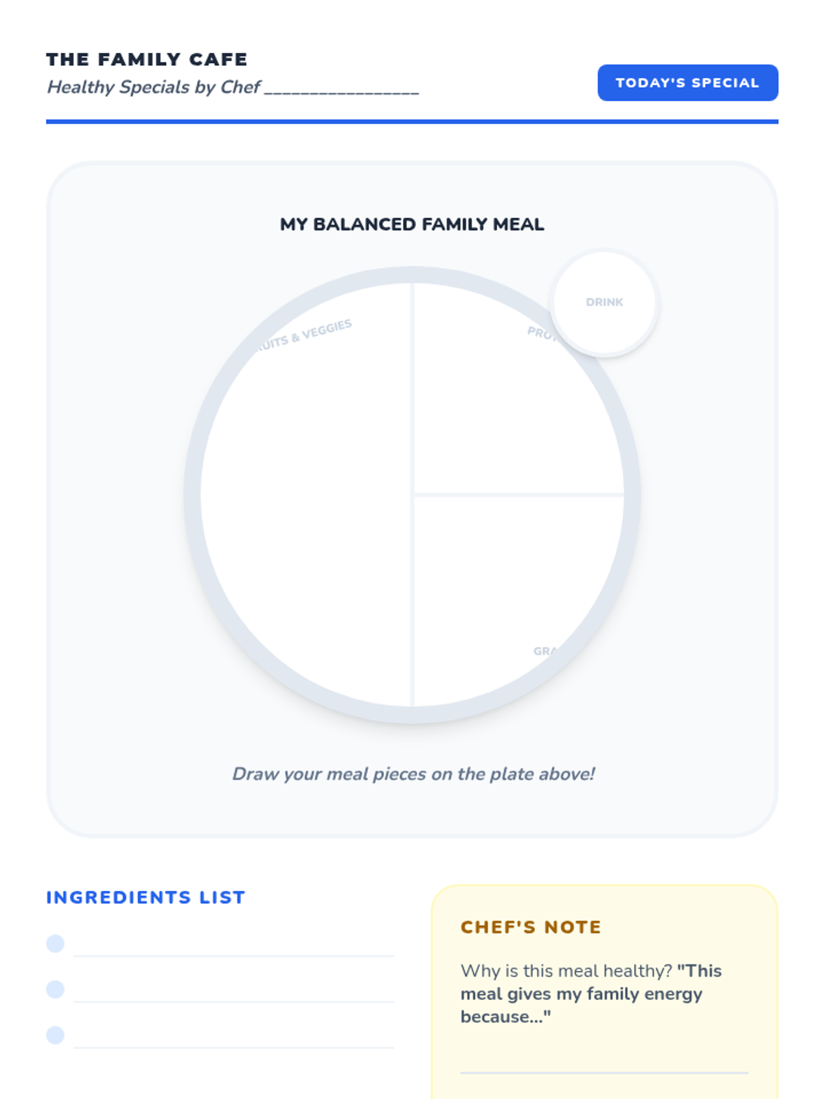 A 5-lesson sequence for 1st-grade students focusing on practical decision-making for healthy eating. Students move from understanding breakfast balance to simulating lunchbox packing, grocery shopping, recognizing body cues, and finally planning a full family menu.