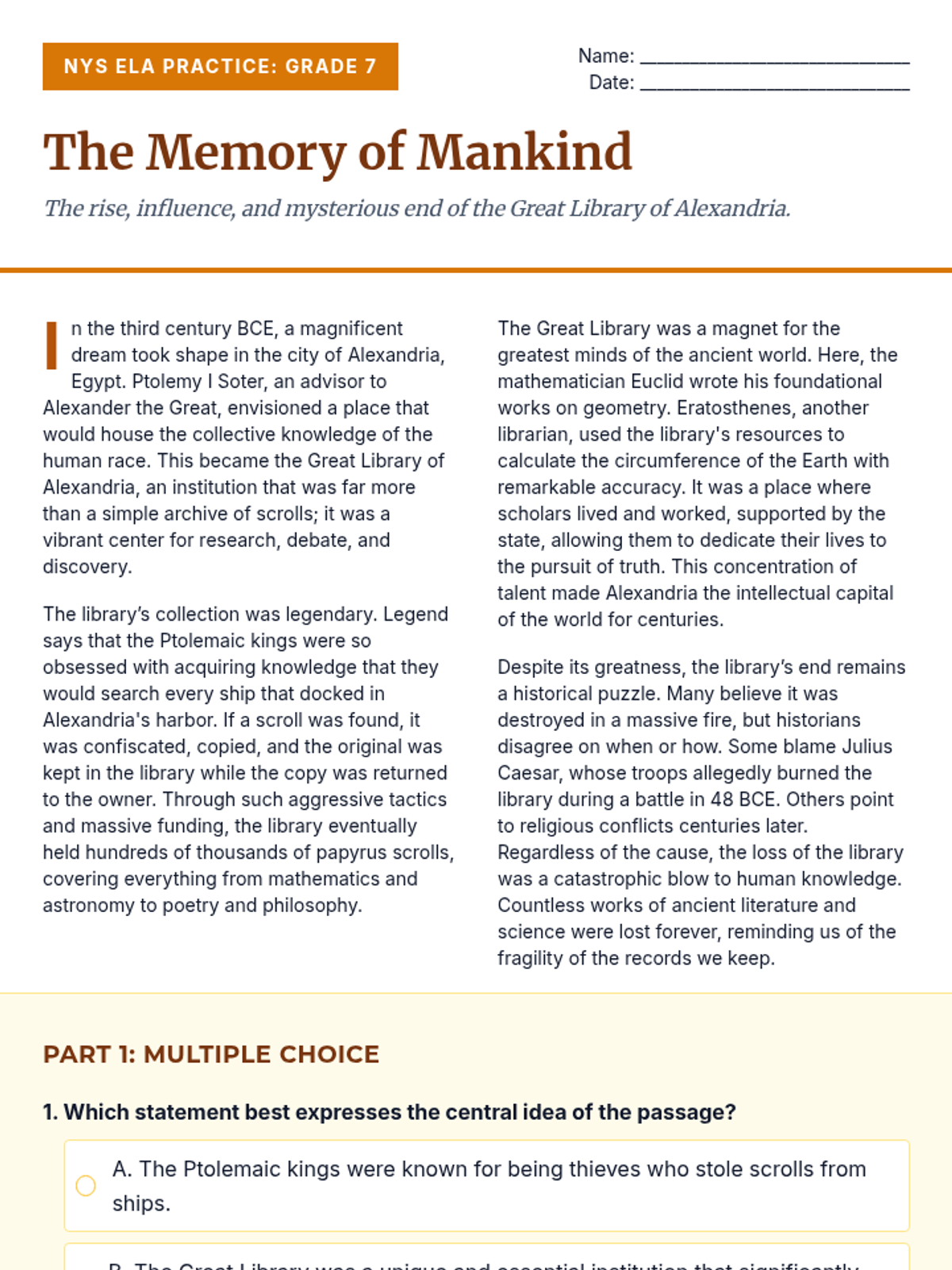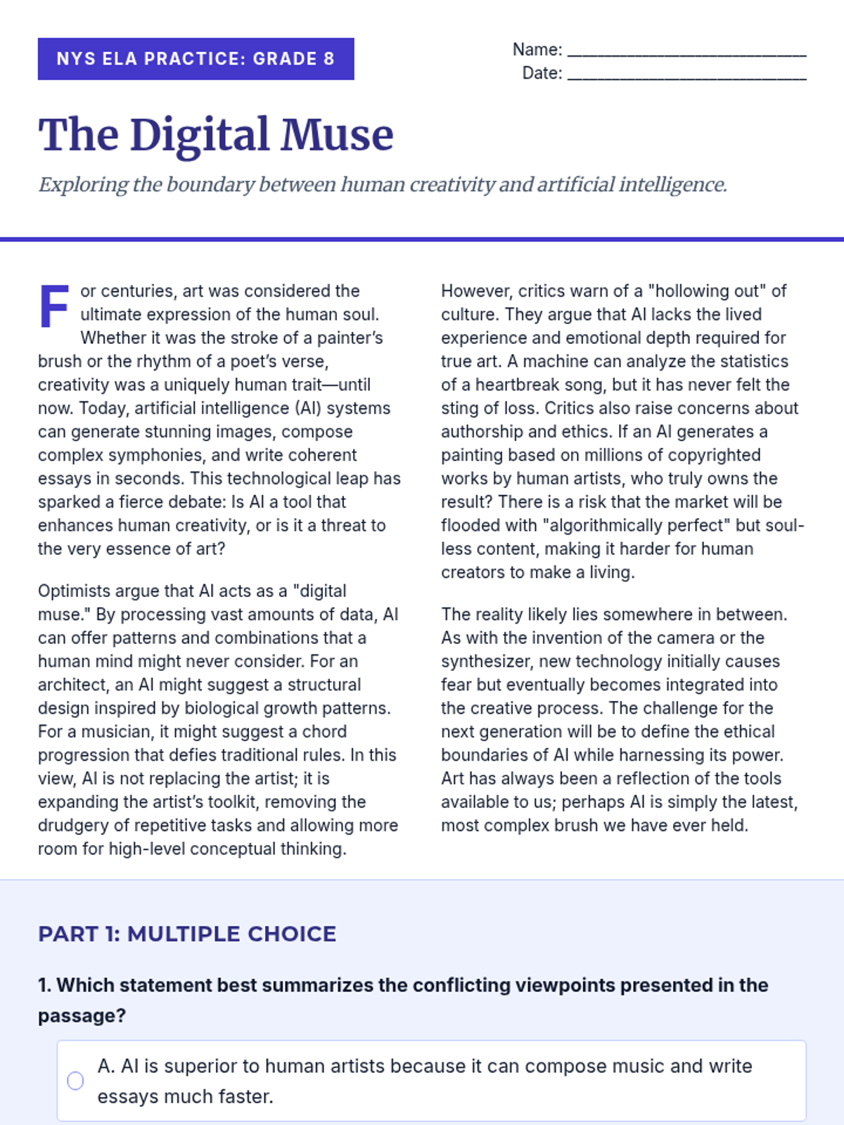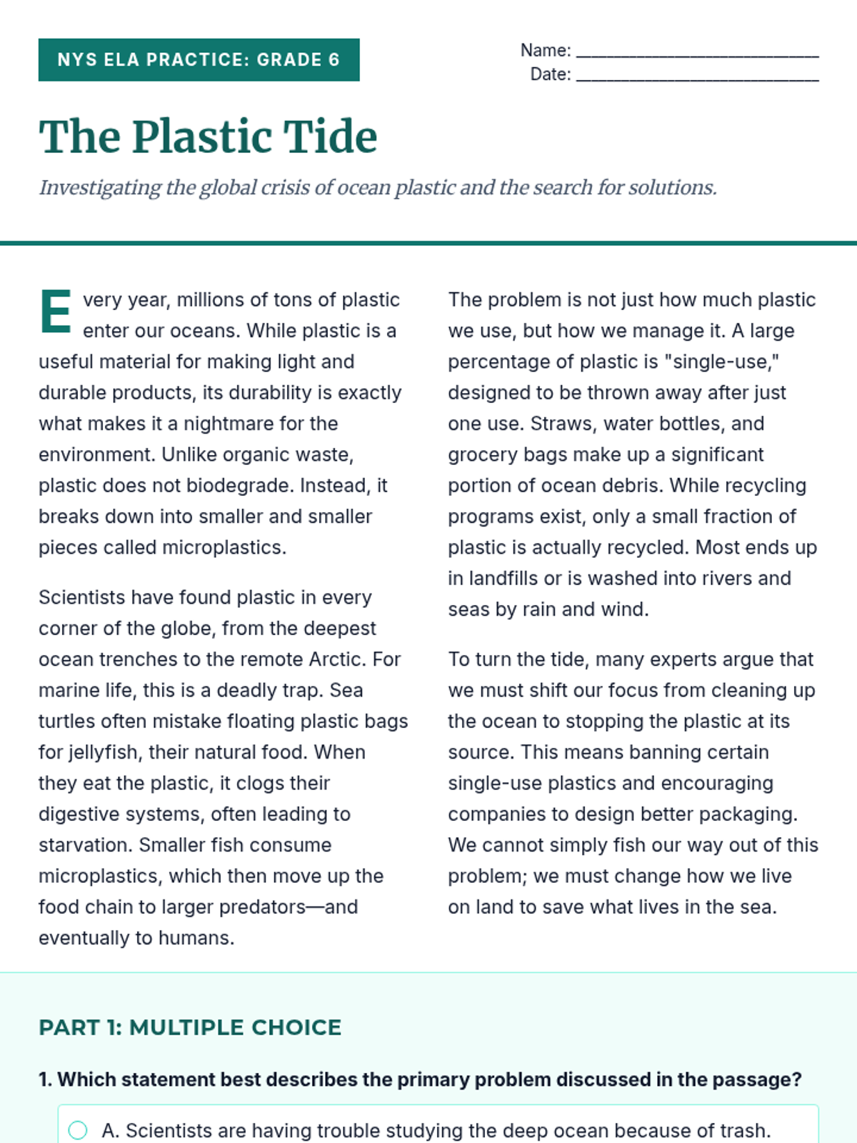 A comprehensive NYS ELA test preparation sequence for middle school students (Grades 5-8), focusing on non-fiction reading comprehension, text-dependent analysis, and evidence-based writing. Each lesson targets grade-specific standards and uses NYS-style question stems to build testing stamina and skills.