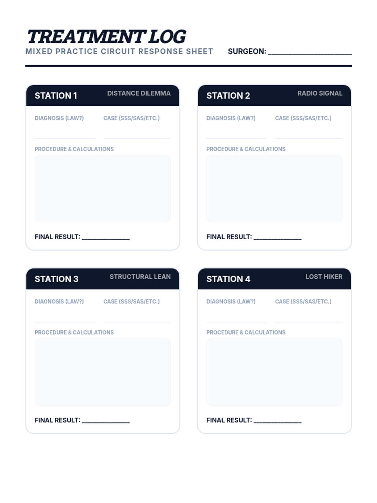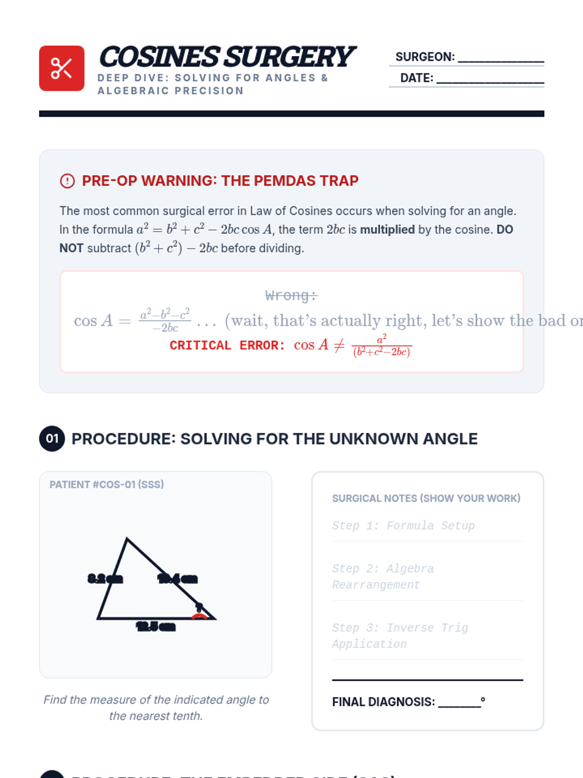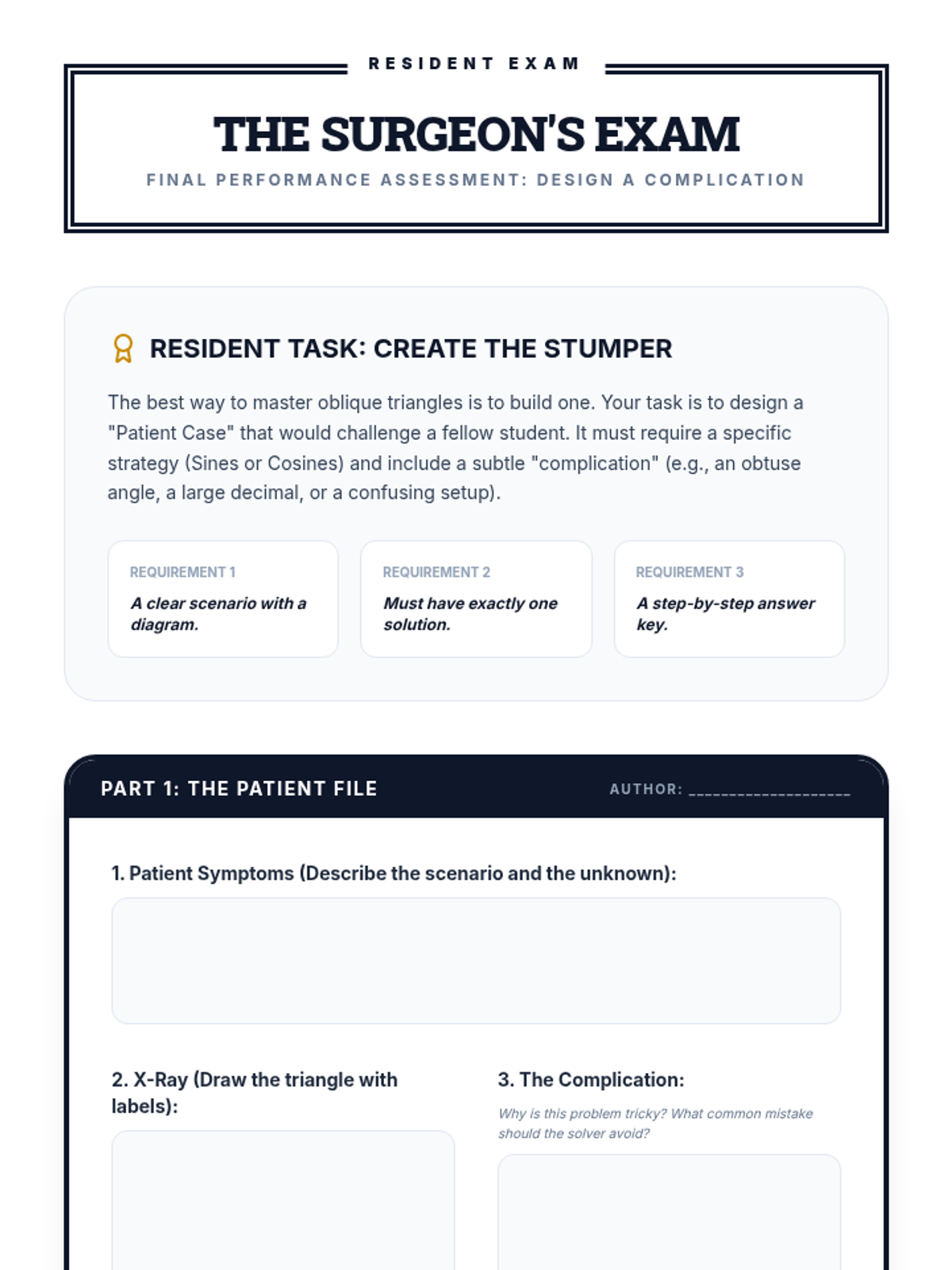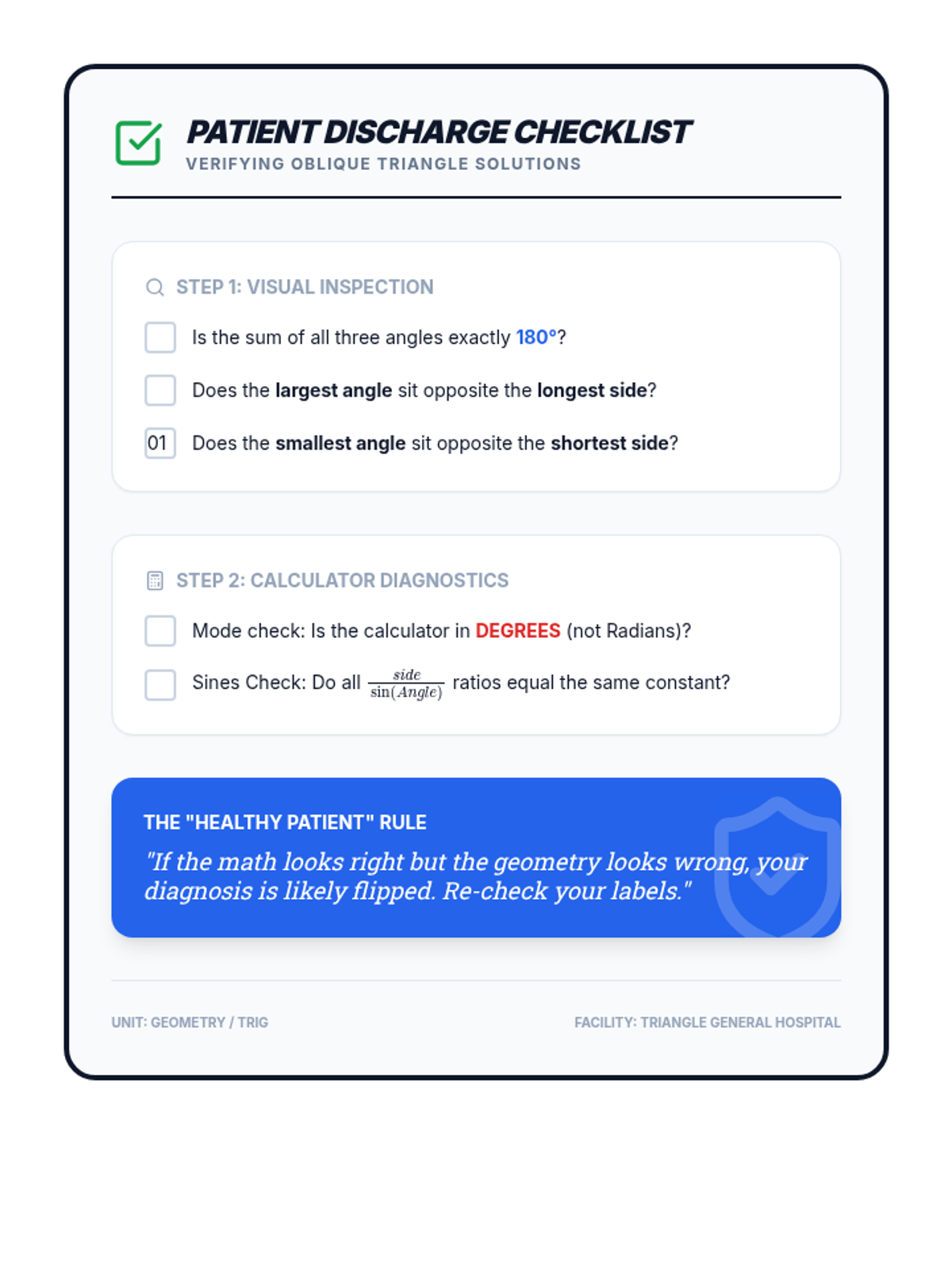 A high-level geometry sequence focused on diagnosing oblique triangles. Students use a medical 'triage' theme to master Law of Sines and Law of Cosines through pattern recognition, algebraic mastery, and mixed practice.